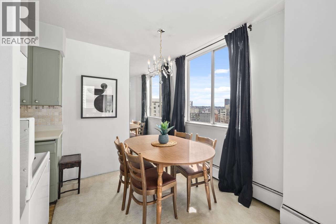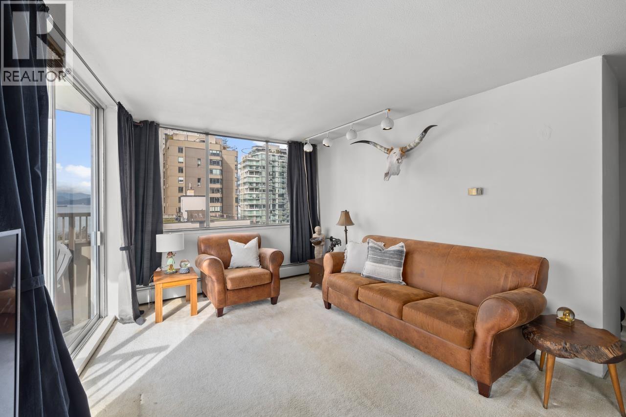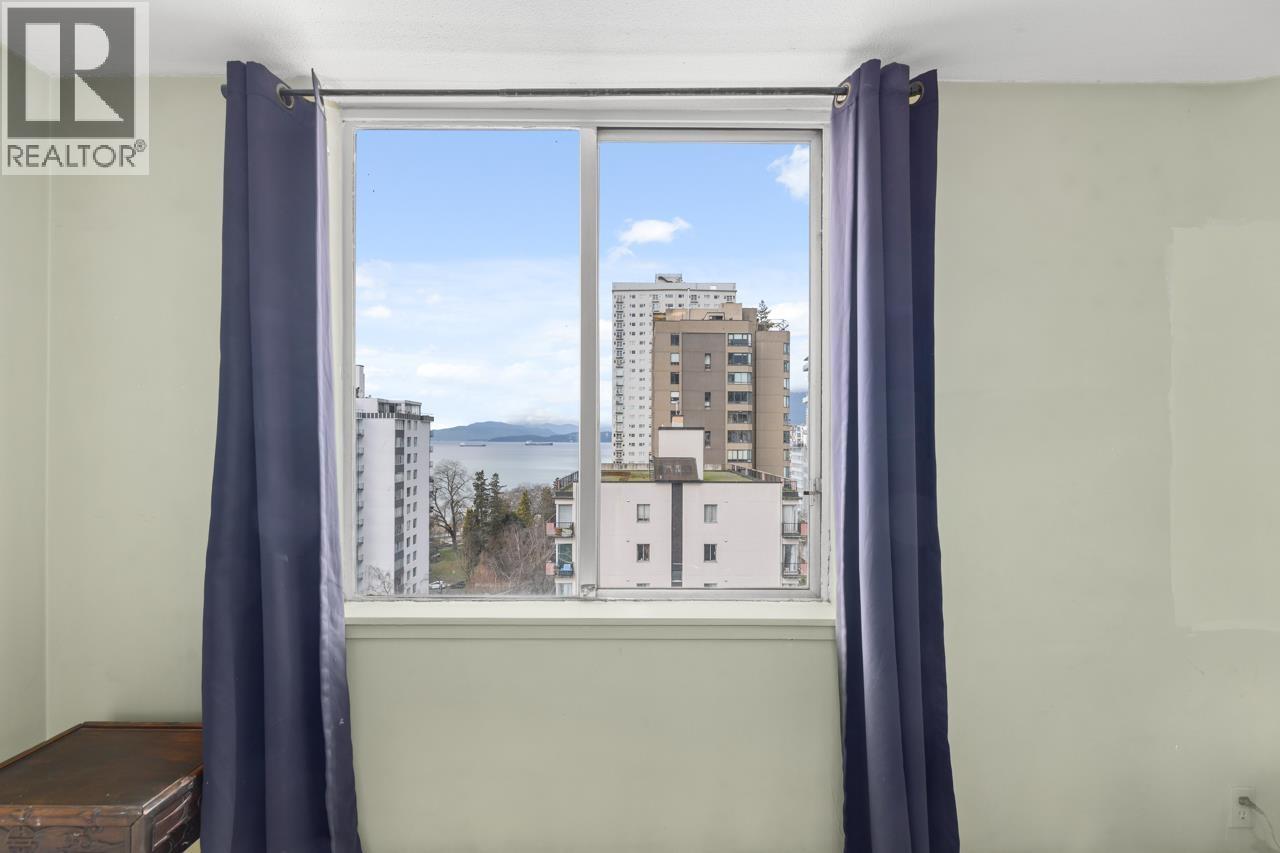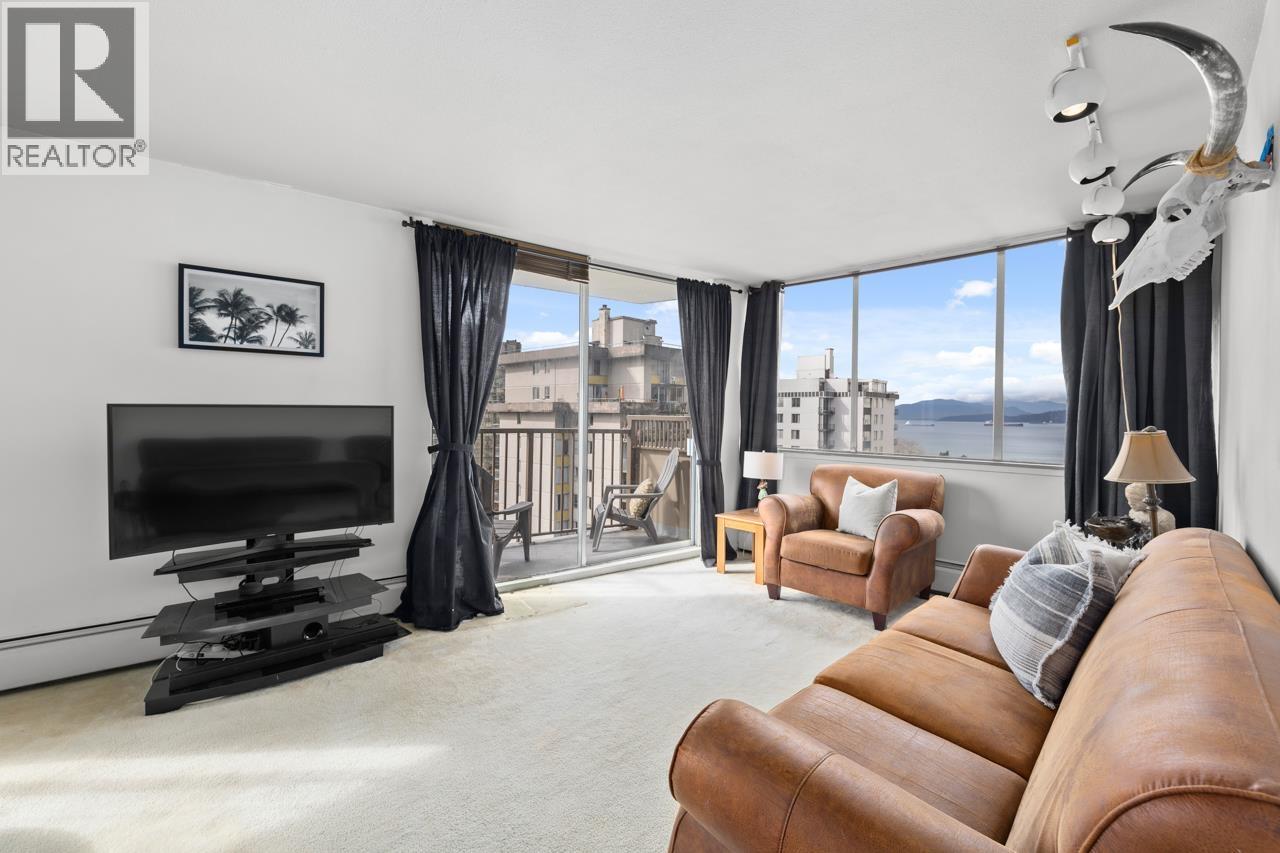Welcome to this corner view home at Surfcrest, perched high above the West End with sweeping city, mountain, and English Bay views. This bright corner suite offers a spacious layout with expansive windows that flood the home with natural light while framing stunning outlooks from every room. The open living and dining areas flow seamlessly to a private balcony, perfect for sunsets over the water and the vibrant West End skyline. Wake up to beautiful views from your generously-sized bedroom. Live in a well-maintained concrete building with on-site caretaker, just steps to English Bay, Stanley Park, the Seawall, and the cafés and restaurants of Davie and Denman. Enjoy the best of West End waterfront living. Includes 1 storage locker. (id:58403)