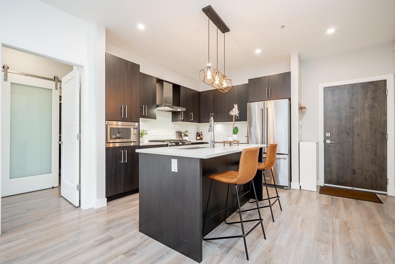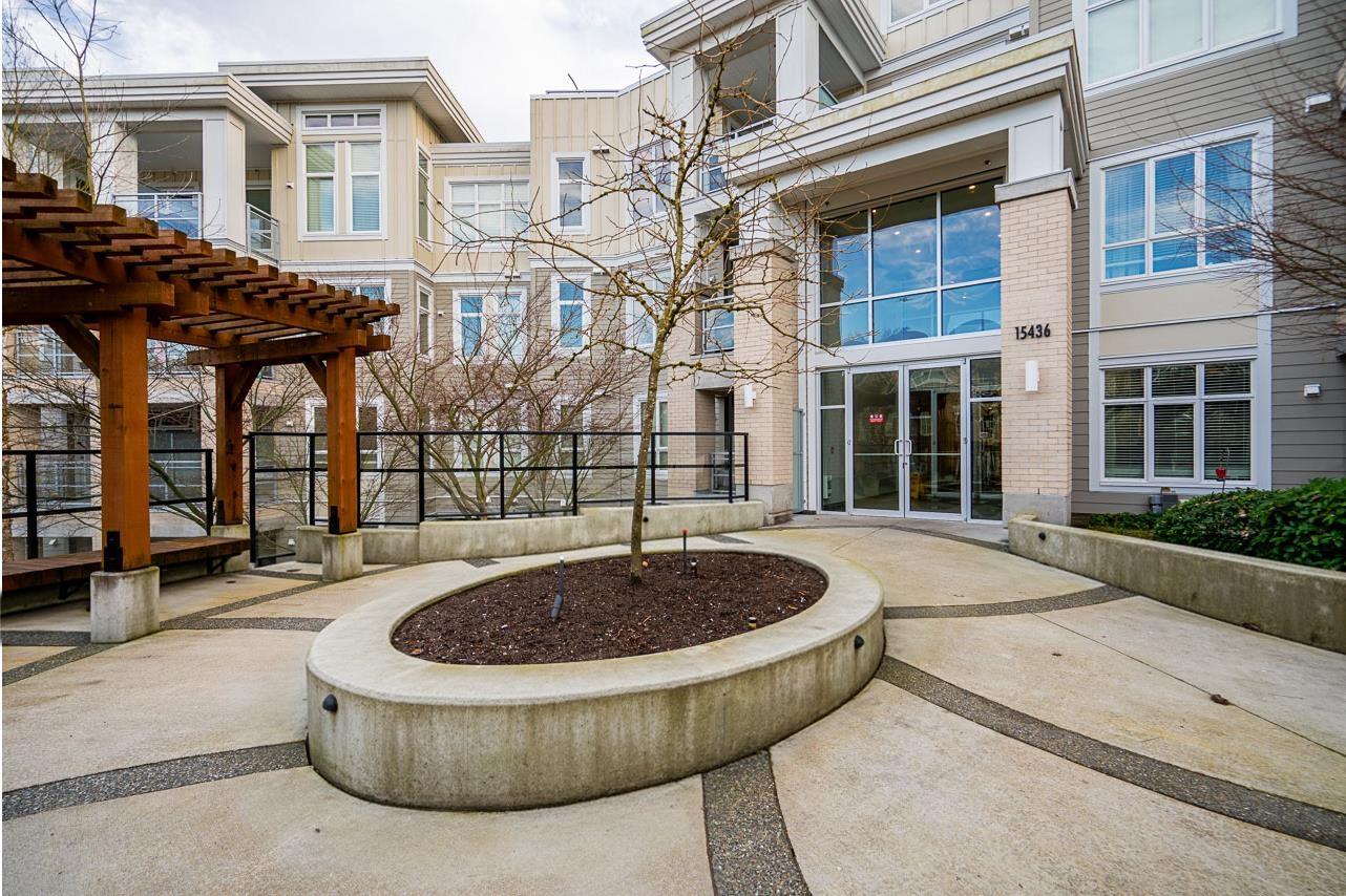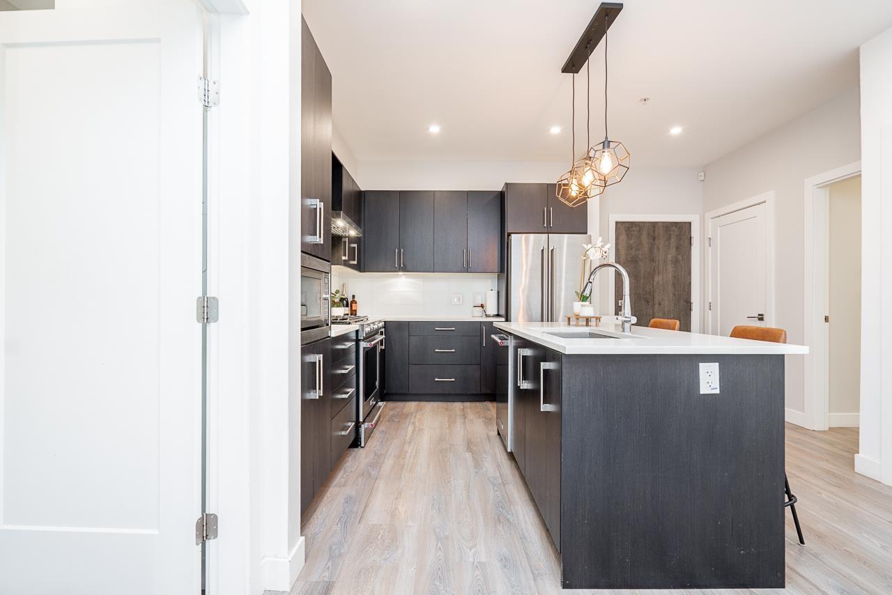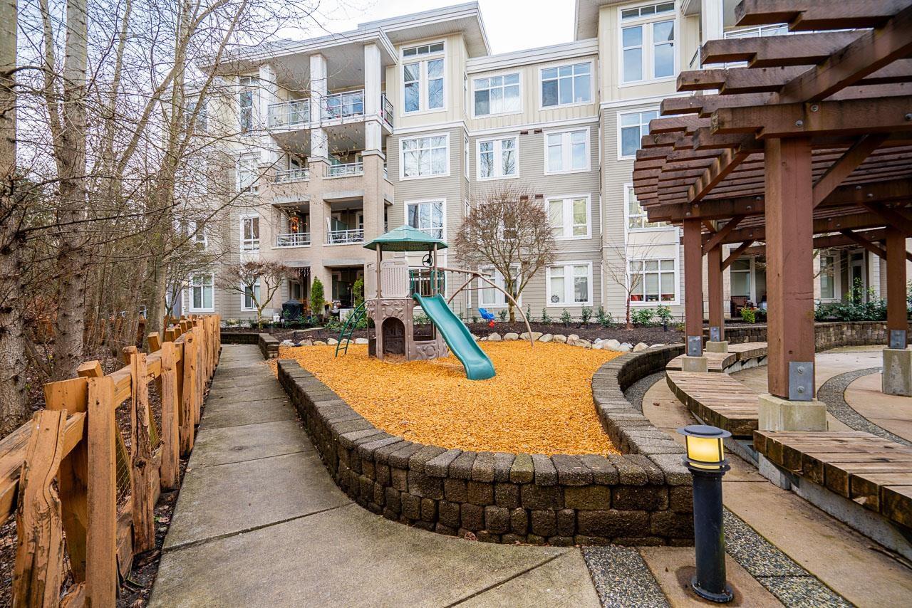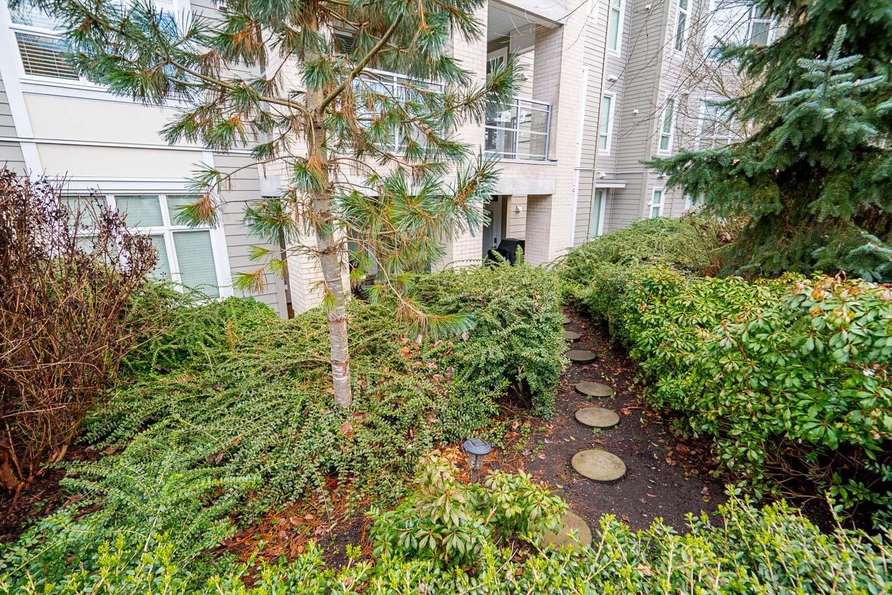 Ground-level 2-bedroom home at the sought-after Head Waters Club, offering a functional, well-designed layout and two private patios overlooking serene gardens. The modern kitchen features a spacious island and additional eating area-perfect for everyday living and entertaining. The primary bedroom boasts direct access to the second patio, a walk-in closet, and an ensuite with NuFloor heating and double sinks. Nestled in a tranquil setting with a peaceful trail to Morgan Creek. Includes 1 parking stall and 1 locker. Just minutes to The Shops at Morgan Crossing and Morgan Creek Golf Course, with quick highway access and steps to transit. Enjoy the amenities including a gym, clubhouse, and playground. (id:58403)
