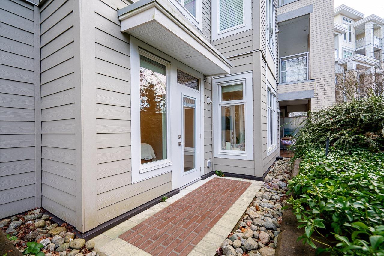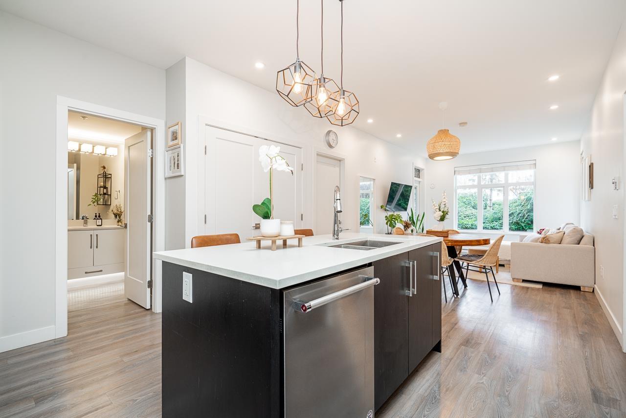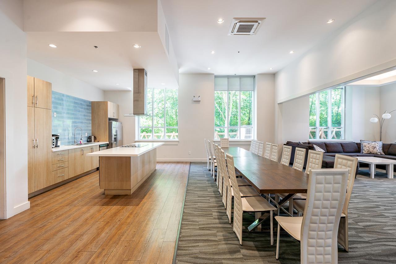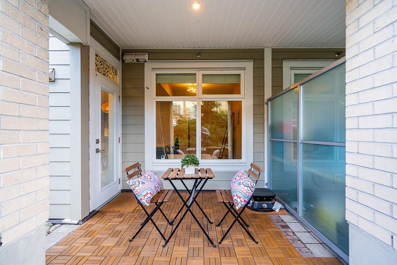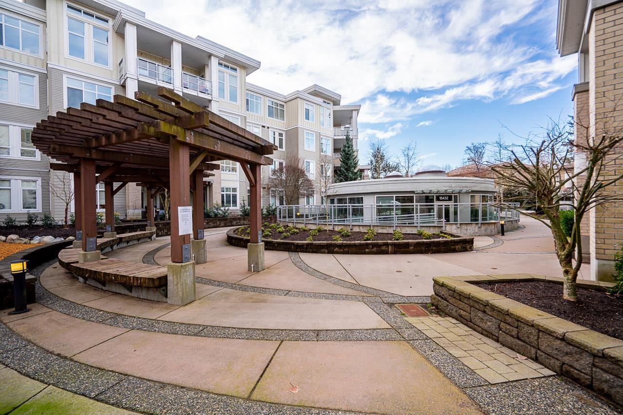 Ground-level 2-bedroom home at the sought-after Head Waters Club, offering a functional, well-designed layout and two private patios overlooking serene gardens. The modern kitchen features a spacious island and additional eating area-perfect for everyday living and entertaining. The primary bedroom boasts direct access to the second patio, a walk-in closet, and an ensuite with NuFloor heating and double sinks. Nestled in a tranquil setting with a peaceful trail to Morgan Creek. Includes 1 parking stall and 1 locker. Just minutes to The Shops at Morgan Crossing and Morgan Creek Golf Course, with quick highway access and steps to transit. Enjoy the amenities including a gym, clubhouse, and playground. (id:58403)