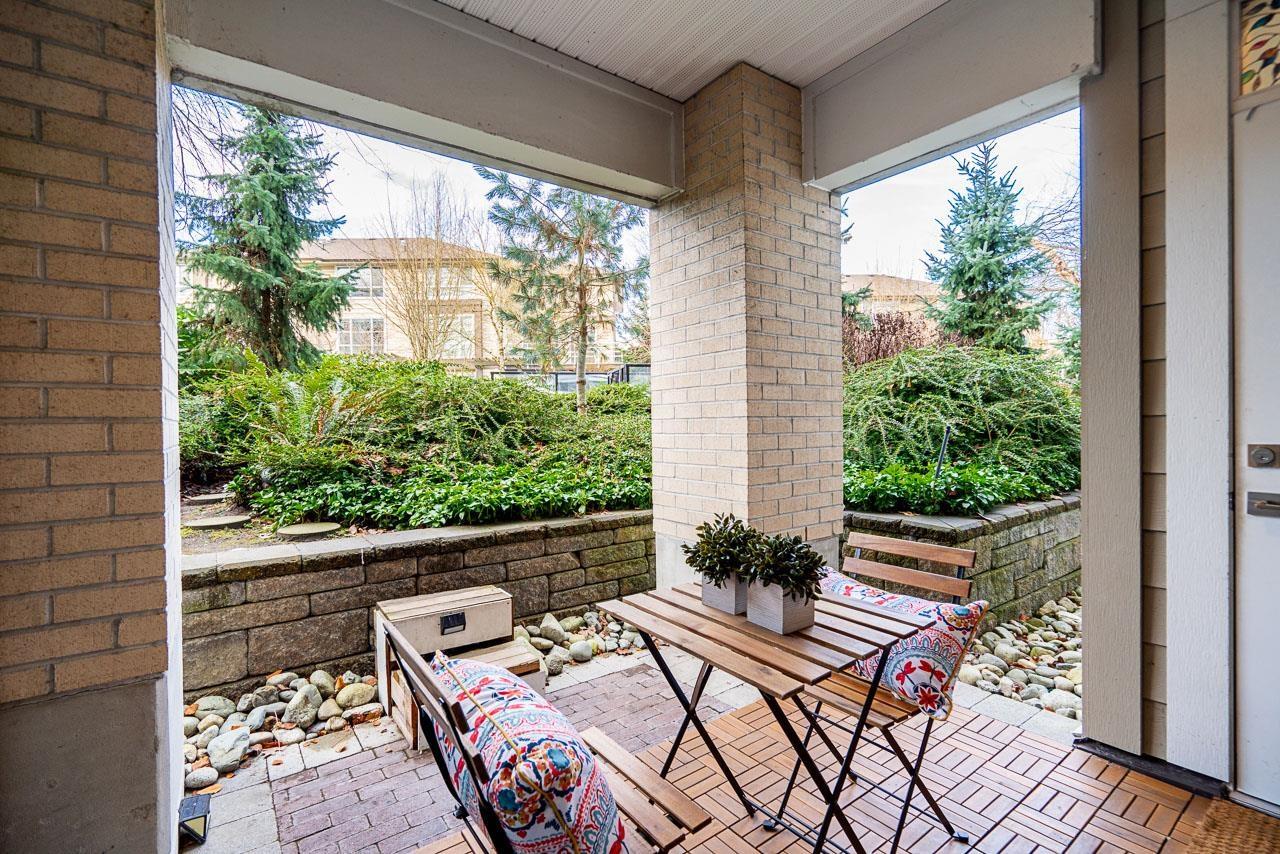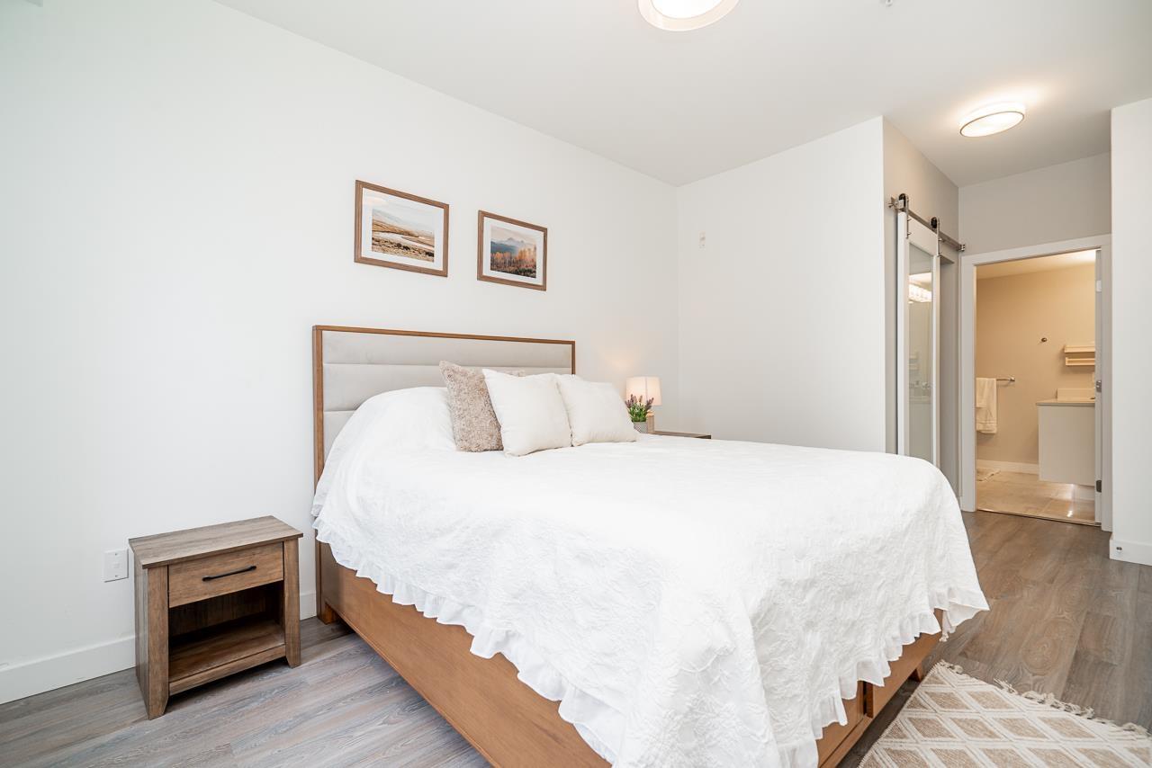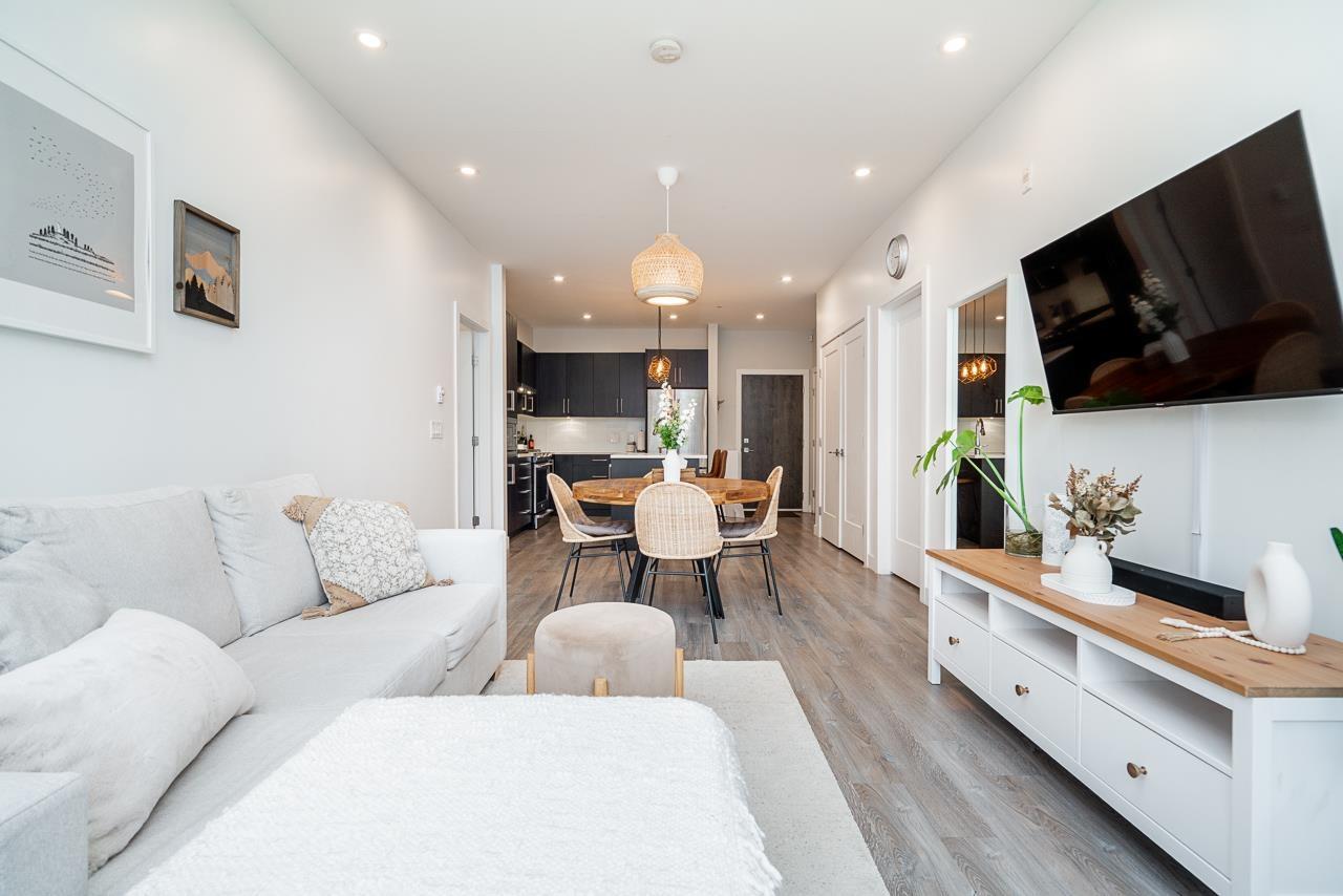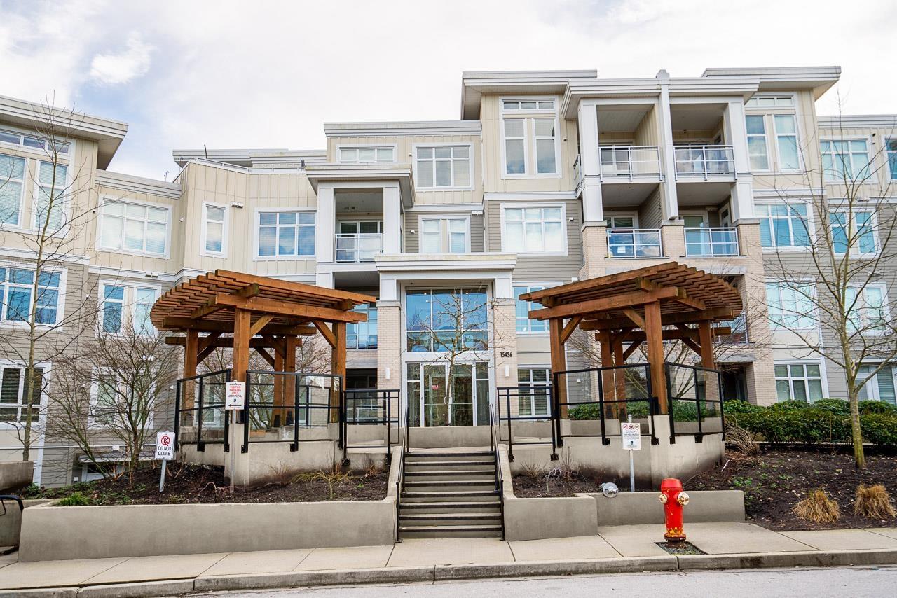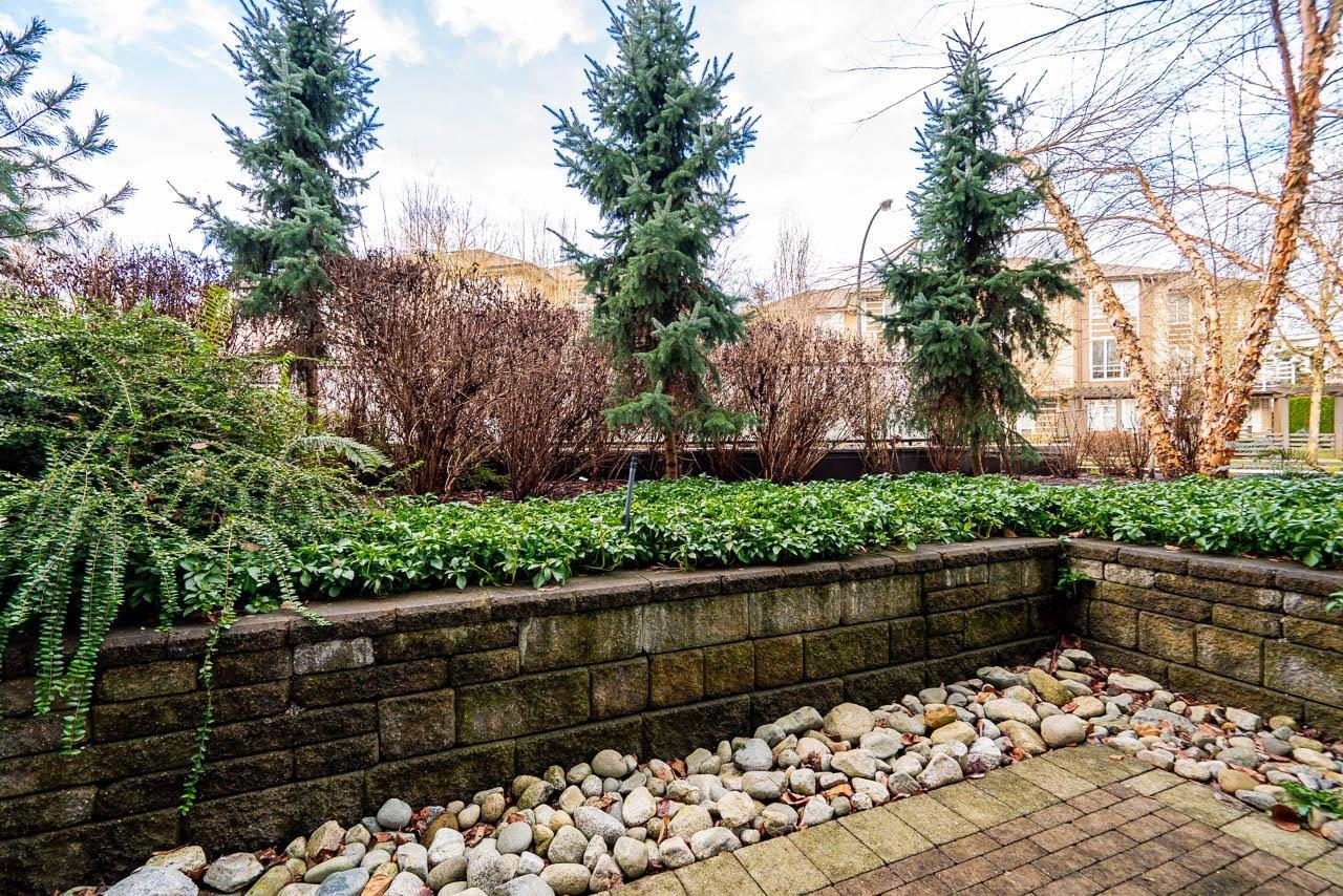 Ground-level 2-bedroom home at the sought-after Head Waters Club, offering a functional, well-designed layout and two private patios overlooking serene gardens. The modern kitchen features a spacious island and additional eating area-perfect for everyday living and entertaining. The primary bedroom boasts direct access to the second patio, a walk-in closet, and an ensuite with NuFloor heating and double sinks. Nestled in a tranquil setting with a peaceful trail to Morgan Creek. Includes 1 parking stall and 1 locker. Just minutes to The Shops at Morgan Crossing and Morgan Creek Golf Course, with quick highway access and steps to transit. Enjoy the amenities including a gym, clubhouse, and playground. (id:58403)
