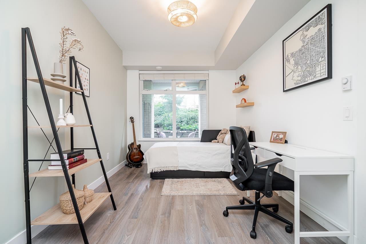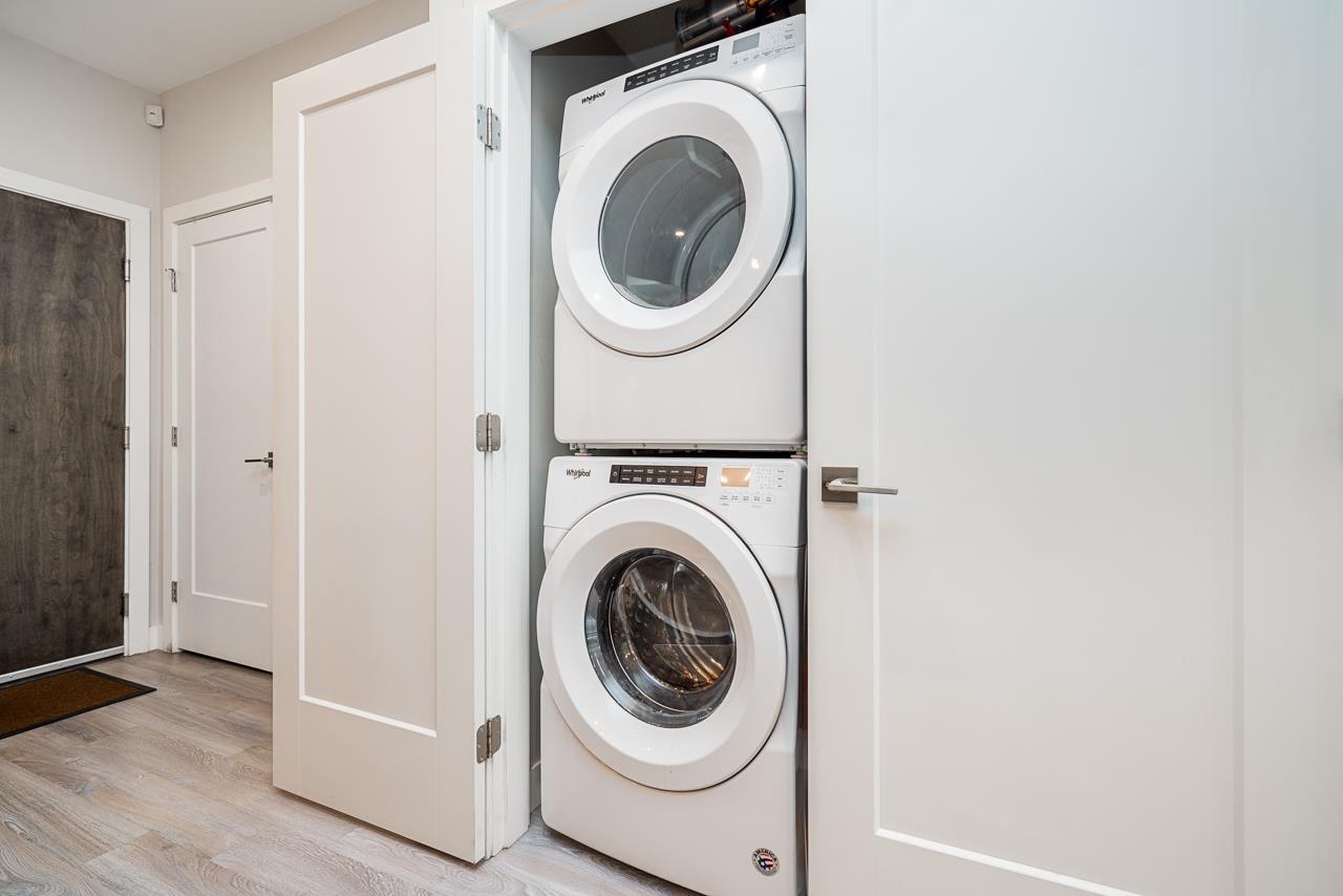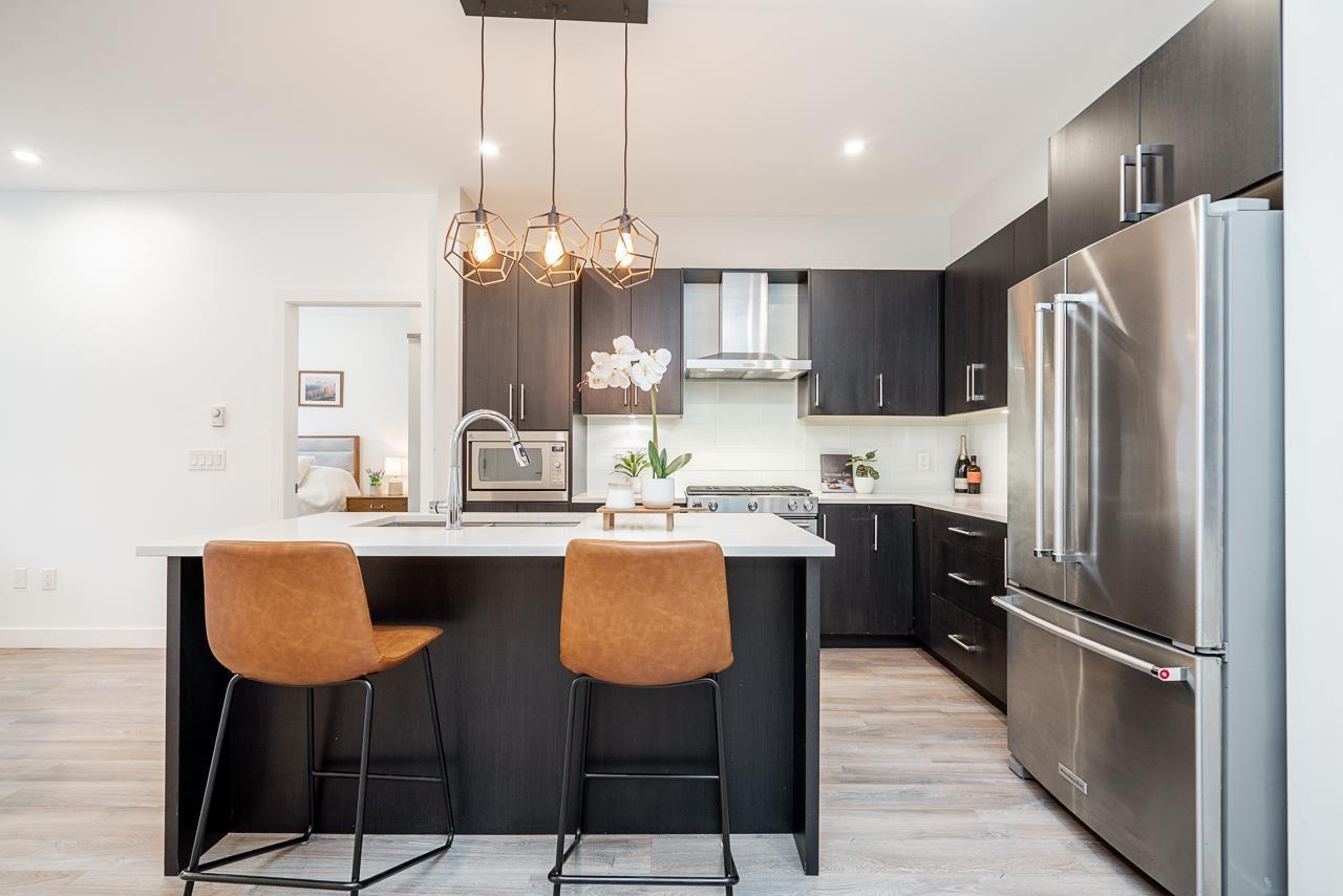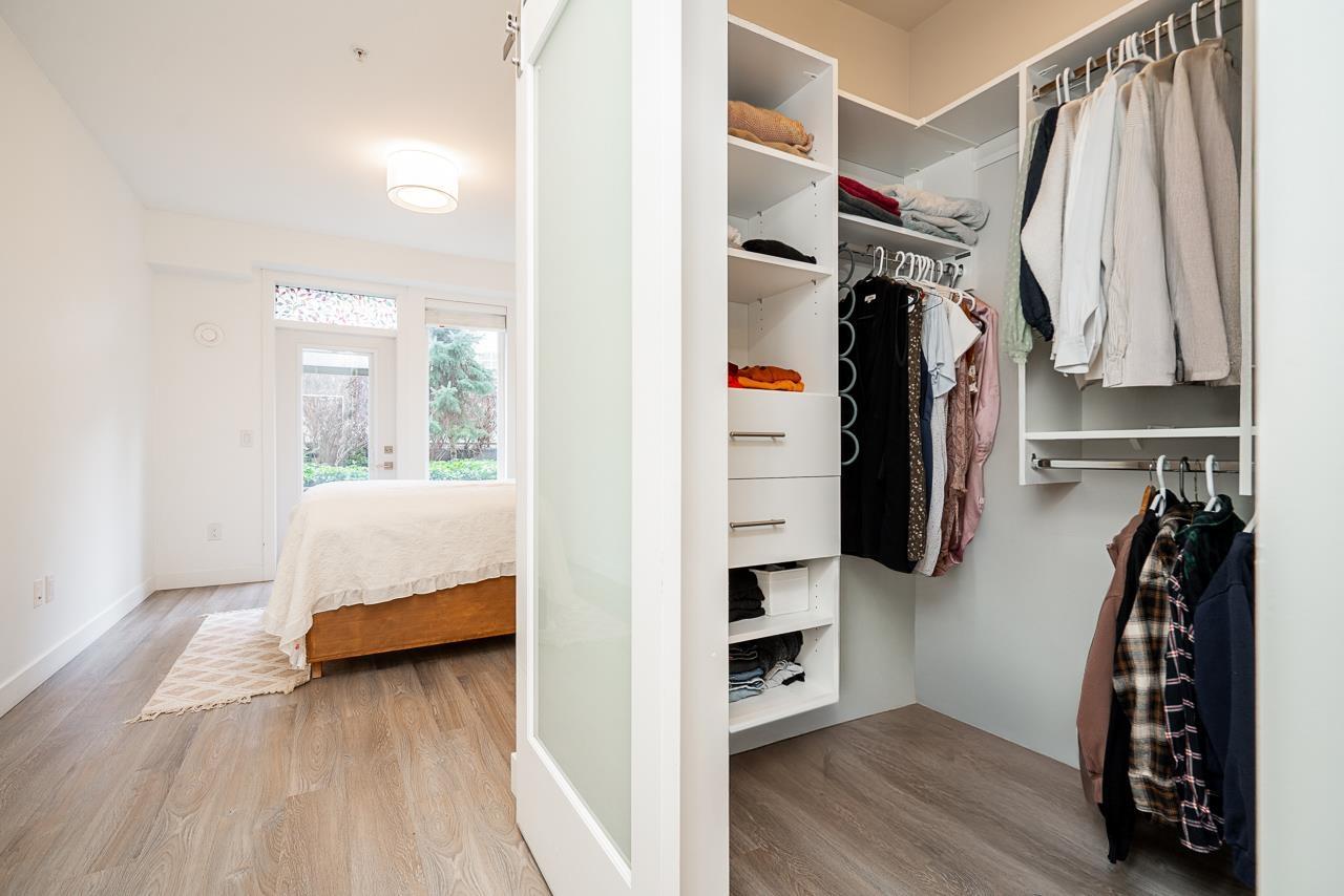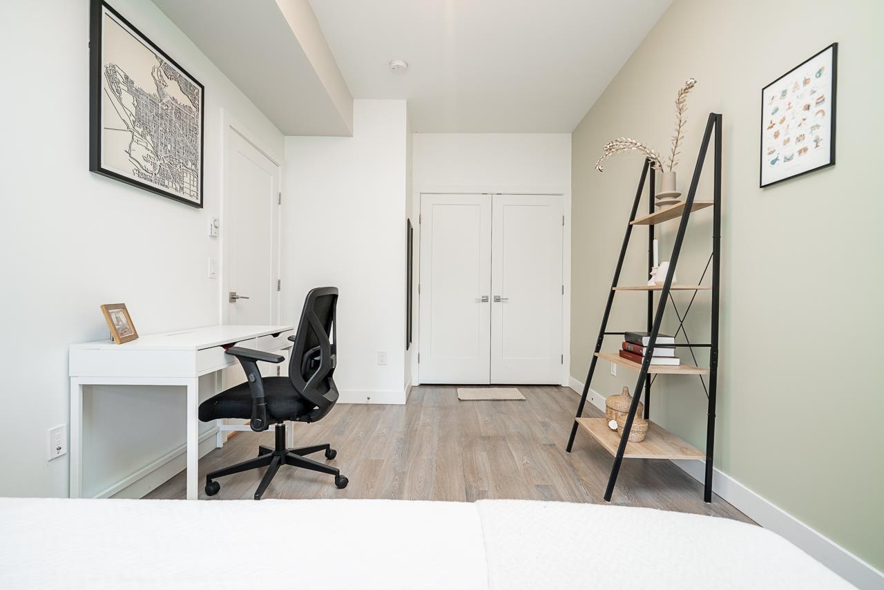 Ground-level 2-bedroom home at the sought-after Head Waters Club, offering a functional, well-designed layout and two private patios overlooking serene gardens. The modern kitchen features a spacious island and additional eating area-perfect for everyday living and entertaining. The primary bedroom boasts direct access to the second patio, a walk-in closet, and an ensuite with NuFloor heating and double sinks. Nestled in a tranquil setting with a peaceful trail to Morgan Creek. Includes 1 parking stall and 1 locker. Just minutes to The Shops at Morgan Crossing and Morgan Creek Golf Course, with quick highway access and steps to transit. Enjoy the amenities including a gym, clubhouse, and playground. (id:58403)