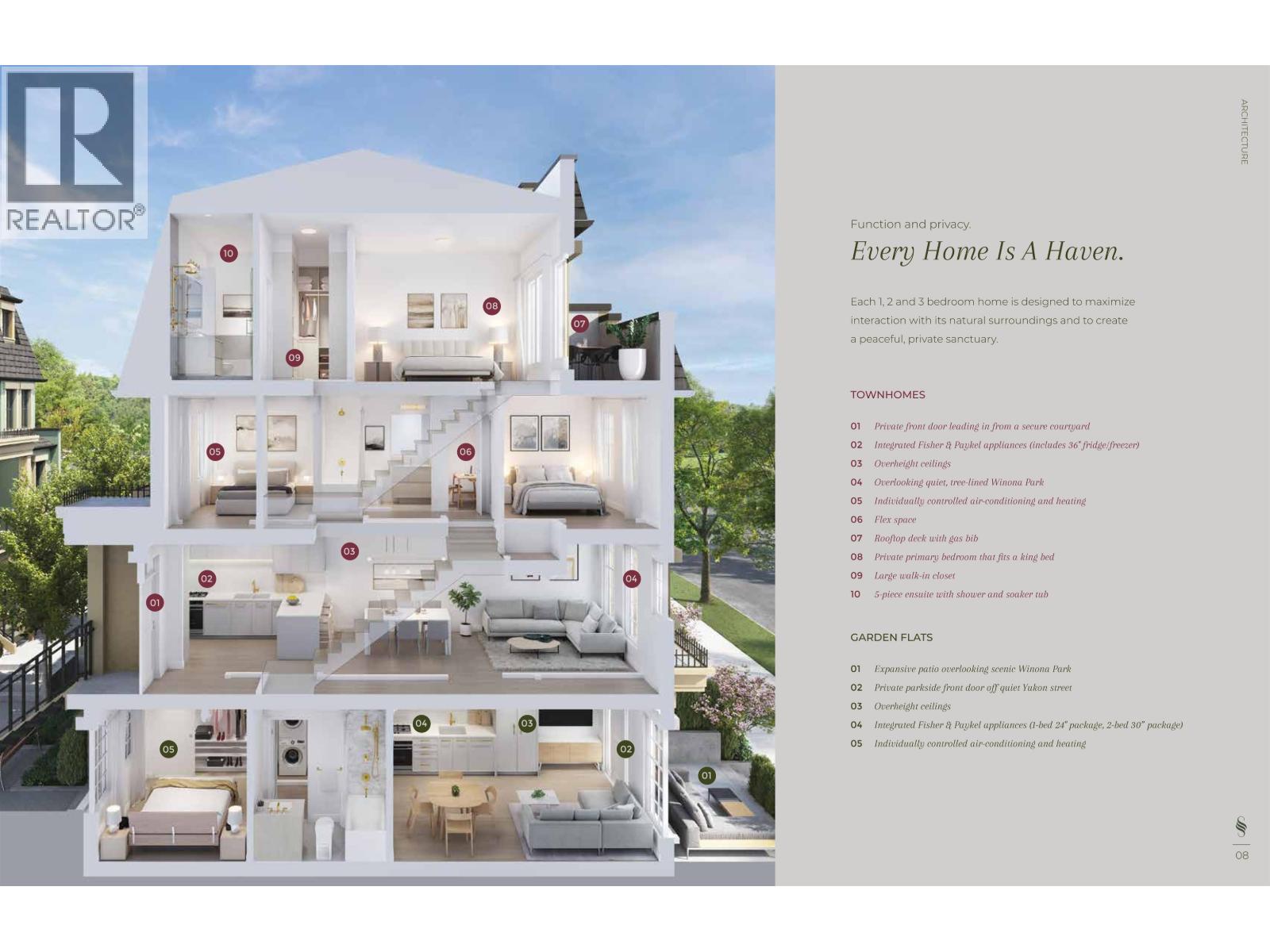 EXTREMELY MOTIVATED! HUGE DISCOUNT AVAILABLE! Savanah Vancouver - 36 Georgian-inspired parkside townhomes & garden flats on Vancouver's Westside Cambie Corridor. This A1 plan urban 1-bed garden flat offers 435 SF interior + 100 SF private patio directly across from Winona Park. Features 9' overheight ceilings, integrated Fisher & Paykel 24" appliance pkg (cooktop, wall oven, fridge/freezer, DW), engineered hardwood floors, quartz countertops & backsplash, crown mouldings, individually controlled A/C & heating, in-suite front-load W/D, and Kohler brushed brass fixtures throughout. Light colour palette. Includes 1 parking stall. Private ground-level entry off quiet Yukon St with parkside views. Steps to Langara Golf Course & walking trails. 7-min walk to Canada Line. (id:58403)