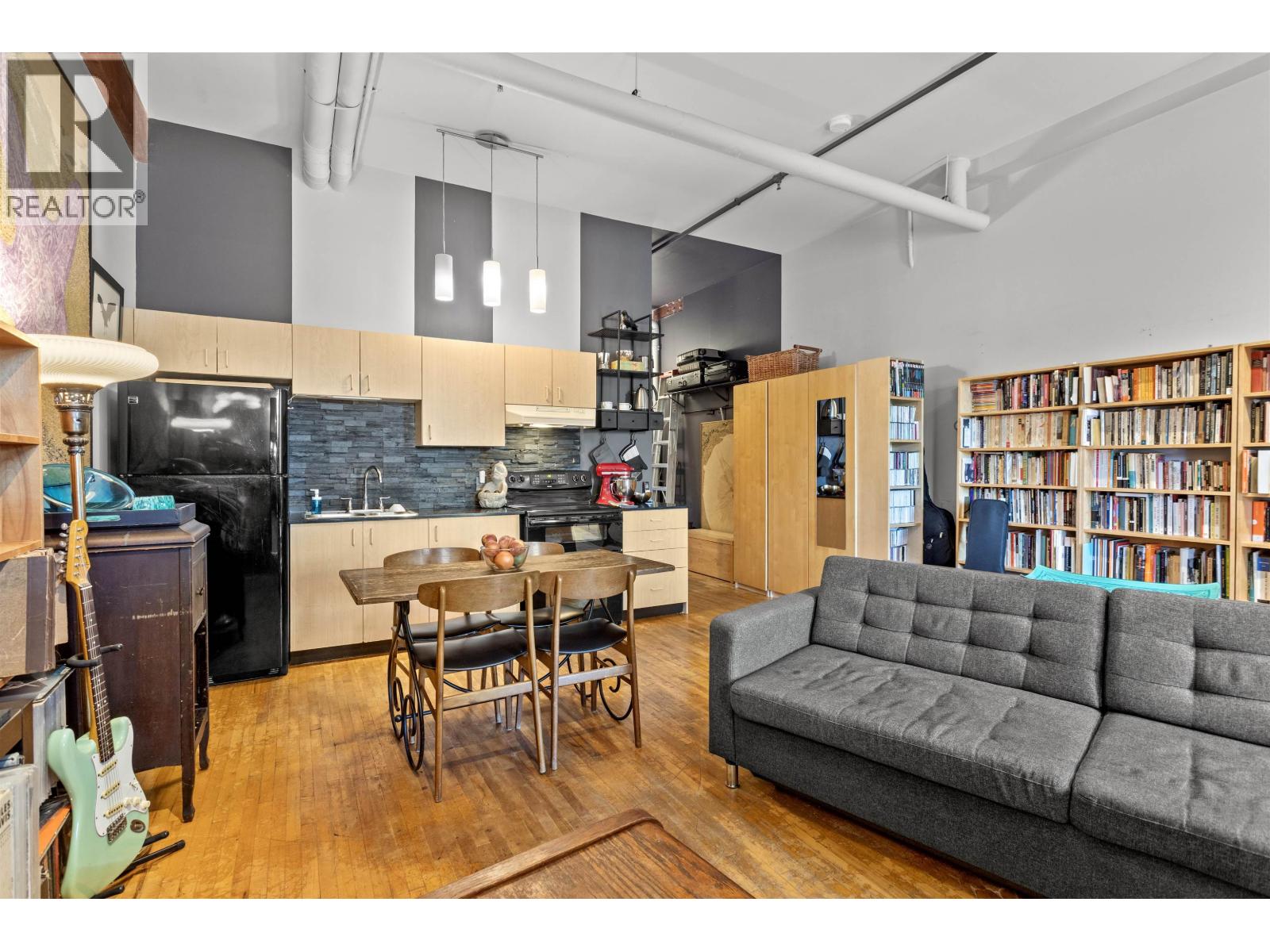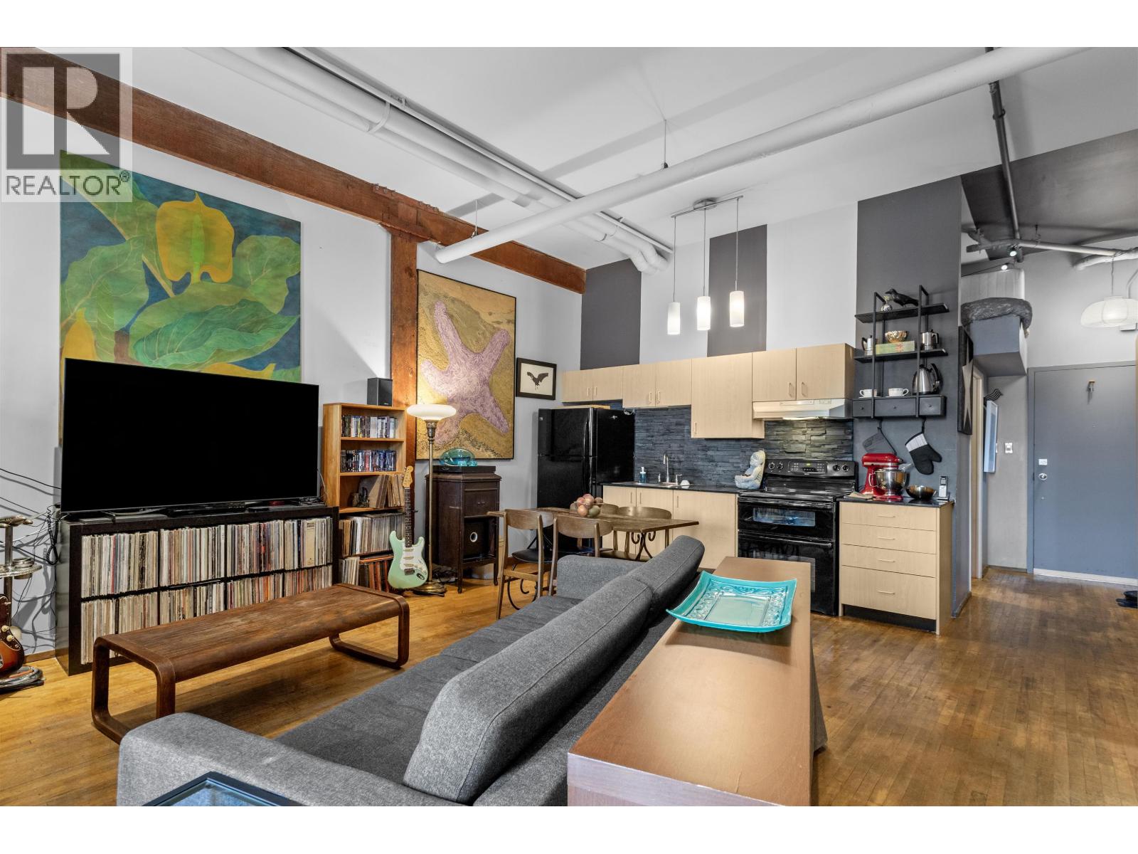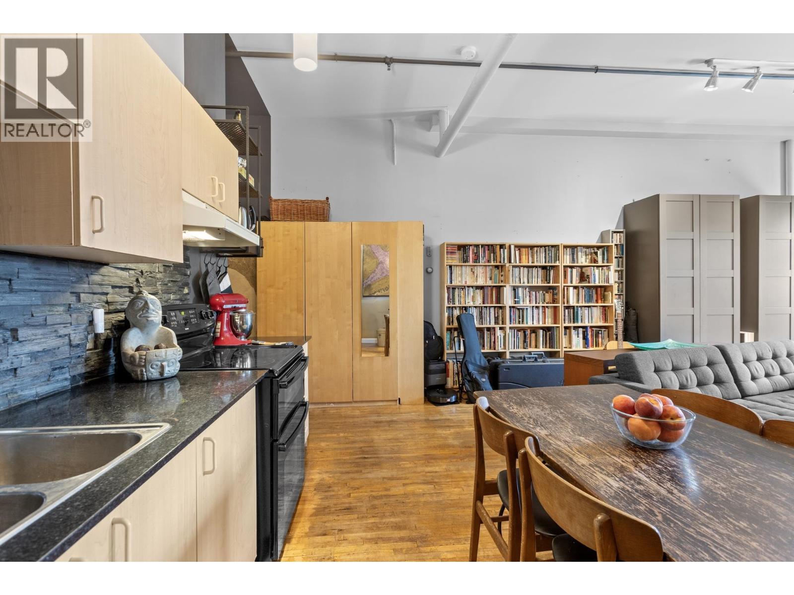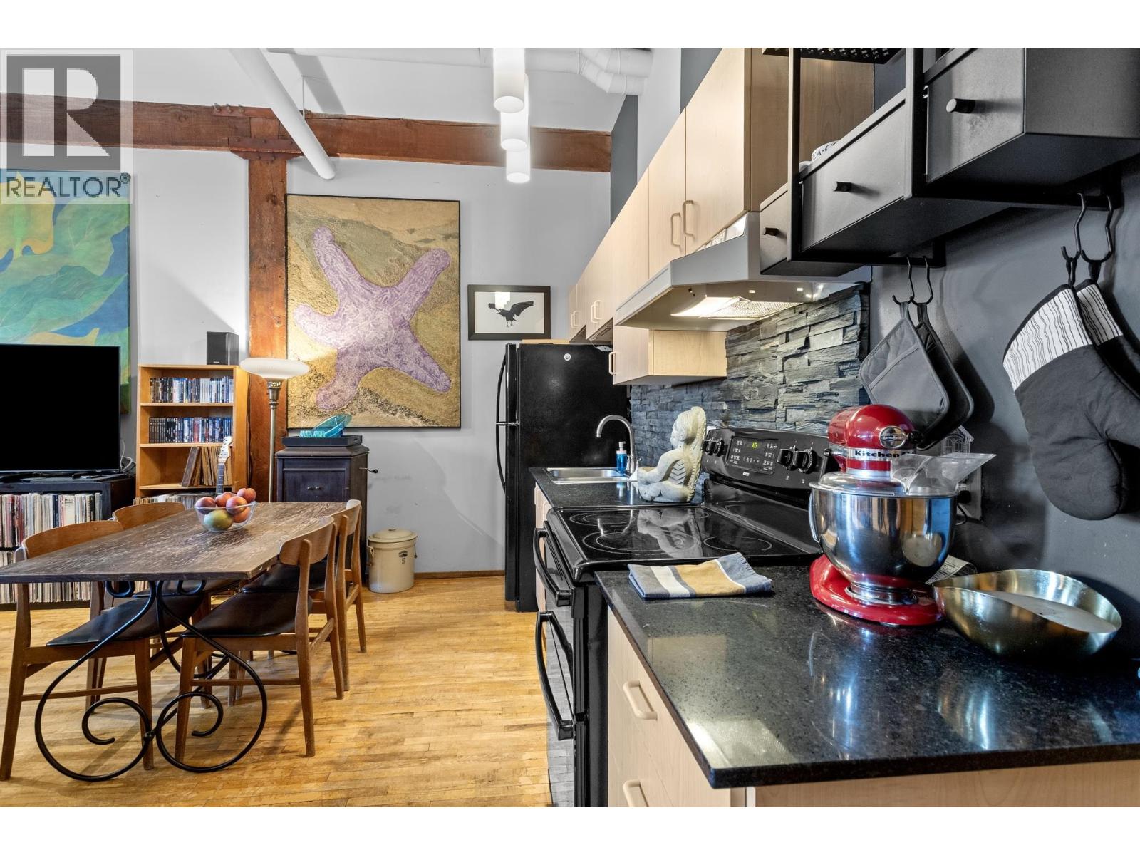 Welcome to L´Atelier, an award-winning heritage live/work loft conversion by Paul Merrick Architects, set in the heart of East Vancouver´s vibrant East Village. Quiet, south-facing, true urban oasis. Feat. OG 1930s timber beams, heritage maple floors, striking industrial design elements, expansive open-concept plan. The kitchen boasts sleek black quartz countertop & a black slate backsplash -incl clever paint detailing highlighting the 7-12' ceilings. Unmatched community amenities & stunning rooftop deck w panoramic city views, BBQs, seating areas, lush gardens & bike room. A loading bay & live/work C-2C zoning provide added functionality for creatives & entrepreneurs. Enjoy everything the East Village has to offer-artisan markets, cafés, bistros, boutique shops & transit nearby. (id:58403)