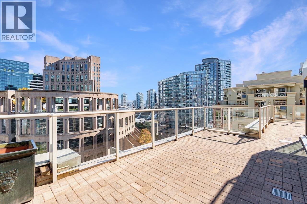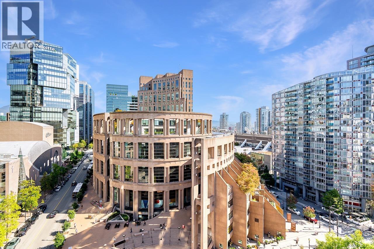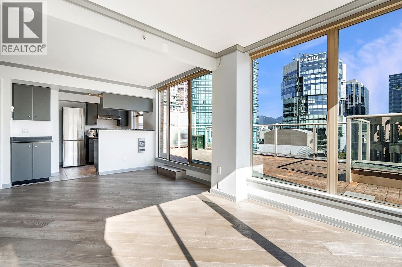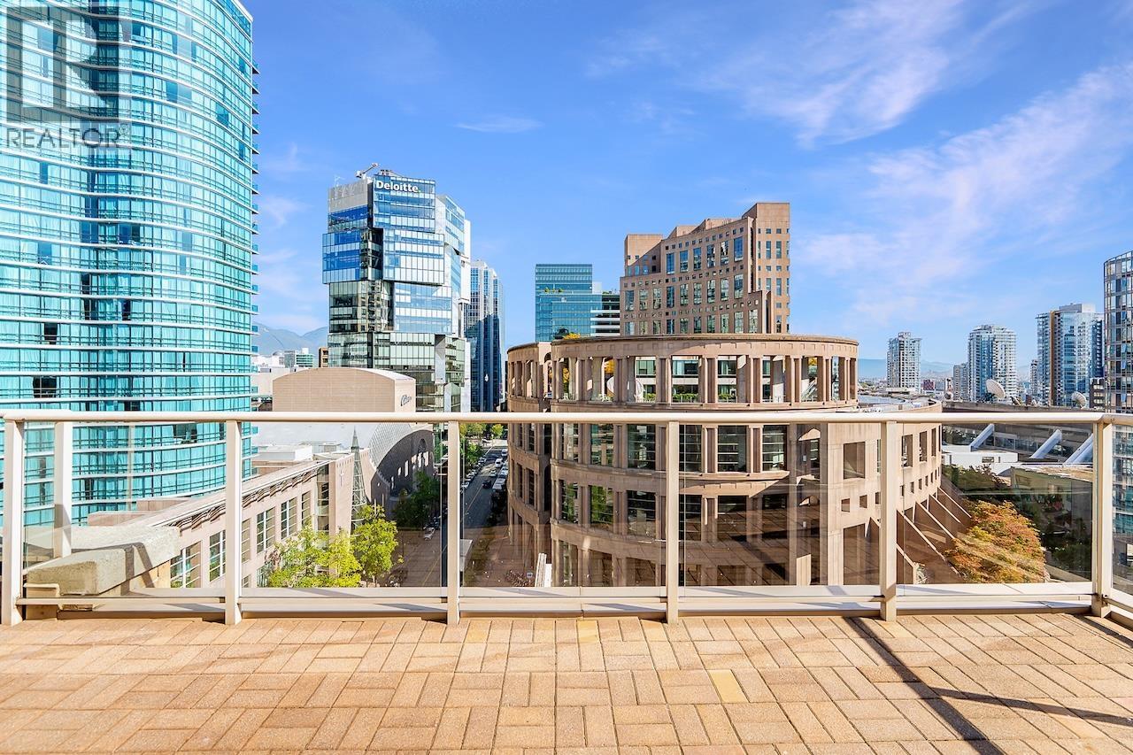 Welcome to the Galileo! This rare 1 bed + 2 full bath corner home offers 729 sqft of interior space plus a showstopping private 468 sqft terrace overlooking Library Square. Bathed in natural light from floor-to-ceiling windows, this open concept layout flows effortlessly and can easily convert to 2 bedrooms. Many updates from new oak floors, fresh paint, stainless steel appliances and an efficient Ouellet heating system. Includes 1 parking and 1 storage locker. Building perks: gym, hot tub, sauna, lounge, courtyard, visitor parking, caretaker, refreshed lobby, re-piped (2017) and roof (2015). Pets and rental friendly. Unbeatable Downtown location steps to Robson, Yaletown, top offices (Amazon, Deloitte, Microsoft, SAP) and both SkyTrain lines. Open: Sat Oct 4 2-4pm & Sun Oct 5 12-1:30pm. (id:58403)
