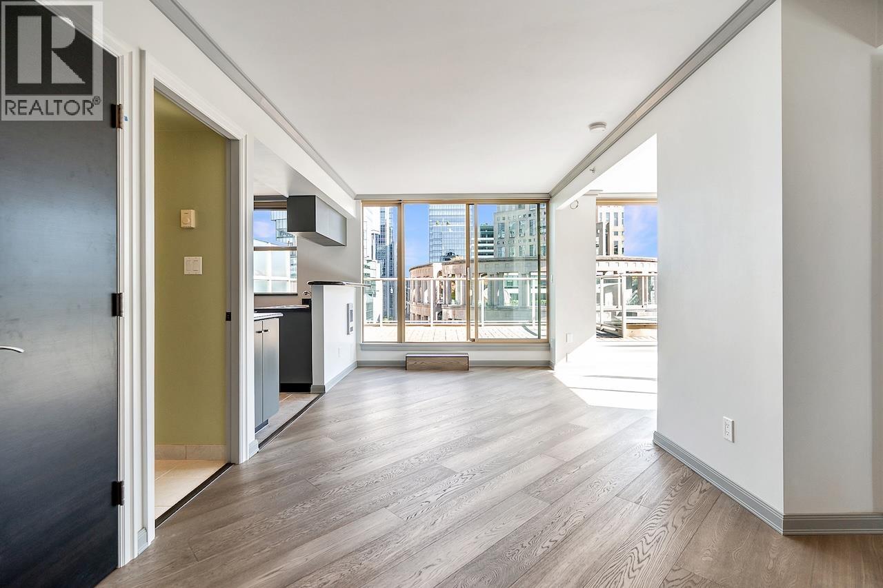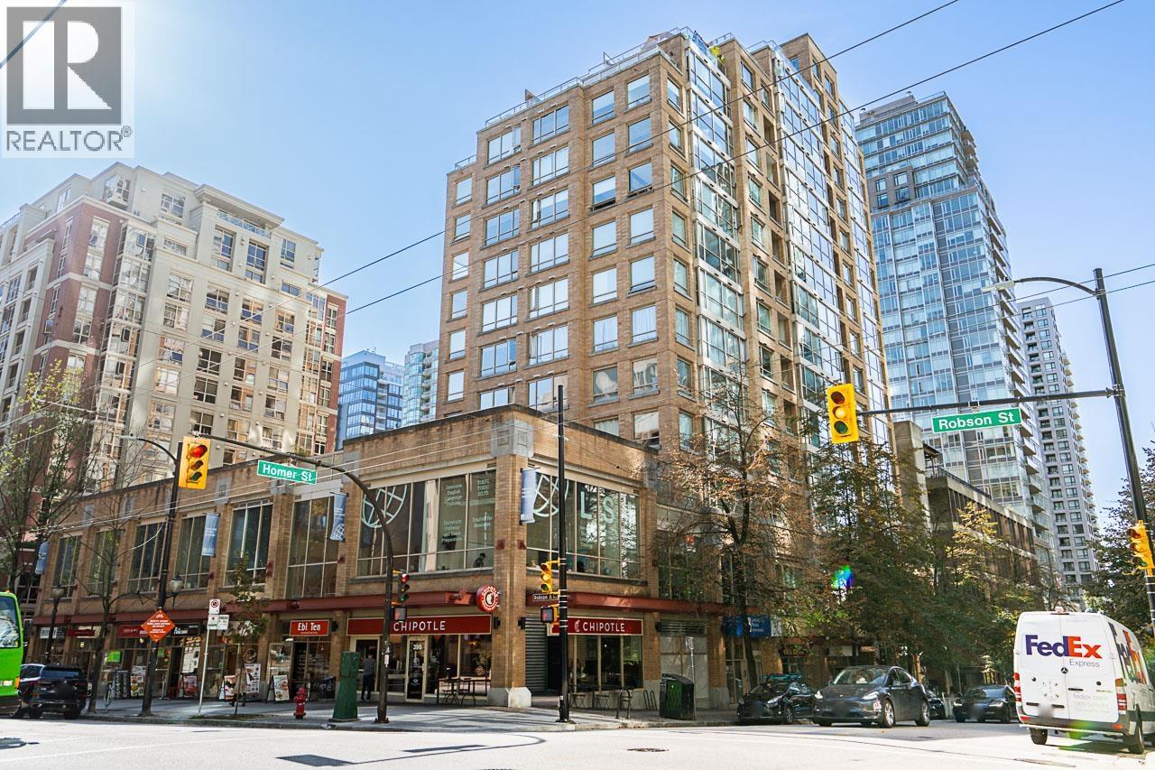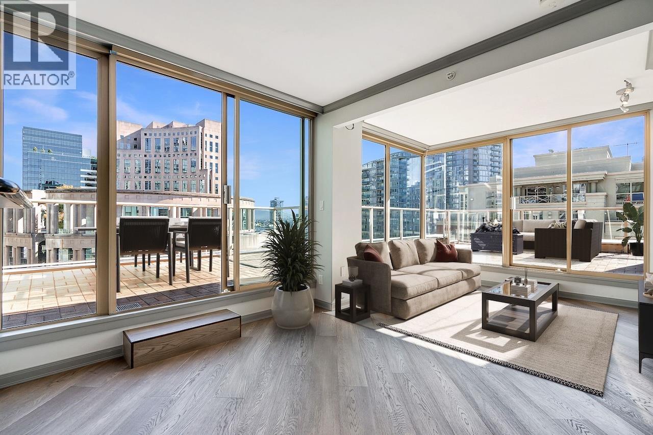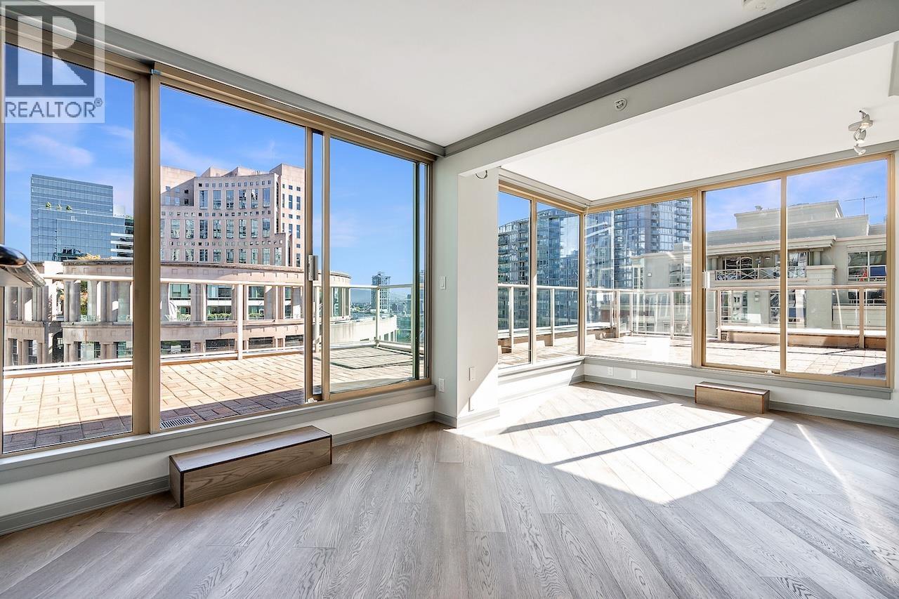 Welcome to the Galileo! This rare 1 bed + 2 full bath corner home offers 729 sqft of interior space plus a showstopping private 468 sqft terrace overlooking Library Square. Bathed in natural light from floor-to-ceiling windows, this open concept layout flows effortlessly and can easily convert to 2 bedrooms. Many updates from new oak floors, fresh paint, stainless steel appliances and an efficient Ouellet heating system. Includes 1 parking and 1 storage locker. Building perks: gym, hot tub, sauna, lounge, courtyard, visitor parking, caretaker, refreshed lobby, re-piped (2017) and roof (2015). Pets and rental friendly. Unbeatable Downtown location steps to Robson, Yaletown, top offices (Amazon, Deloitte, Microsoft, SAP) and both SkyTrain lines. Open: Sat Oct 4 2-4pm & Sun Oct 5 12-1:30pm. (id:58403)
