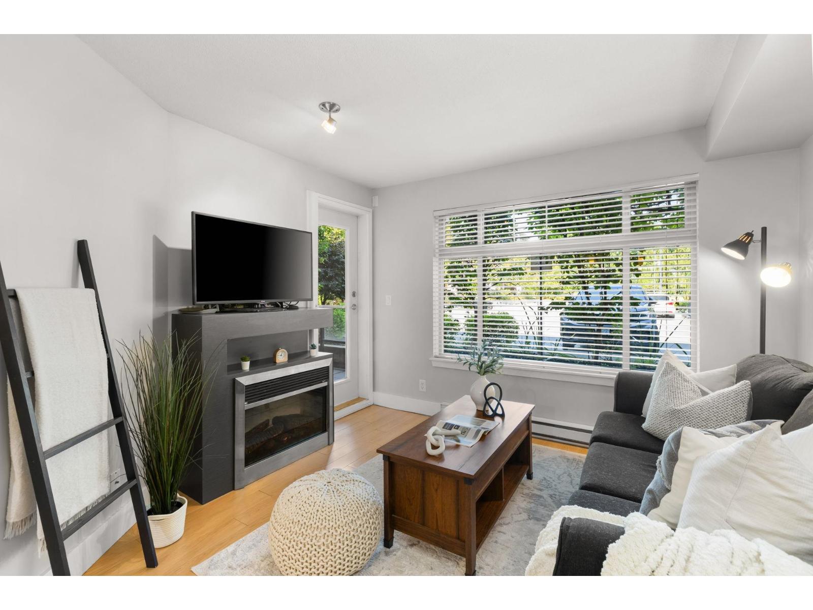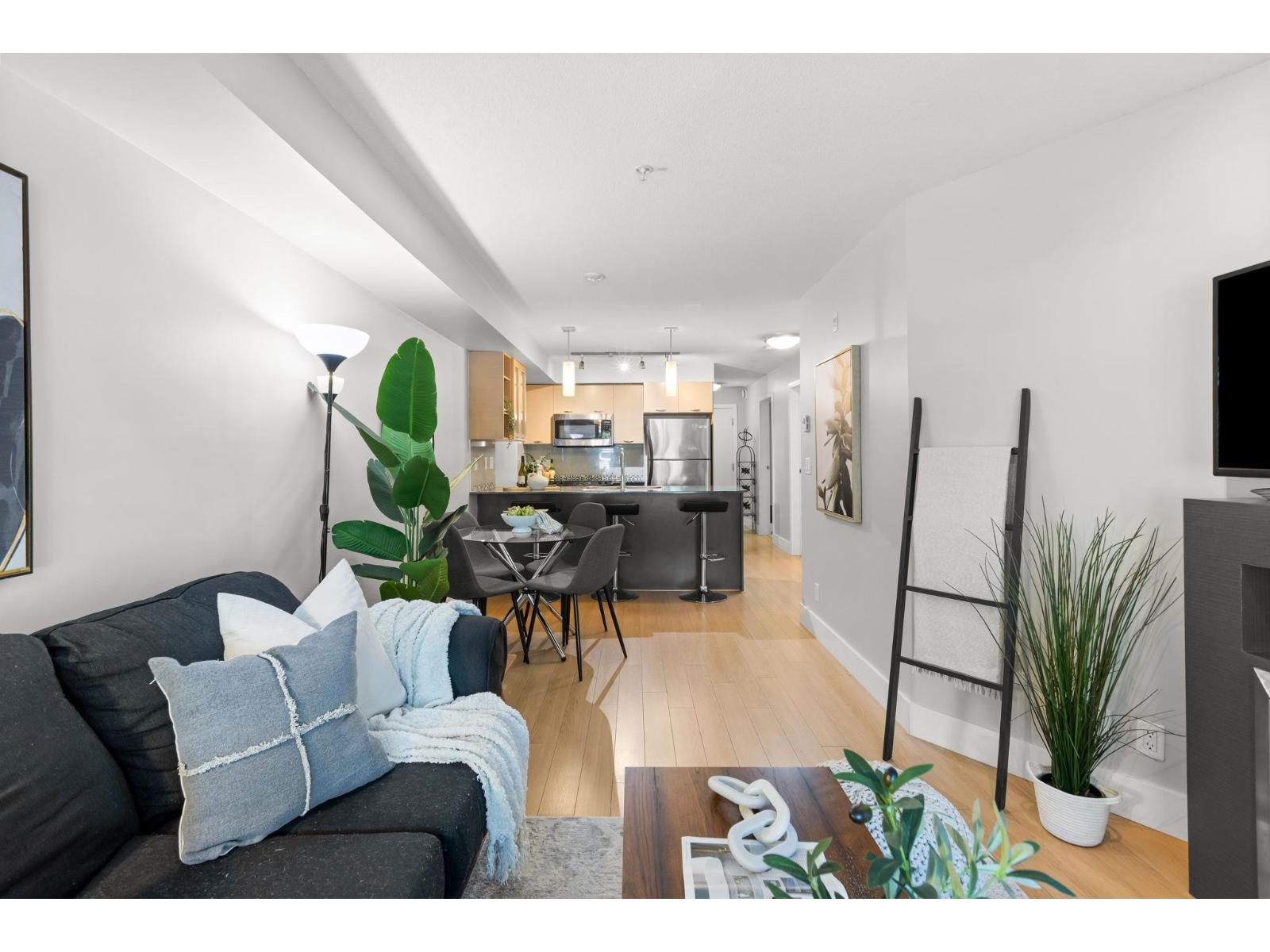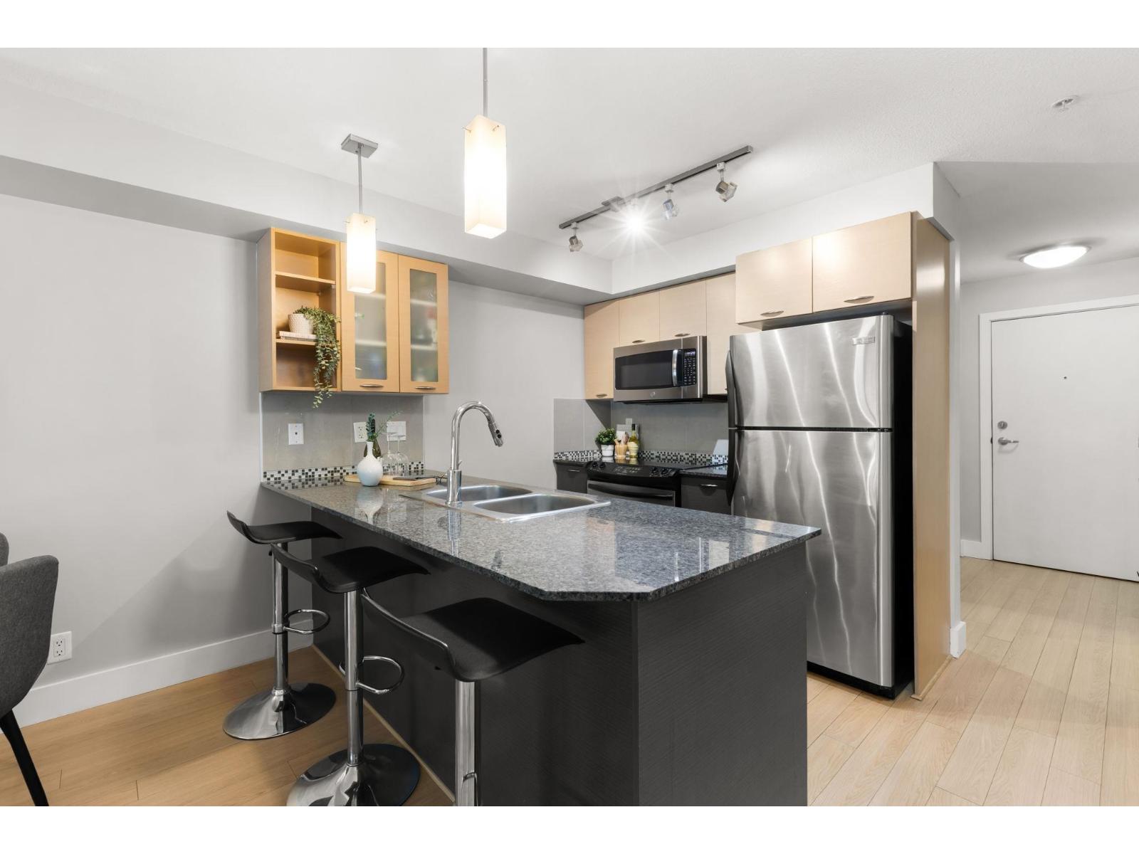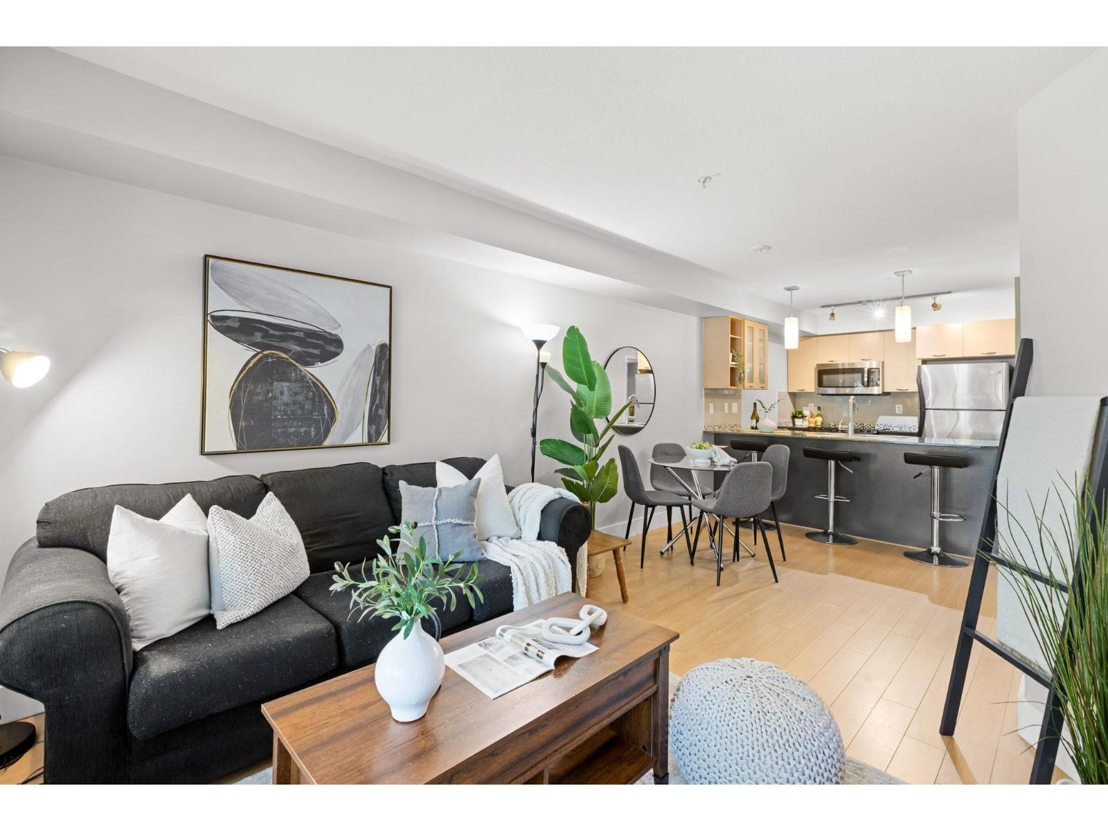 Welcome to this beautiful 1 bedroom + den at "Latitude". This thoughtfully designed ground-level suite combines comfort with contemporary flair. Enjoy an open-concept living area anchored by a cozy electric fireplace, flanked by seamless access to your private patio which is perfect for morning coffee or evening relaxation. The sleek kitchen boasts granite countertops, stainless steel appliances and the integrated eat-up bar enhances both function and entertaining ease. A generous den adds the finishing touch, offering the perfect space for a home office, nursery, or creative nook. The building features a well-equipped fitness room, billiards room, and two guest suites available for nightly rental-an ideal touch for hosting friends or family. 1 Parking & 1 Storage. (id:58403)