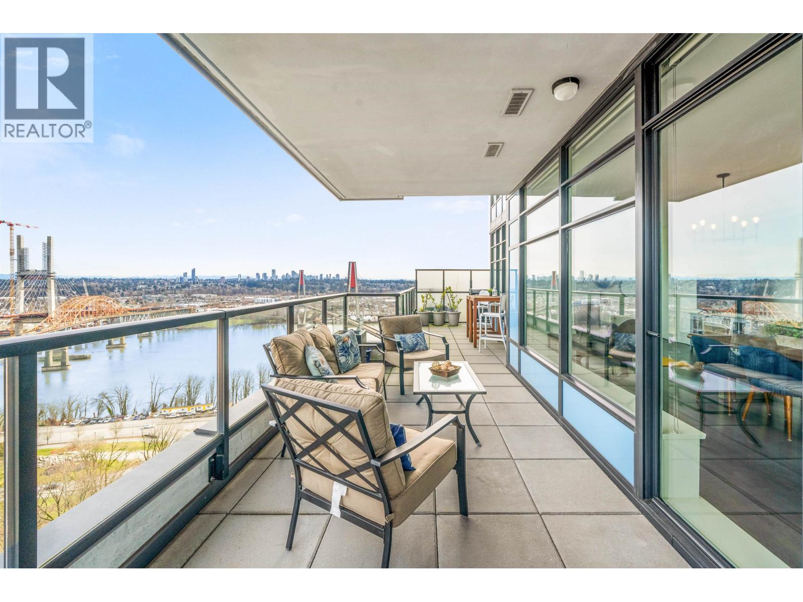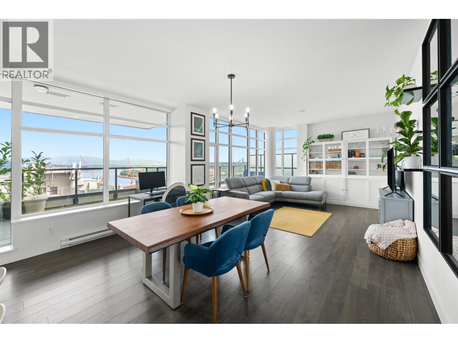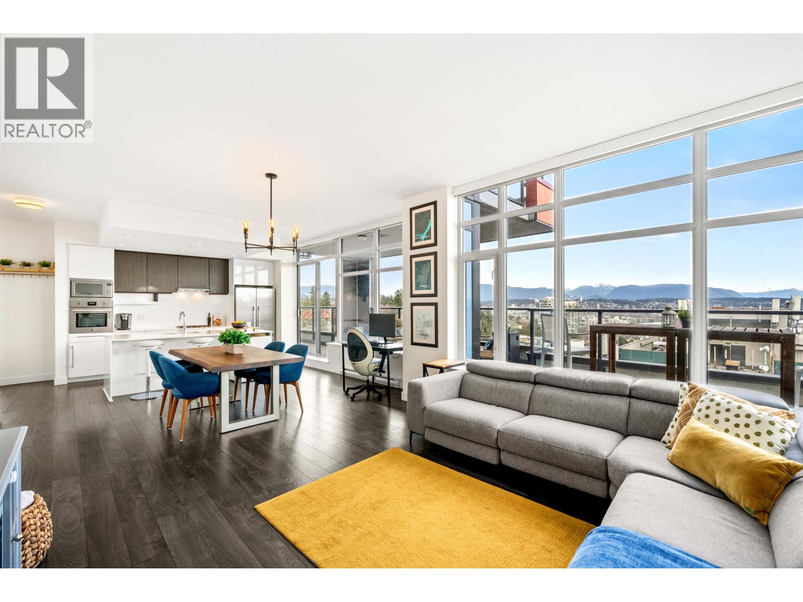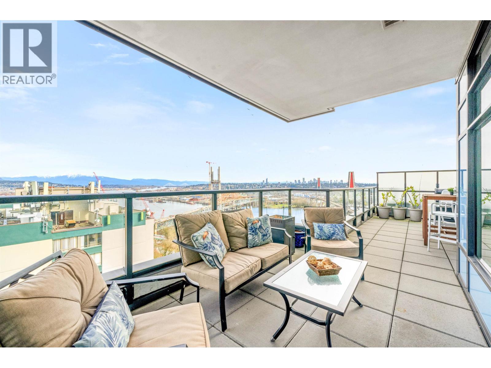 Stunning sub-penthouse high above downtown New West, this corner unit at Elliot Street offers panoramic views from the North Shore mountains, to the Fraser River & Mt Baker. Huge wrap around semi-covered patio, great for entertaining, over 300sf, enjoy morning sunsets & north, east & south facing views! Open floor plan, 1,154sf of living space, with 2 bedrooms, 2 bathrooms, open-concept living/dining/kitchen area with 10´ ceilings, large kitchen with island, high-end European appliances, gas range, and modern cabinetry. Located on the east side of Downtown New West, backing onto Albert Crescent park, tucked away from city noise and a close walk to Columbia Skytrain, Restaurants, Shopping and Pier Park. Includes 1 parking & 1 storage. (id:58403)