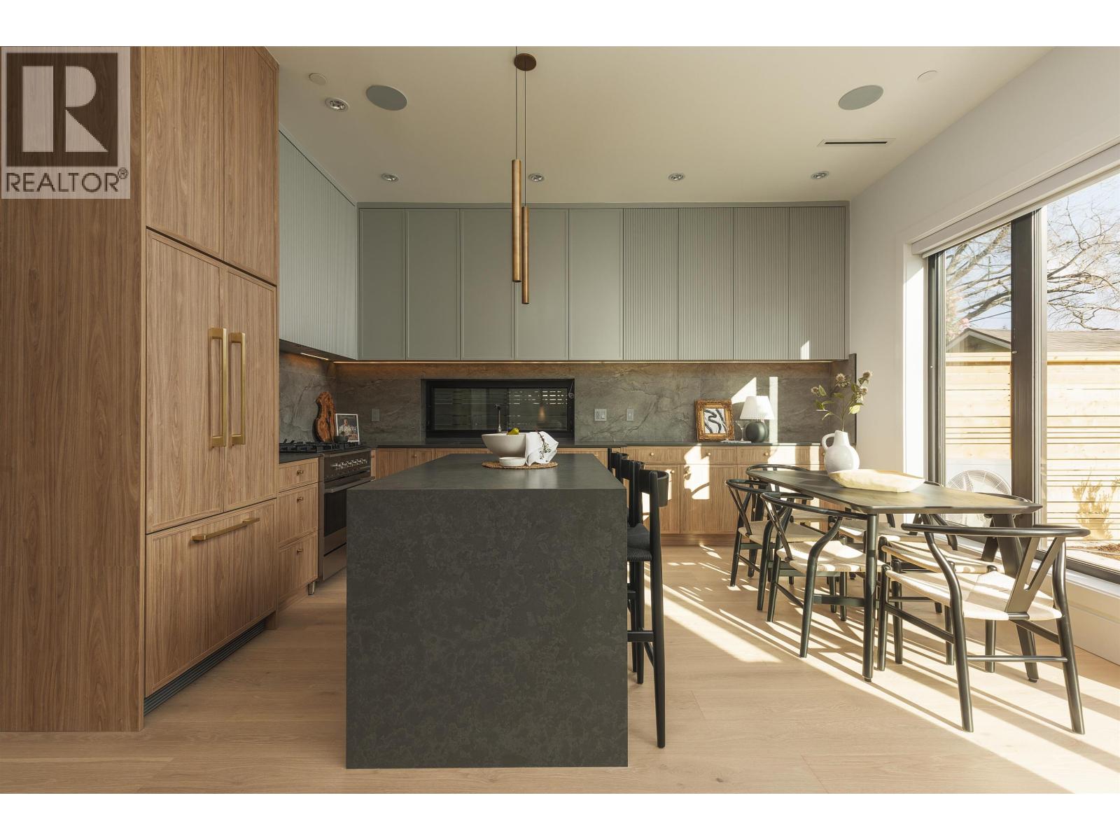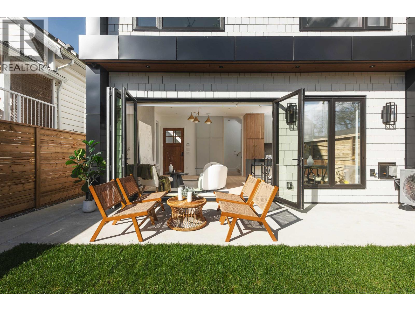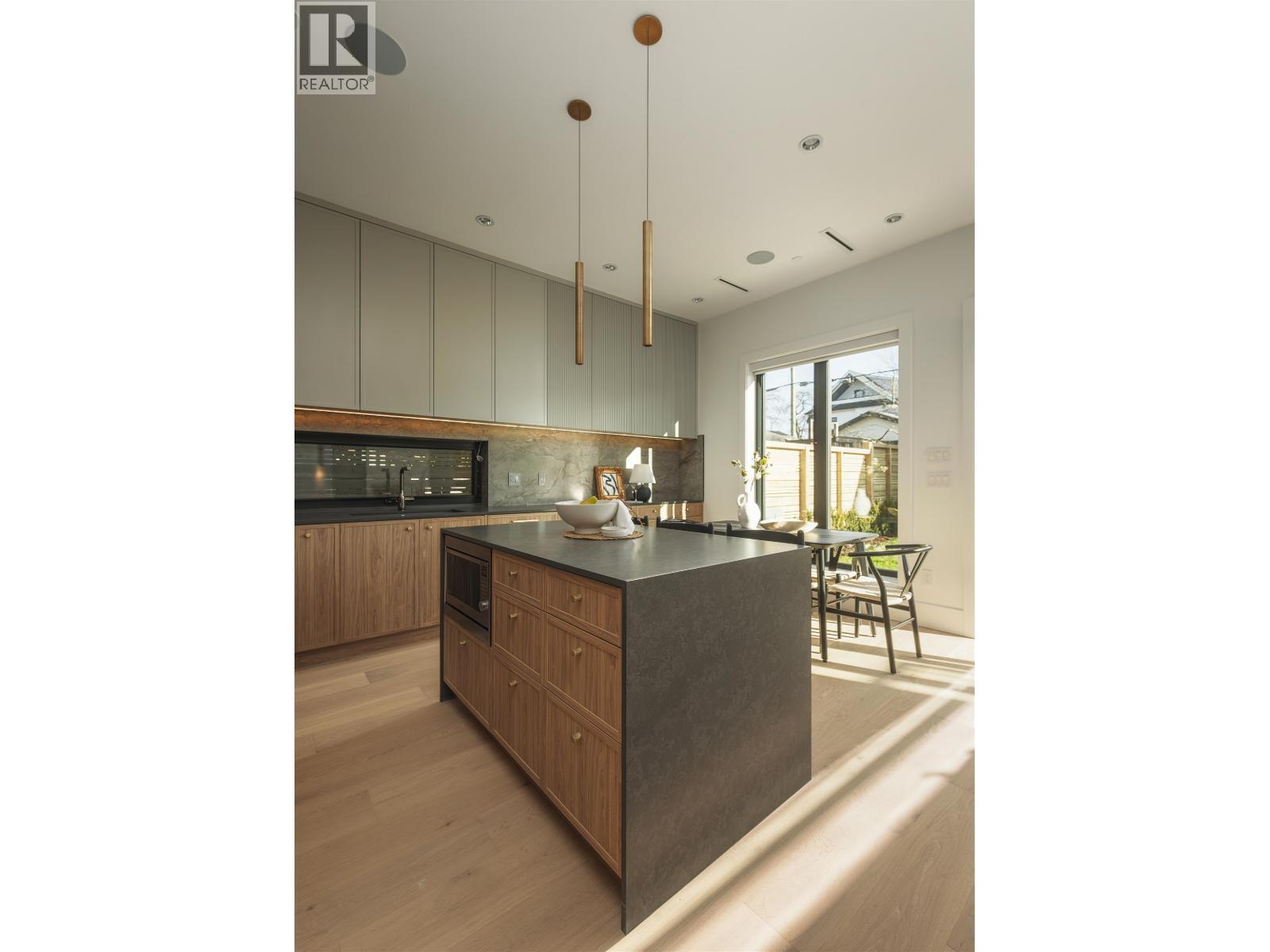 Some homes just check boxes. This one stays with you. Back unit on a quiet, tree-lined street in Hastings Sunrise. South-facing with abundant natural light and a private, full size backyard. 3 full size bedrooms each with its own ensuite - plus a powder room. A layout that feels considered, not forced. Designed by Kenzi Design House with custom lighting, millwork, tile, and a transitional aesthetic for flexible furnishing. Black-framed windows pushed to the maximum allowable and 6´ stairwell glazing pull light through every level. The third bedroom offers full height, no slope. Accordion doors open to a sun-soaked yard. Radiant heat + heat pump/AC, automated blinds, built-in speakers, security, gas BBQ hookup. Kitchen with island and window over the sink. Full-size insulated garage with epoxy - work, train, or create. Minutes to Commercial Drive, Hastings amenities, Downtown, North Shore. Hastings Elementary / Templeton Secondary. Summers at the PNE. Morala Homes: "Humble beginnings. High standards." (id:58403)