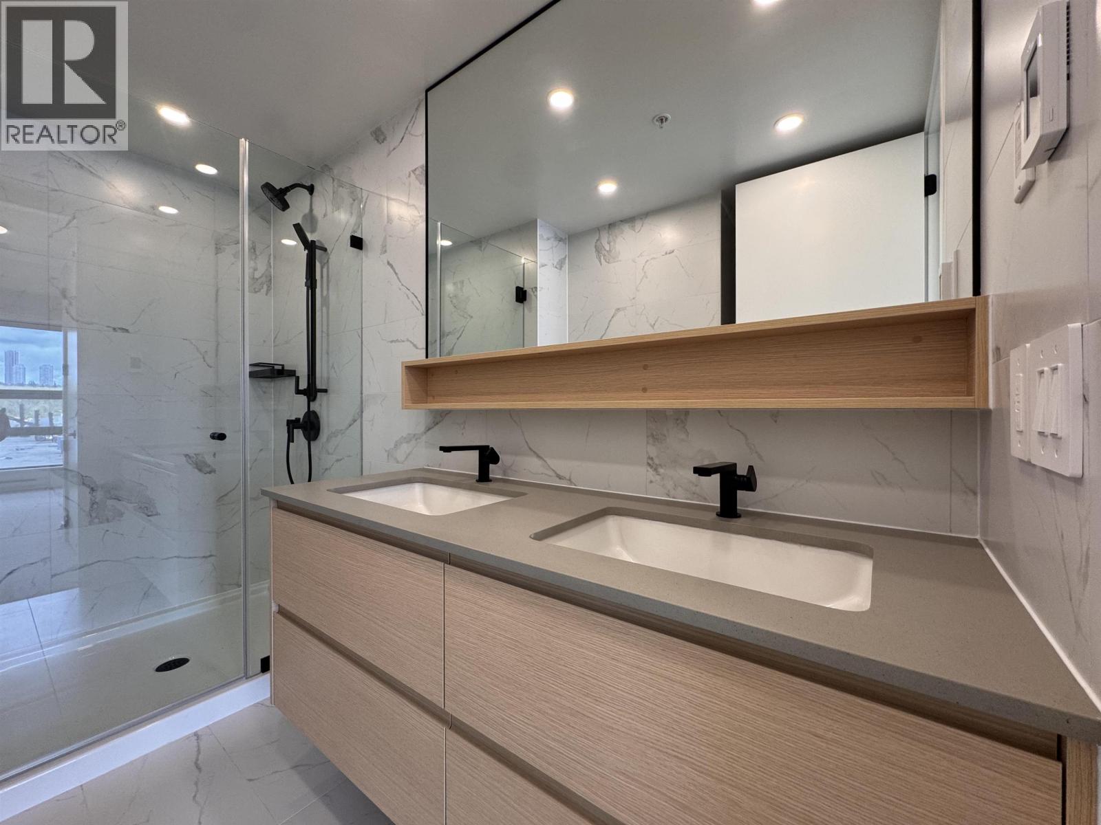 NEW PRICING & MOVE-IN READY! Welcome to Timber House by Aragon. This spacious 1,150 SF 2BR, 2 bath corner home offers lots of windows, natural light & a wide living/dining layout for flexible living & a large balcony. Modern, high-design interiors feature exposed CLT panels, wide-plank oak floors, black roller blinds & A/C. The sleek kitchen offers full size Fisher Paykel + Smeg appliances, quartz counters, matte black hardware. Spa-inspired baths feature heated floors, floating vanities & frameless glass showers. Building amenities include: Courtyard, gym, BBQ area, dog wash, 1 parking (EV-ready opt), 1 storage. Steps to the boardwalk, 12 min to DT New West, 30 min to YVR, 35 min to DT Van. OPEN HOUSE EVERY SAT TO MON 1-4PM OR BY APPT. (id:58403)