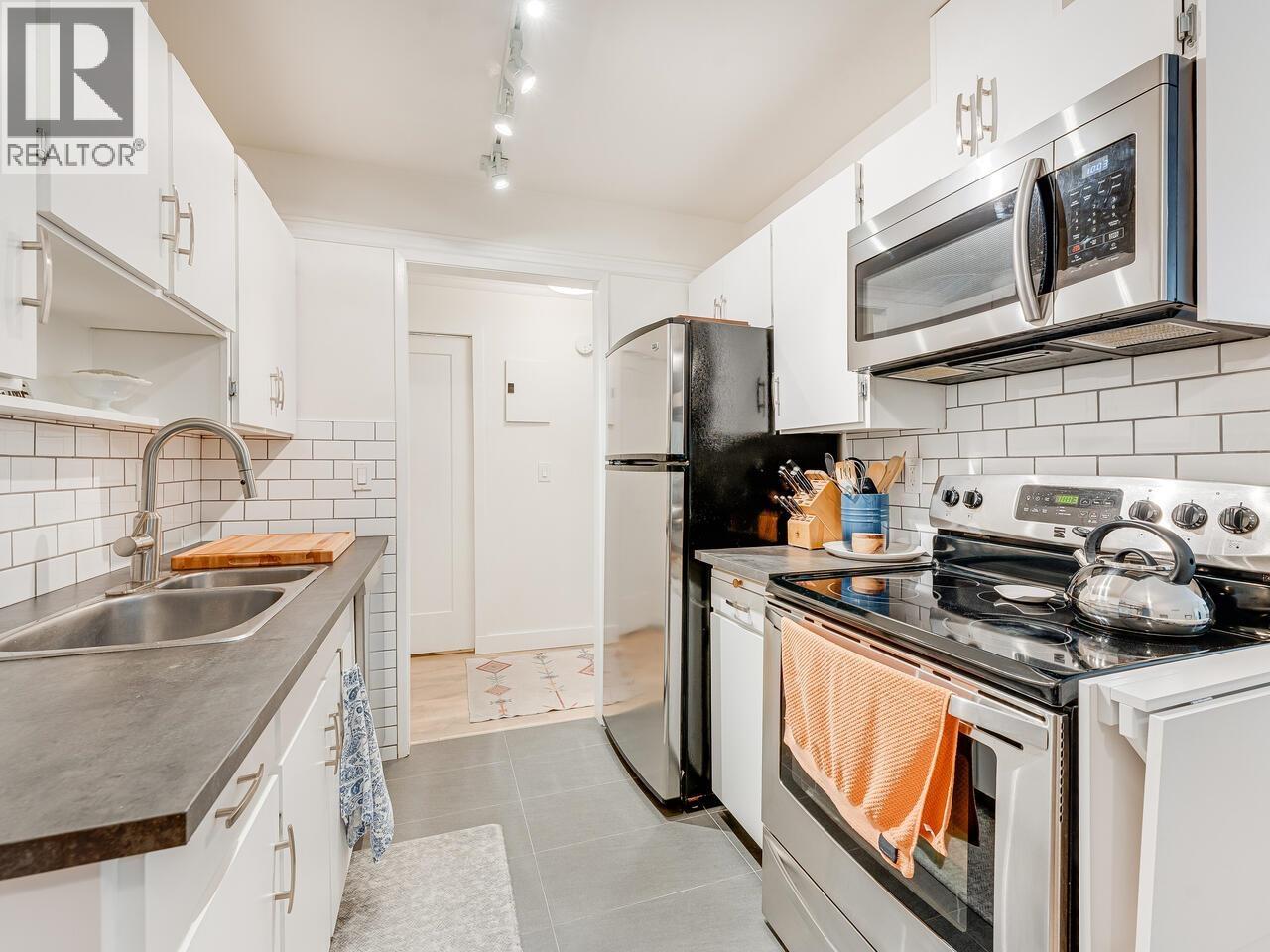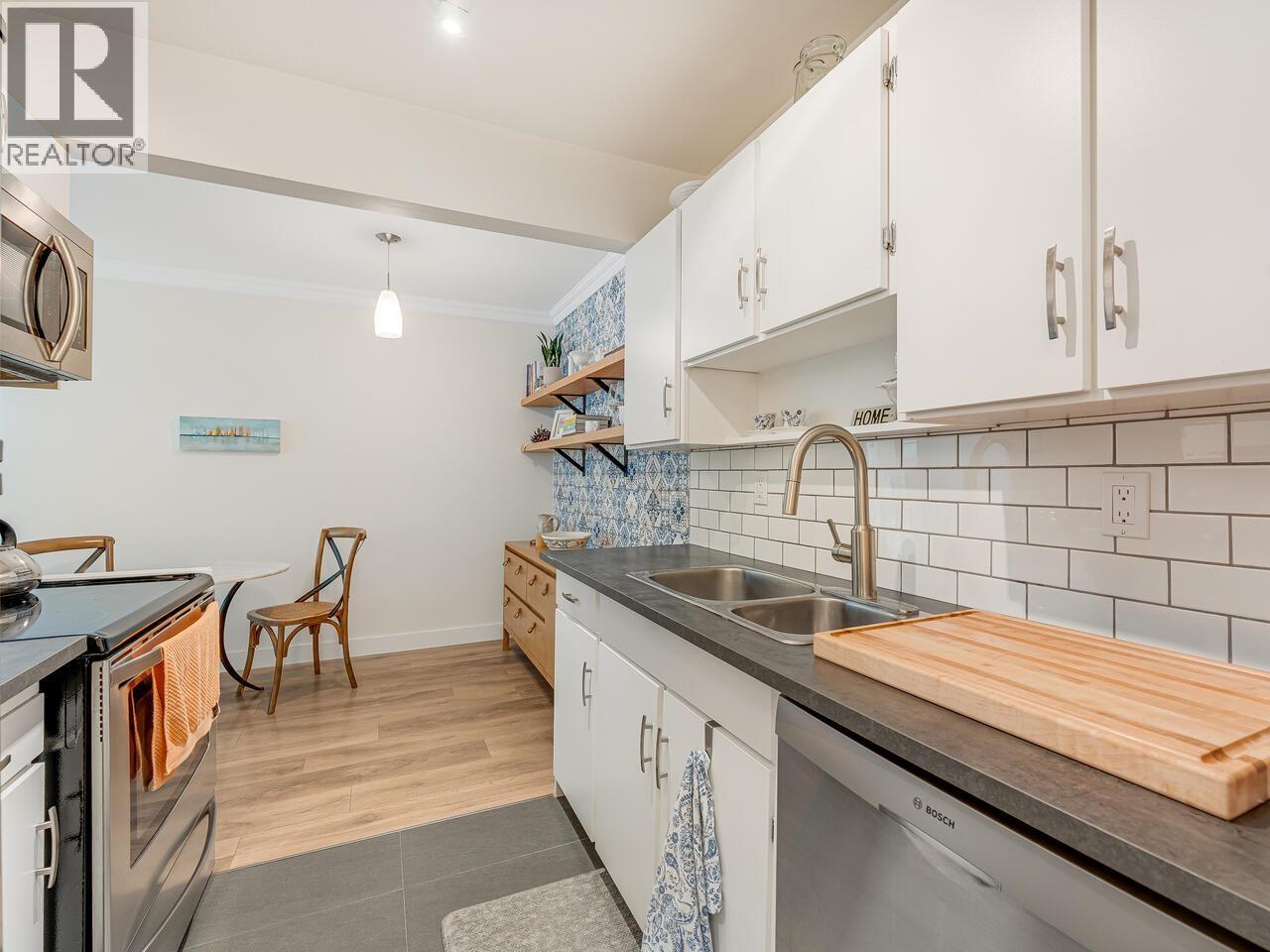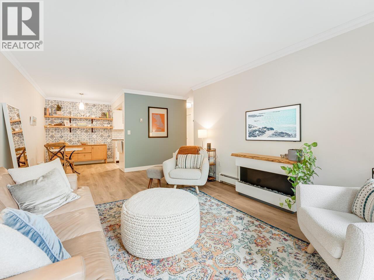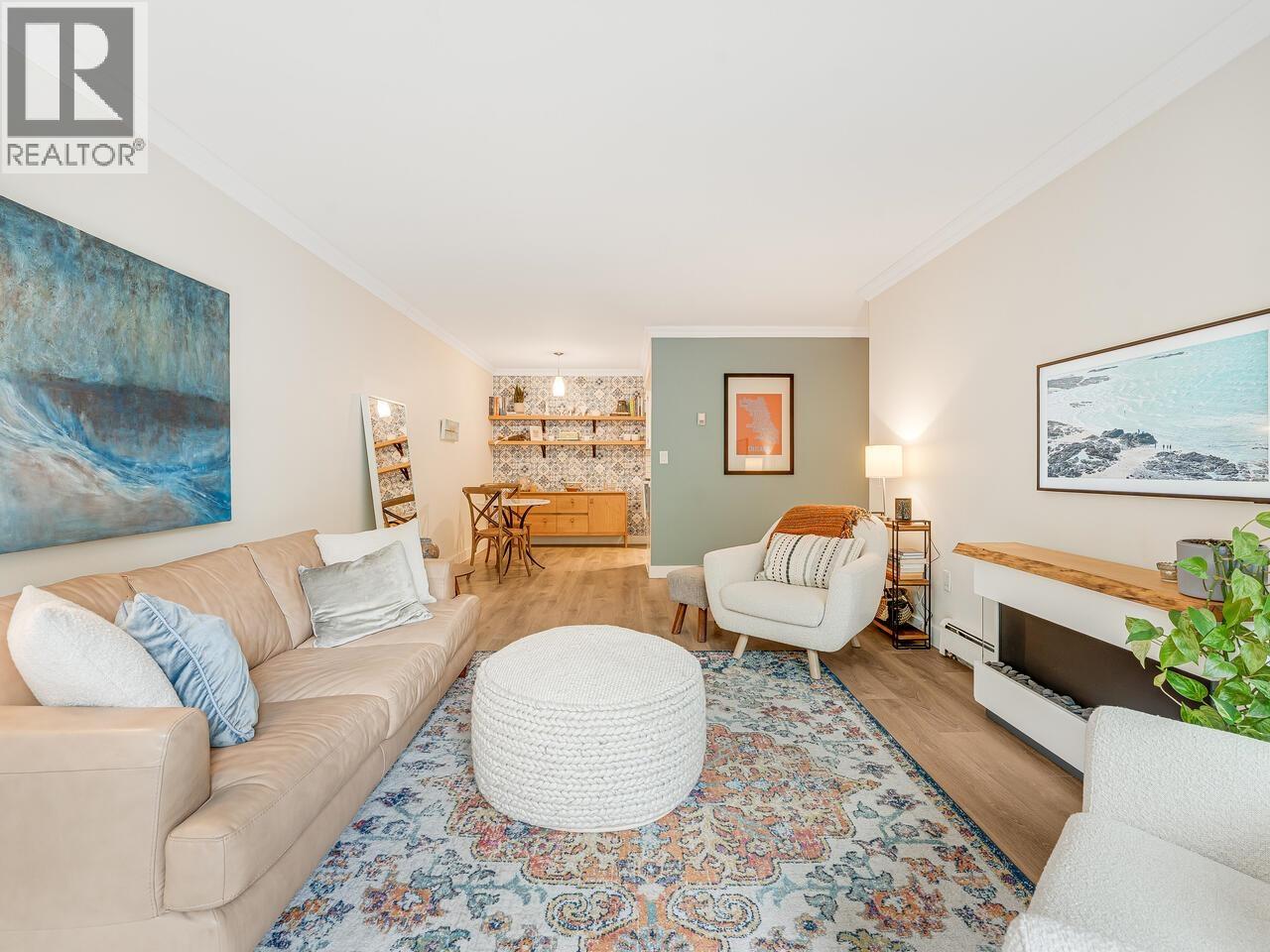 This inviting home at the Landmark Mariner is a pleasure to show. Updated throughout, it´s both beautiful & comfortable. With a wall of windows the light is amazing & the sliding door onto the oversized private patio extends your living area, looking & feeling extra spacious. Indoor/outdoor living can be enjoyed throughout the year with this partially covered outdoor sanctuary. New planters, thoughtfully landscaped & so, so quiet. The building recently completed their exterior renewal with new windows, balconies & rain screen. A well run, friendly place in a central location, with easy access to downtown, the north shore & highway. Lots of restaurants & amenities nearby too. Pets welcome, storage & parking. This unit is one of the few with in-suite laundry. (id:58403)
