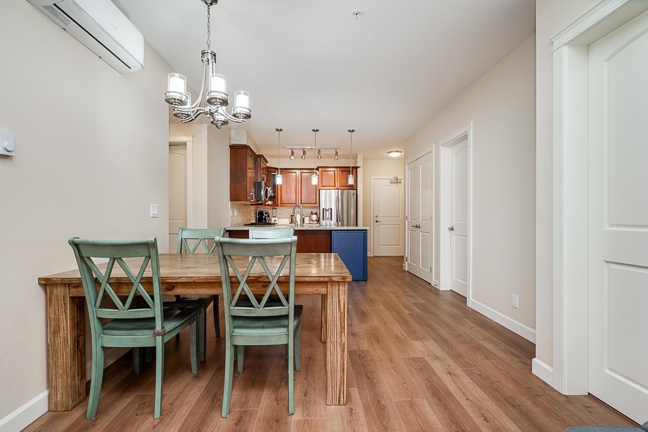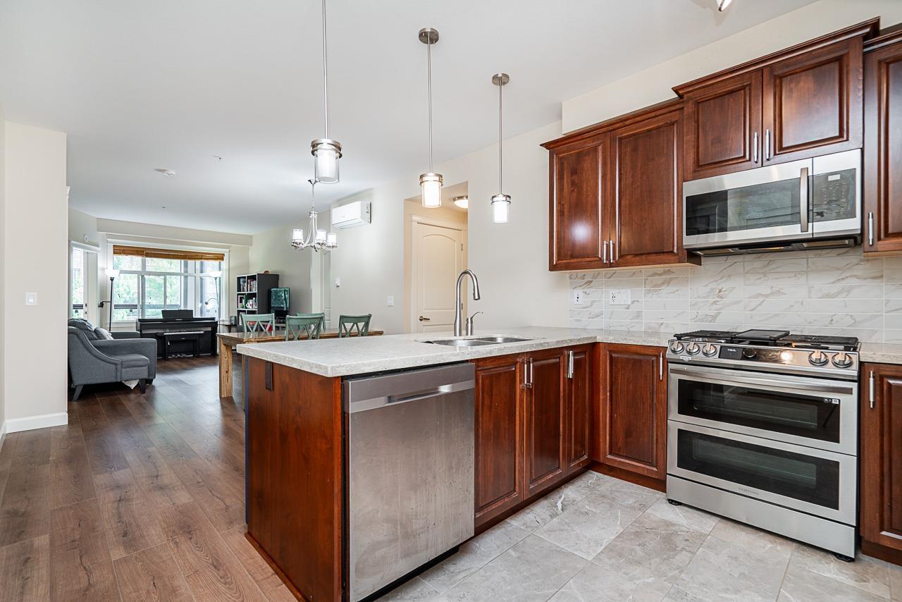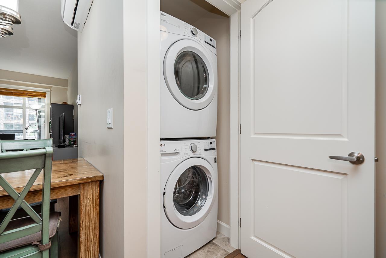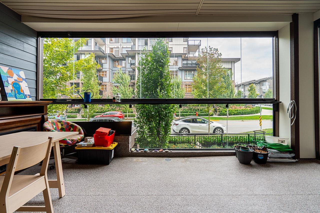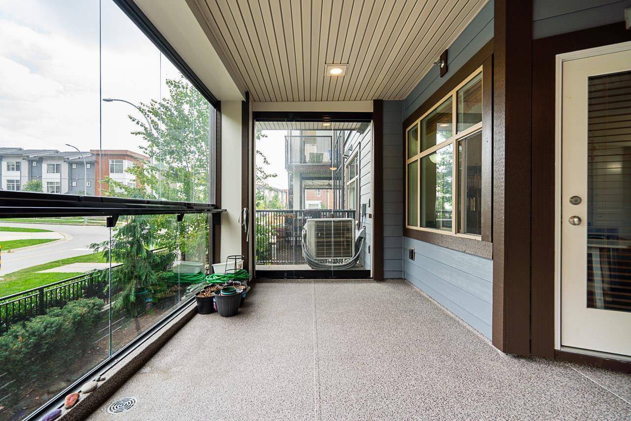 Yorkson Park - 2 Bed + 2 Bath + Den + Storage Unit. Functional layout with 2 large bedrooms across from each other- giving extra privacy, enclosed solarium with gas BBQ hook-up (gas included in strata fees), and 2 parking stalls with EV-capable rolling door storage by the parking space. Features include energy-efficient heat pump and A/C in every room, Samsung appliances, quartz countertops, heated bathroom floors with anti-fog mirrors, solid wood doors and closets, kitchen looking out to living area with ample cabinet space, European laminate flooring, Hybrid concrete and wood construction for quieter living. Convenient location across from Carvolth Park & Ride and beside the new 1.3-acre City Park. (id:58403)