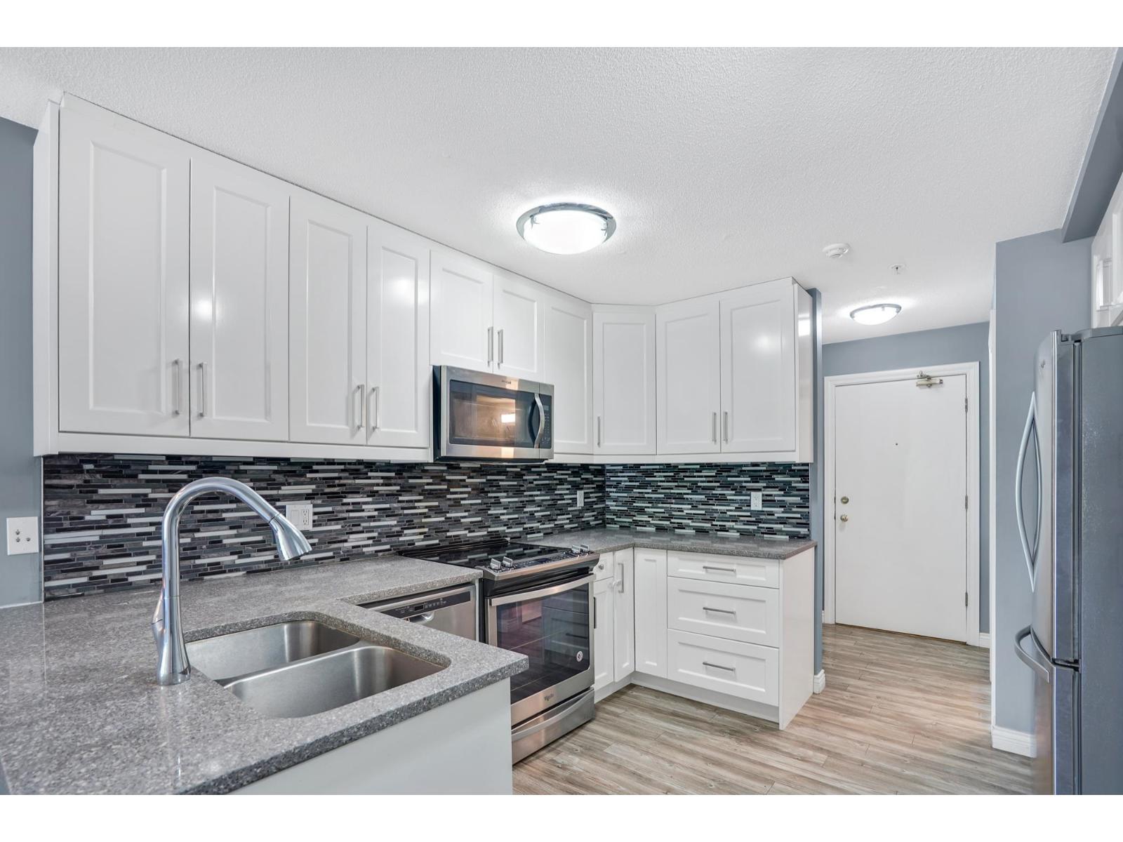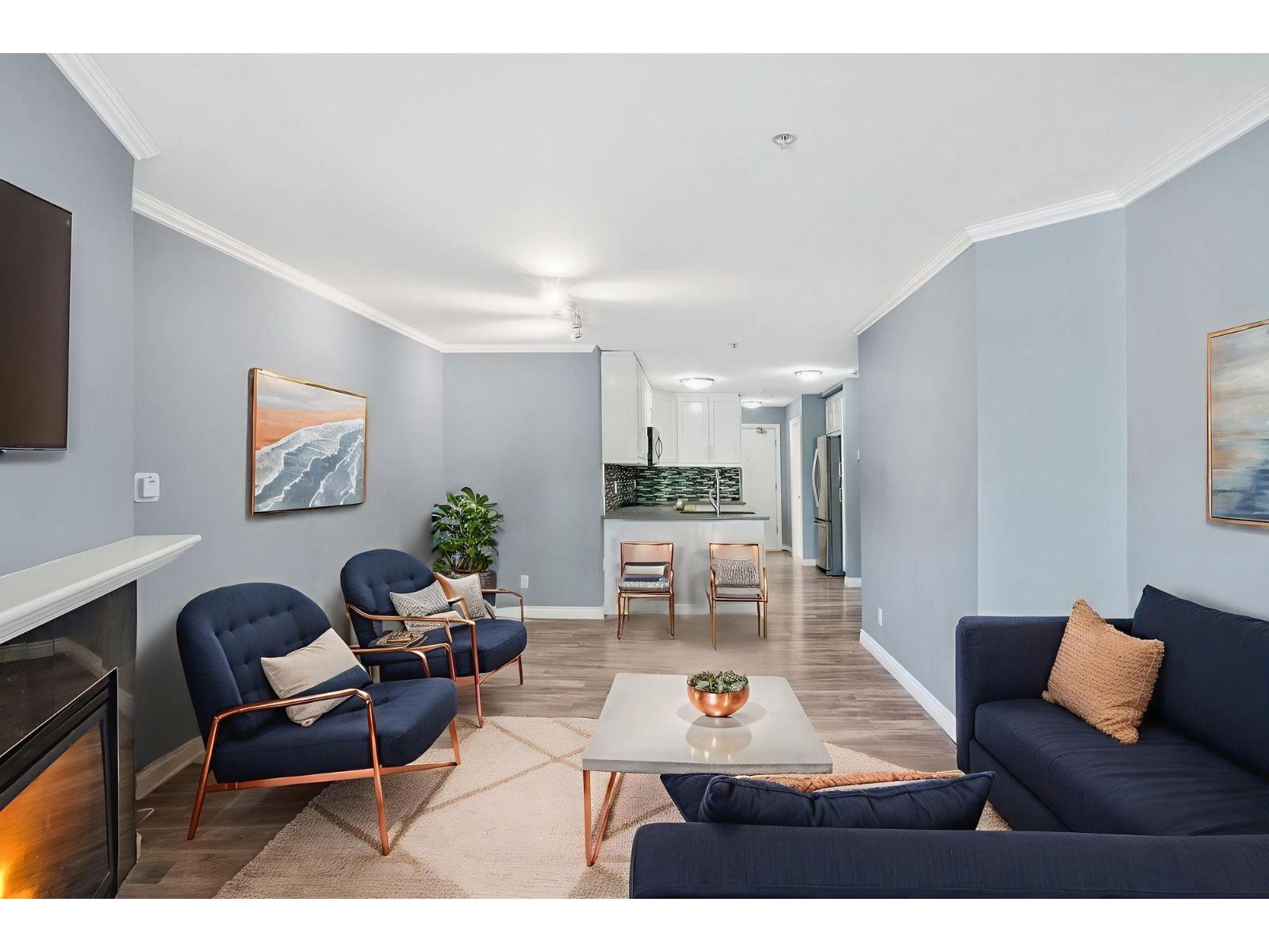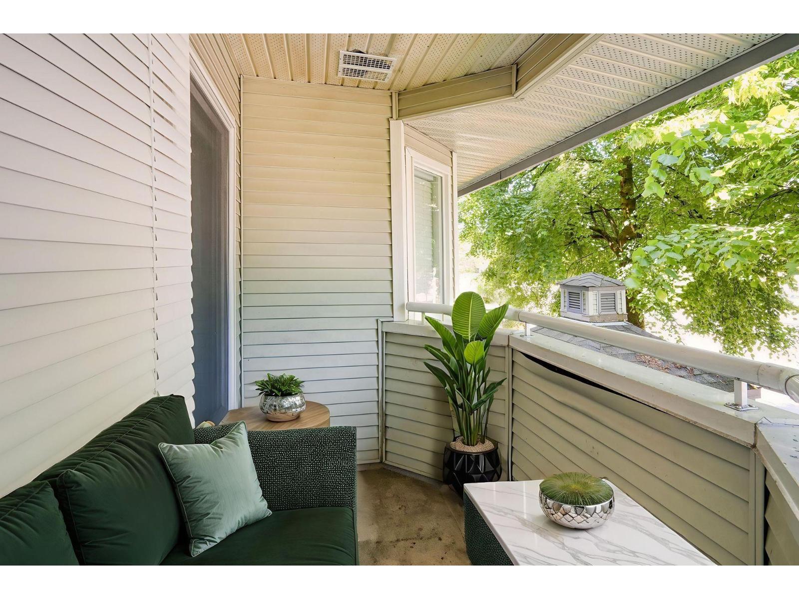 Looking for more room without breaking the bank? This fully renovated 1-bedroom checks every box. The king-sized bedroom easily fits all your furniture (yes, even the Peloton!) and connects to a cheater ensuite for everyday convenience. Love to cook? You'll appreciate the roomy, thoughtfully designed kitchen with full-sized stainless steel appliances and plenty of counter space. The open living and dining area features a cozy gas fireplace and large windows that fill the home with natural light and peaceful treed views. Step out to your private patio for morning coffee or evening wine surrounded by greenery-it's your own little escape. All this in a walkable location close to transit, shops, restaurants, and schools-everything you need, right where you want to be. Showings by appt only. (id:58403)