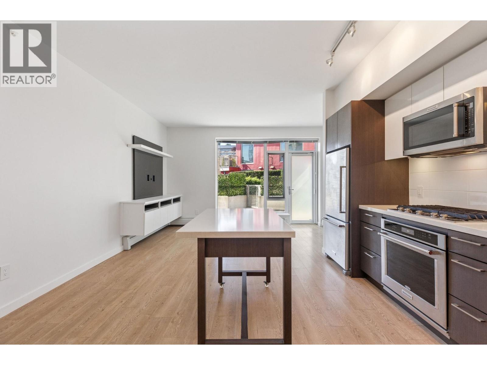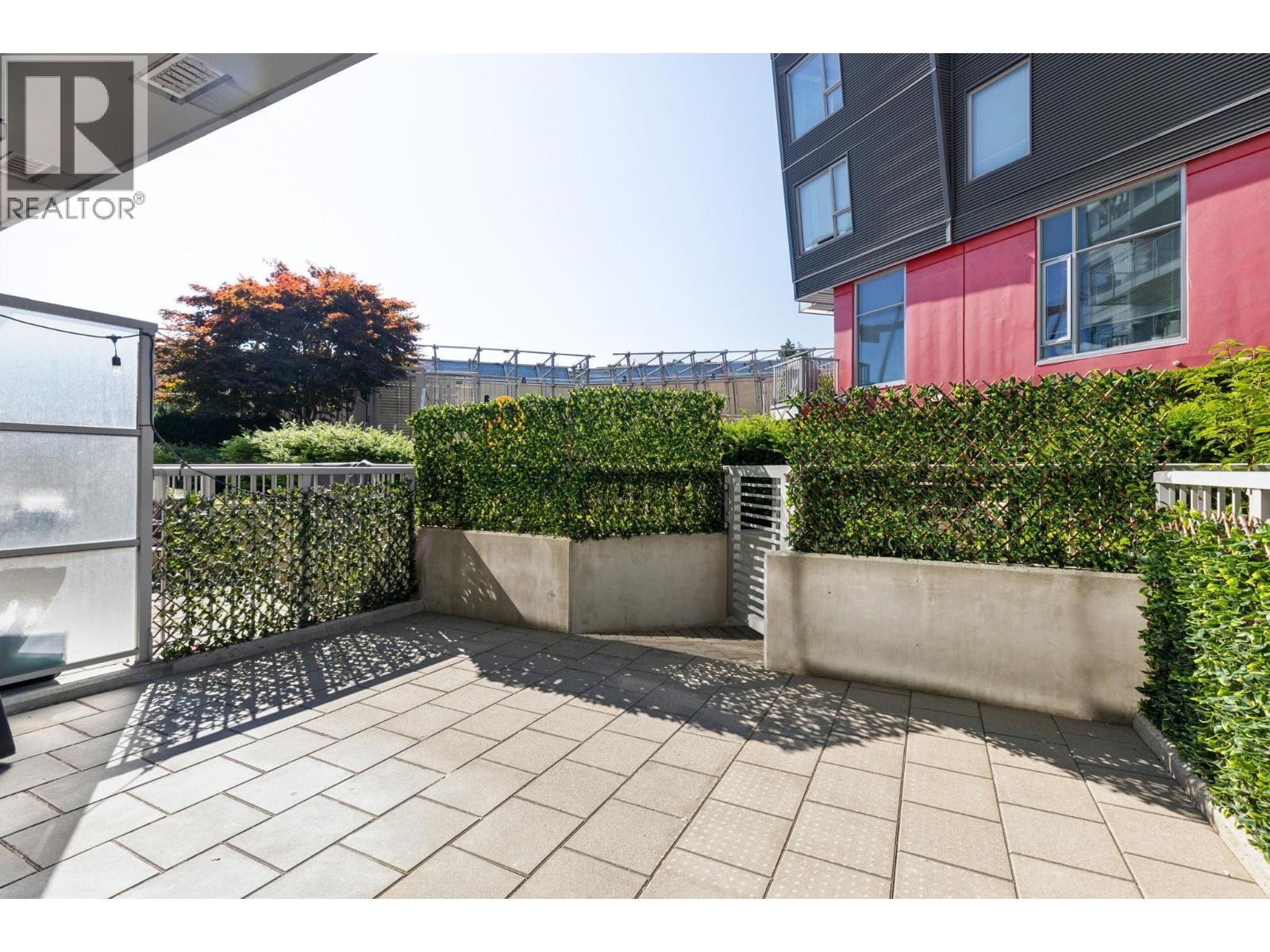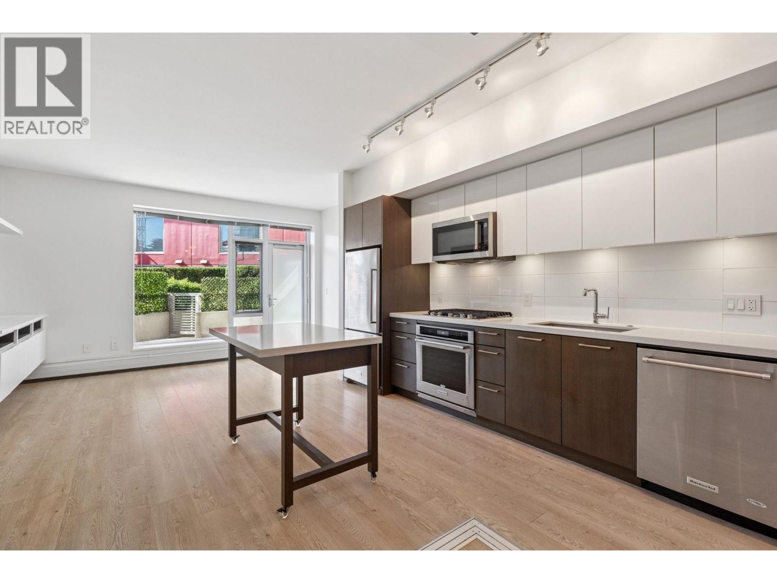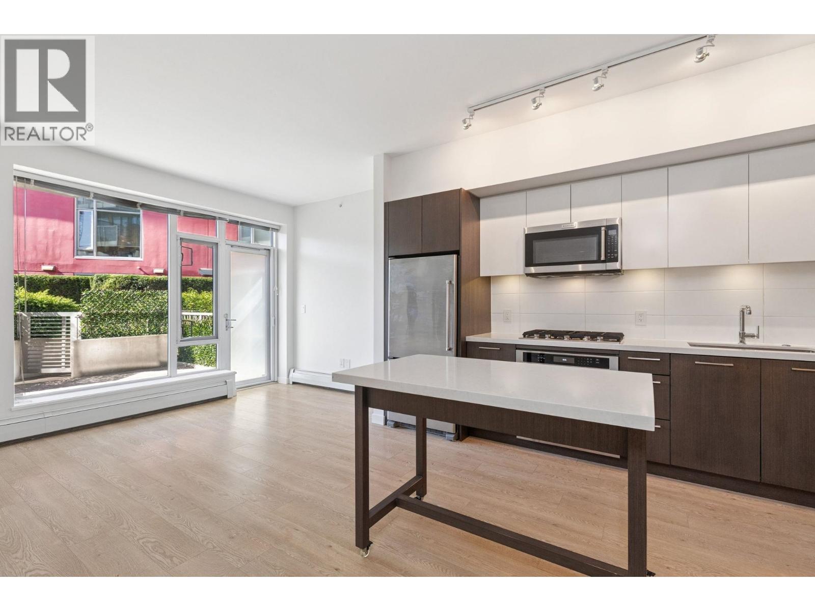 SUNNY GARDEN TERRACE HOME AT CANVAS. This contemporary 1 bedroom home is super functional and charming. Appreciate a chef's kitchen with full sized, stainless steel appliances including gas cooktop, over-height cabinetry and stone counters, flowing on durable laminate flooring into the dining area with movable island and living room with built-in media centre leading onto the sunny 182SF terrace with private entry/gas hook-up. This urban home features 9' ceilings and spacious bathroom with oversized vanity, deep soaker tub and in-floor radiant heating. Extensive amenities include fitness centre, lounge, garden and workshop. Includes 1 parking & 1 storage locker. Steps to Mount Pleasant's best restaurants, breweries, Seawall and new SkyTrain at Email Carr. *OPEN HOUSE SEPT 28, SUN 2-4PM* (id:58403)