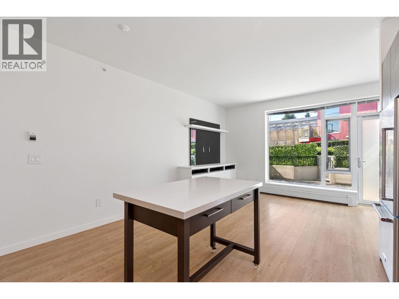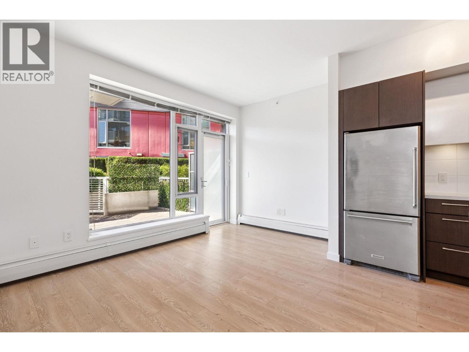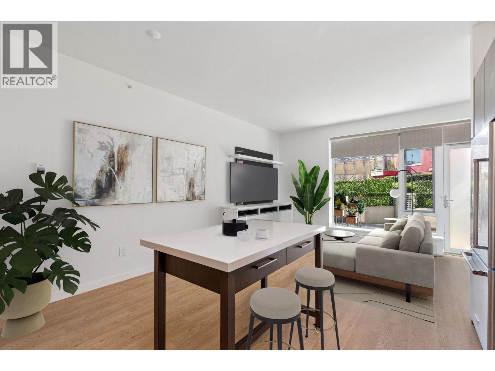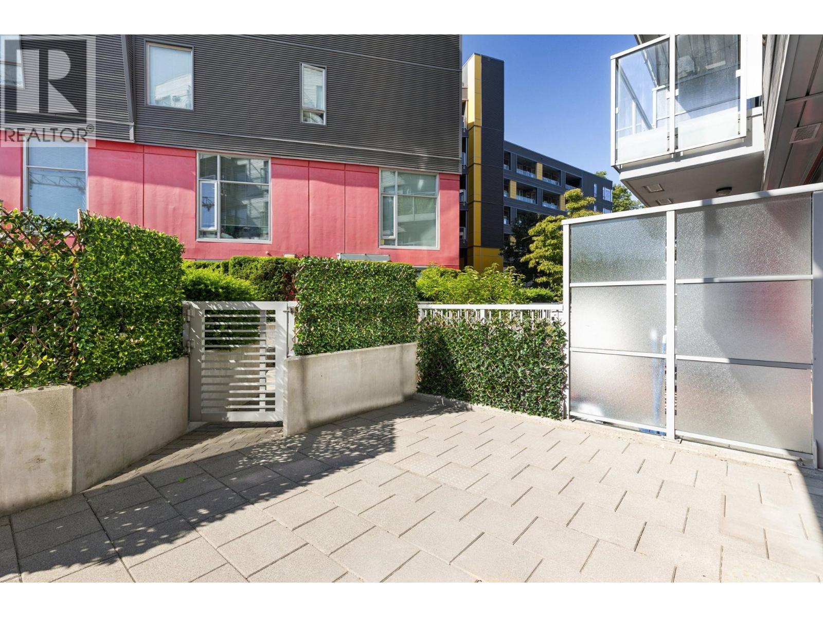 SUNNY GARDEN TERRACE HOME AT CANVAS. This contemporary 1 bedroom home is super functional and charming. Appreciate a chef's kitchen with full sized, stainless steel appliances including gas cooktop, over-height cabinetry and stone counters, flowing on durable laminate flooring into the dining area with movable island and living room with built-in media centre leading onto the sunny 182SF terrace with private entry/gas hook-up. This urban home features 9' ceilings and spacious bathroom with oversized vanity, deep soaker tub and in-floor radiant heating. Extensive amenities include fitness centre, lounge, garden and workshop. Includes 1 parking & 1 storage locker. Steps to Mount Pleasant's best restaurants, breweries, Seawall and new SkyTrain at Email Carr. *OPEN HOUSE SEPT 28, SUN 2-4PM* (id:58403)