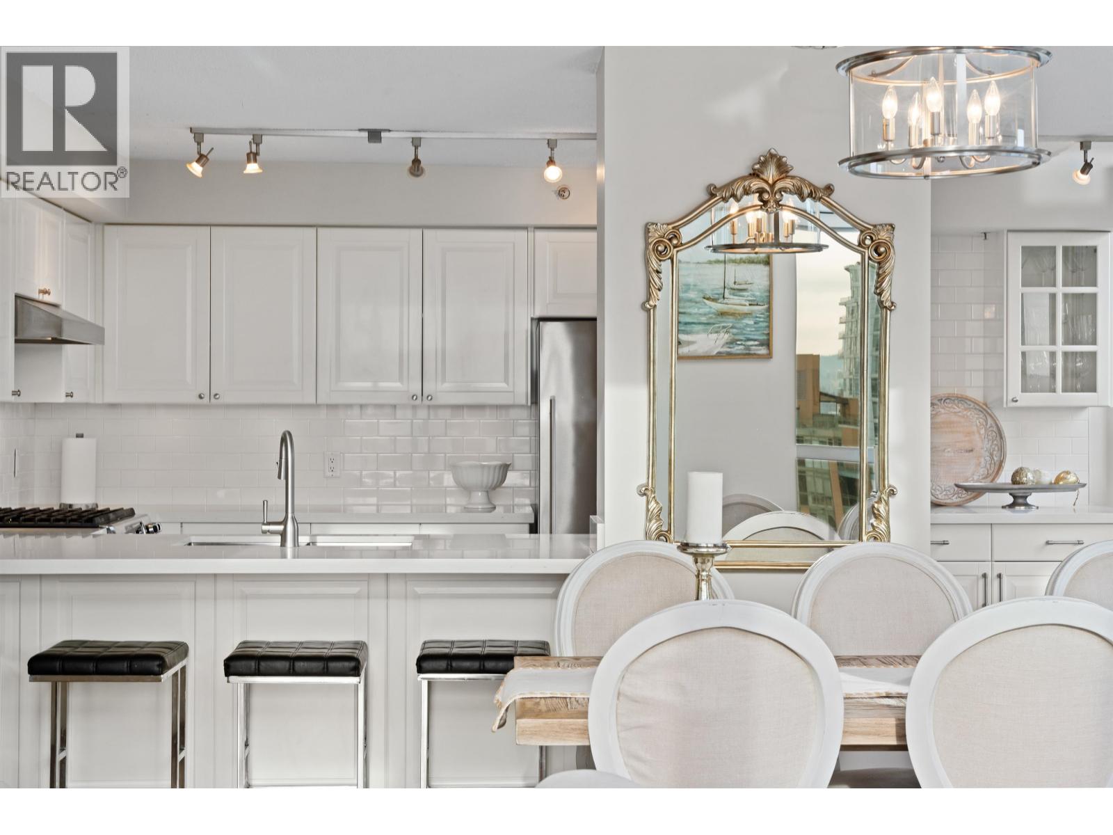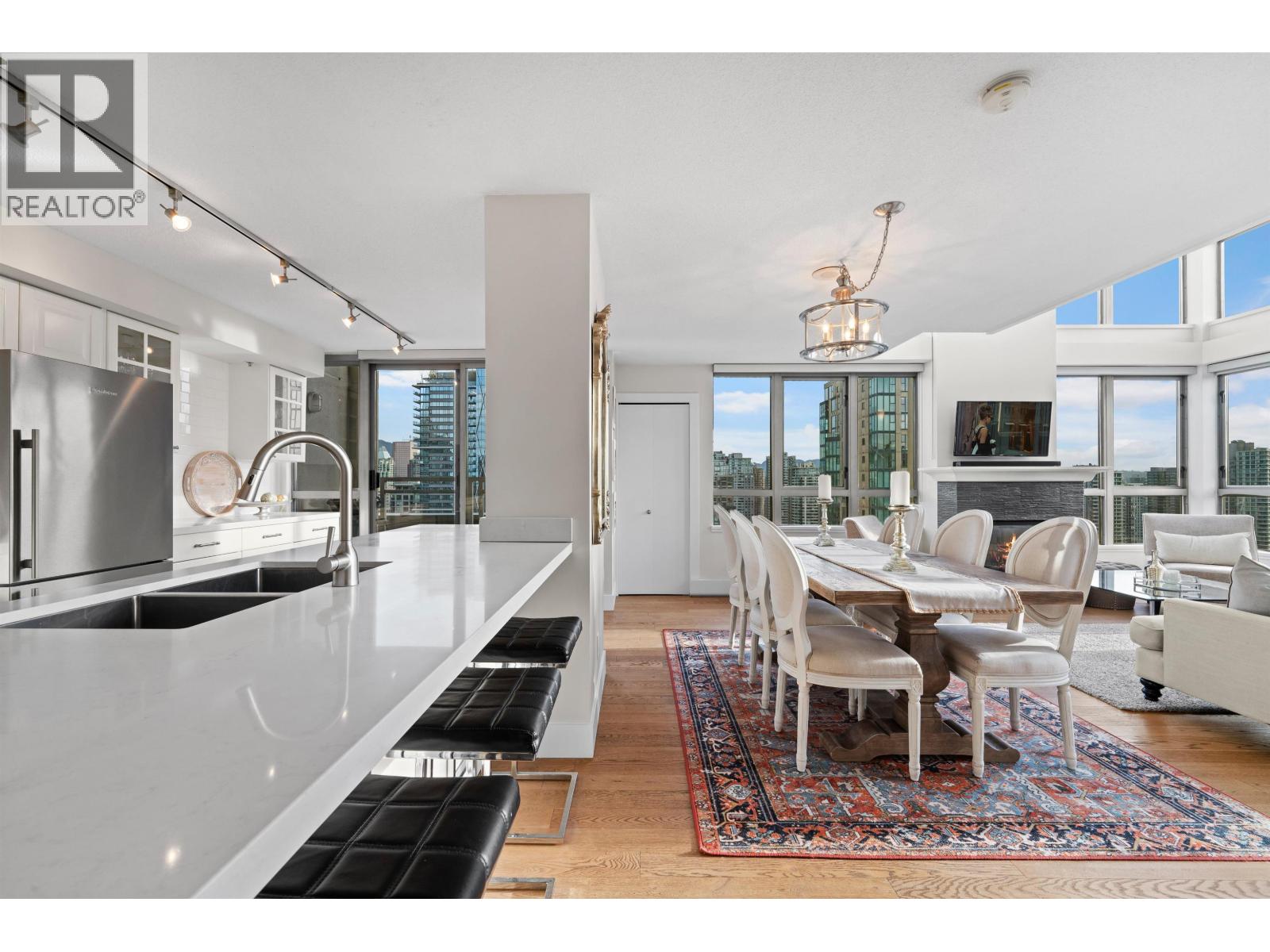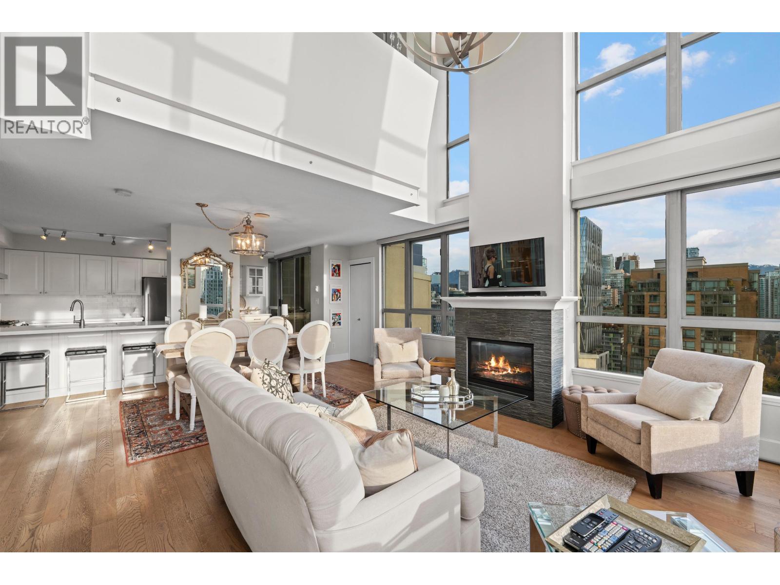 A true Yaletown icon. With 1,542 square ft of living space, 16-foot ceilings, and panoramic city-to-mountain views, this bright two-level corner loft at The Metropolis delivers both style and comfort. The fluid layout merges a granite-clad kitchen and open dining area with a dramatic double-height living room wrapped in glass and filled with natural light. Upstairs, the mezzanine reveals the primary suite with dual closets, ensuite, and a versatile den. A second bedroom on the main level provides ideal separation for guests. Set within a well-managed concrete building all just steps from the Seawall, parks, cafés, and Yaletown shopping. (id:58403)