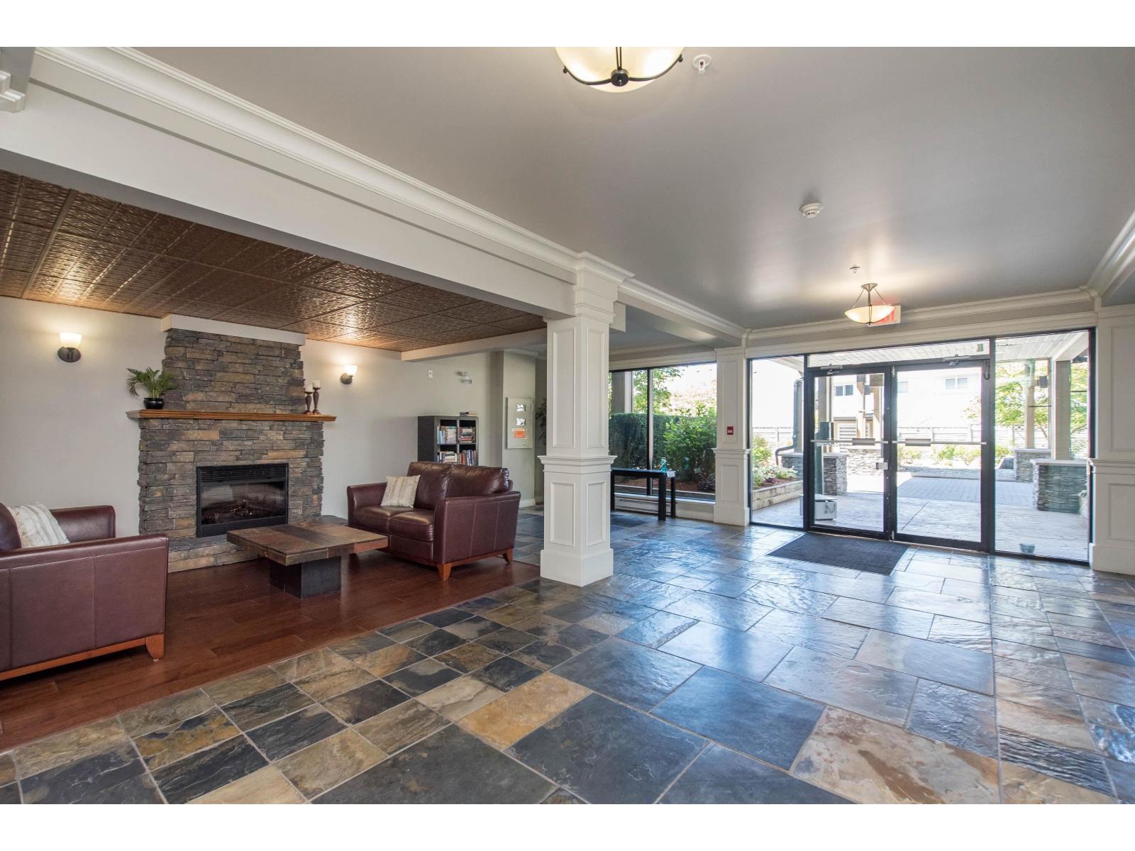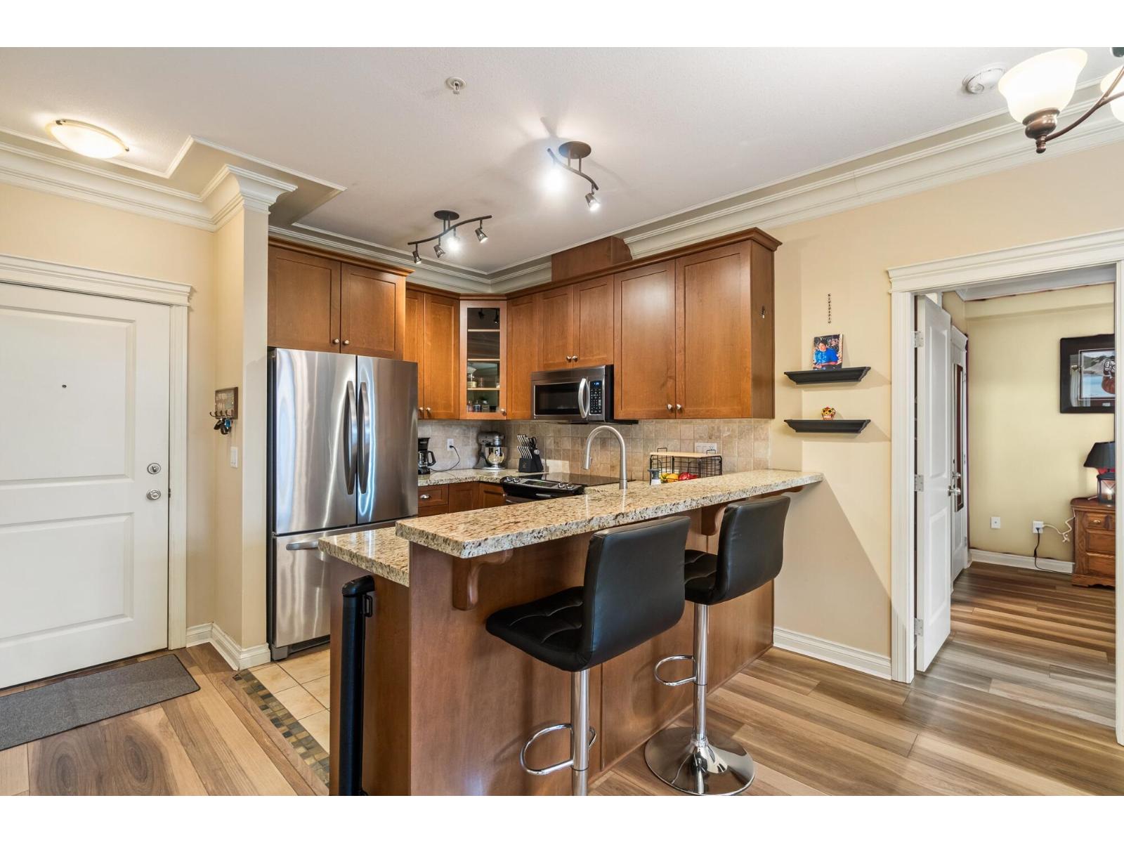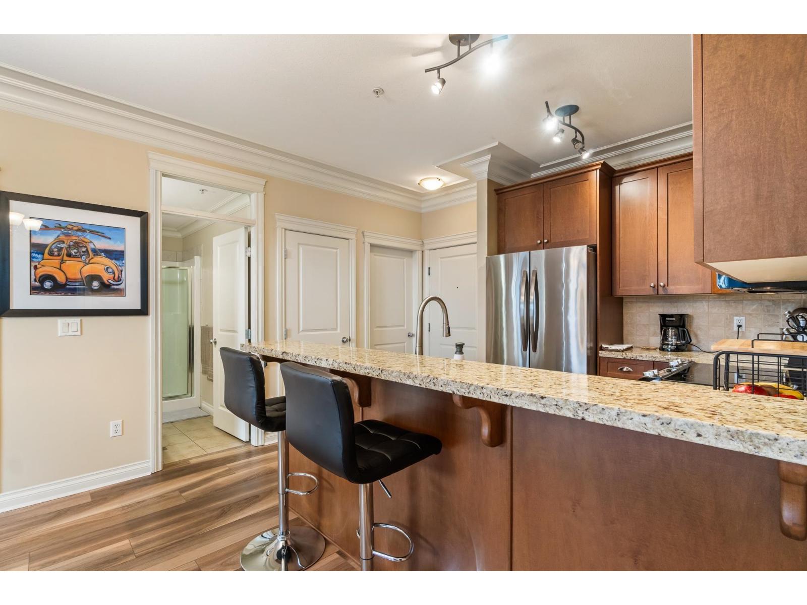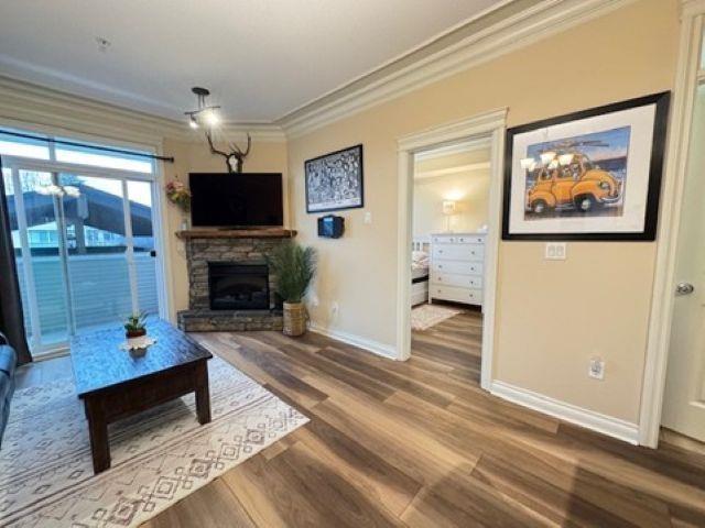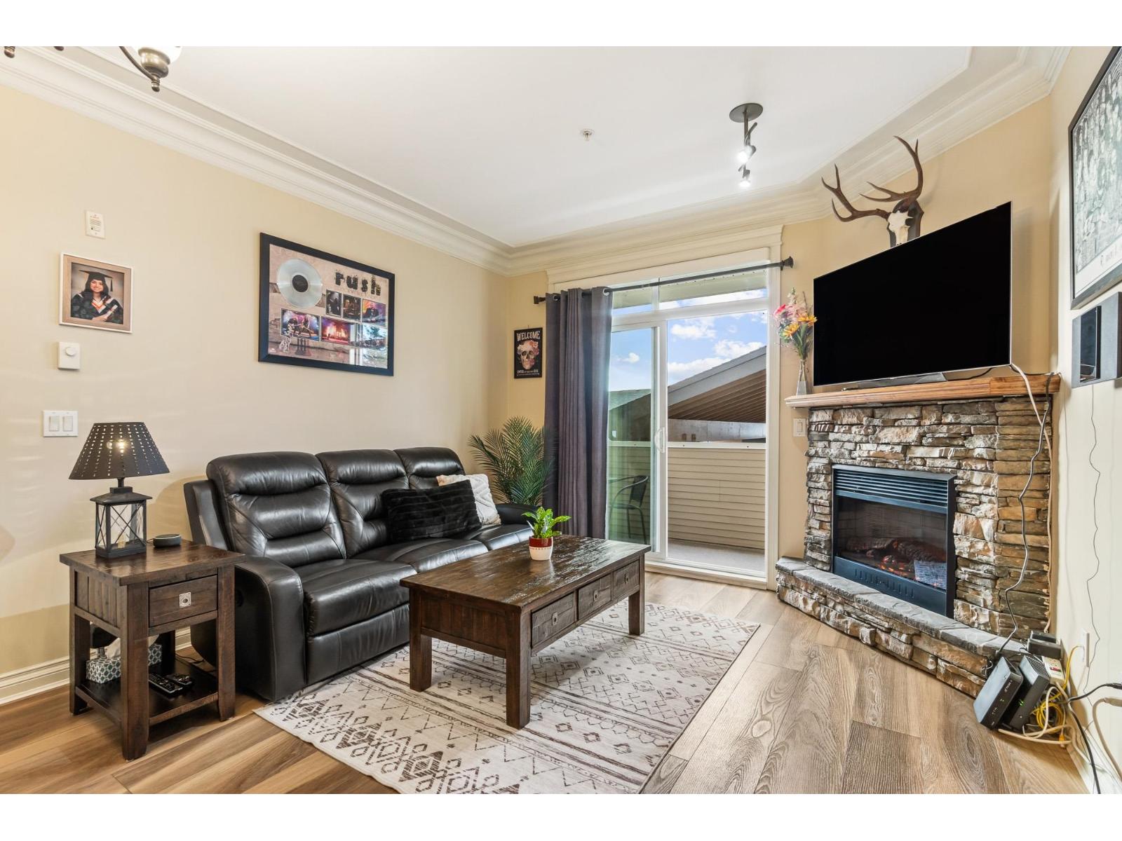 Immaculate, Modern & Move-In Ready! Tucked inside a quiet, gated community, this quality-built 2 bed, 2 bath home checks every box. With 9' ceilings, a cozy stone fireplace, crown mouldings, & sun-filled windows, the open layout feels bright & inviting. The kitchen boasts granite counters & flows into a rare oversized laundry room with pantry & extra storage, a true bonus! Both bedrooms are generous in size; the primary easily fits a king bed & features a walk-in closet + spa-inspired ensuite with soaker tub, double sinks & heated floors. Recent updates include a new washer/dryer, hot water tank & flooring. Step out to your west-facing balcony and enjoy peaceful sunsets. Well-managed strata with NEW ROOF, LOW strata fees. Walk to shops, transit, schools & recreation. (id:58403)