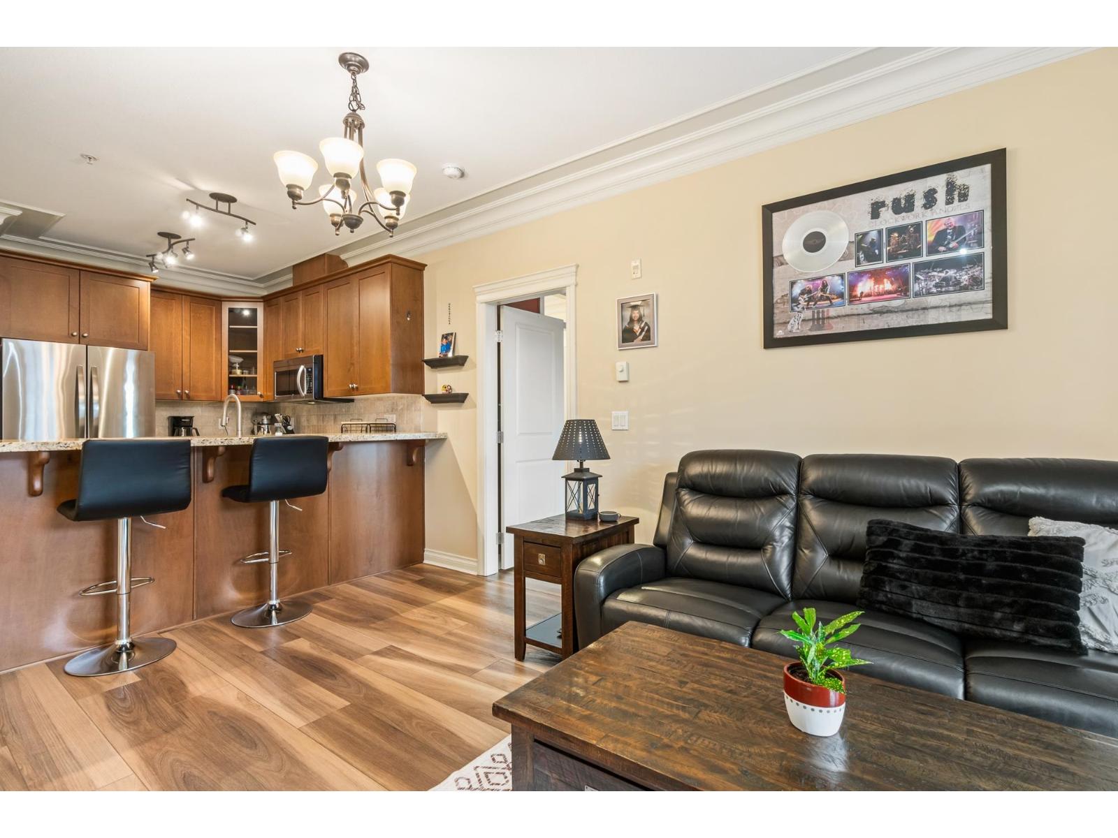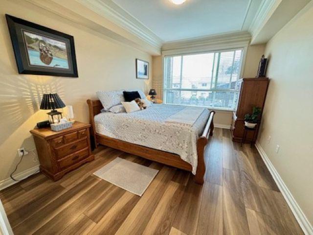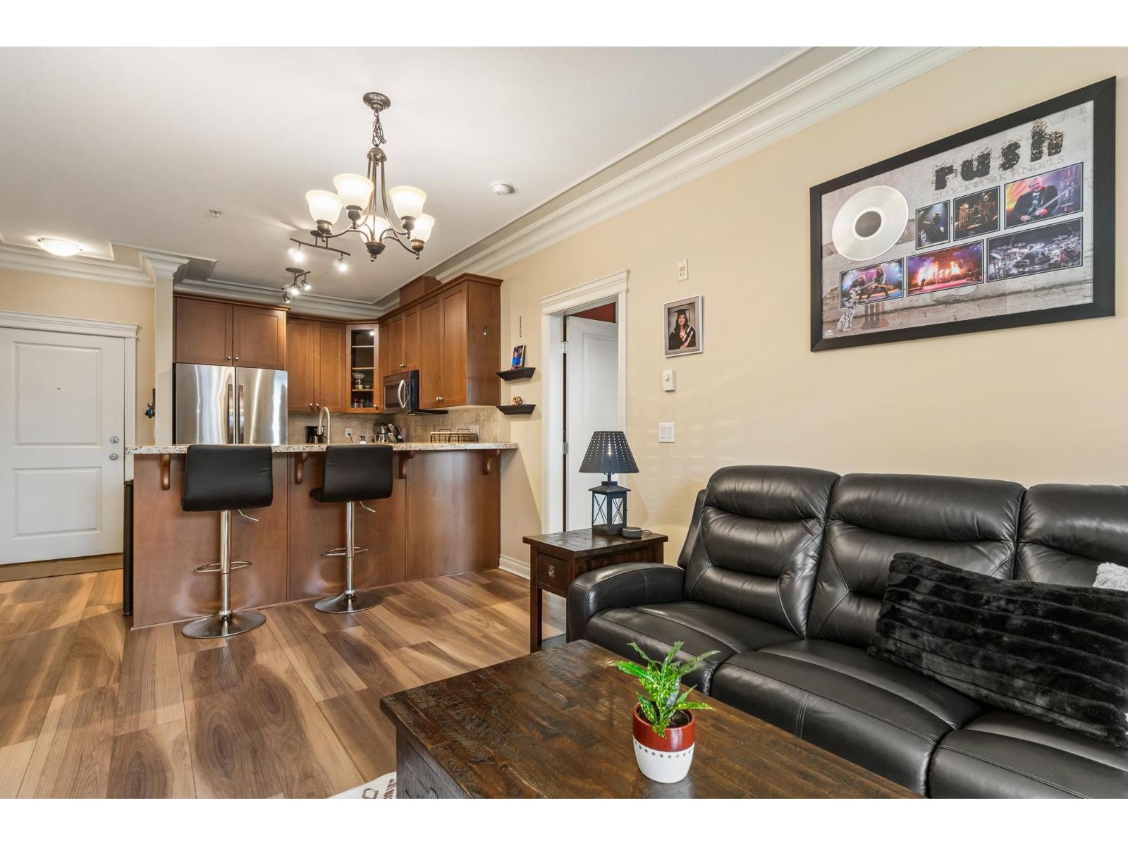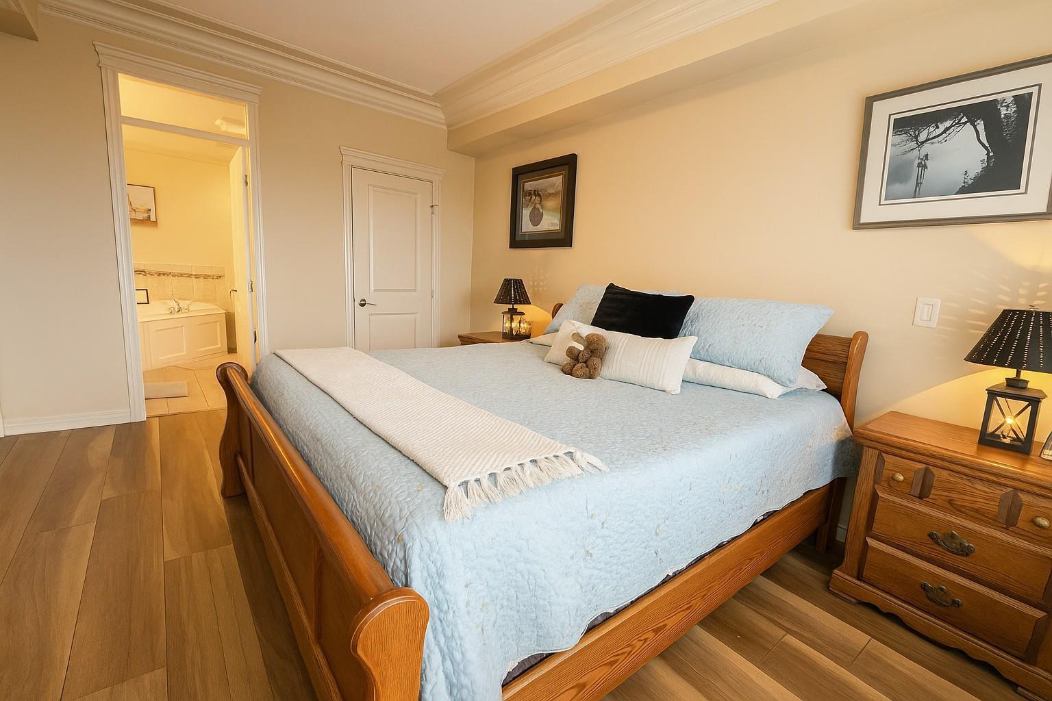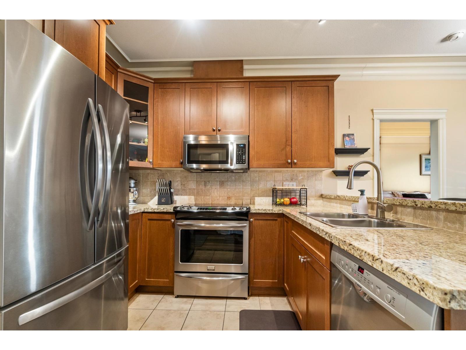 Immaculate, Modern & Move-In Ready! Tucked inside a quiet, gated community, this quality-built 2 bed, 2 bath home checks every box. With 9' ceilings, a cozy stone fireplace, crown mouldings, & sun-filled windows, the open layout feels bright & inviting. The kitchen boasts granite counters & flows into a rare oversized laundry room with pantry & extra storage, a true bonus! Both bedrooms are generous in size; the primary easily fits a king bed & features a walk-in closet + spa-inspired ensuite with soaker tub, double sinks & heated floors. Recent updates include a new washer/dryer, hot water tank & flooring. Step out to your west-facing balcony and enjoy peaceful sunsets. Well-managed strata with NEW ROOF, LOW strata fees. Walk to shops, transit, schools & recreation. (id:58403)