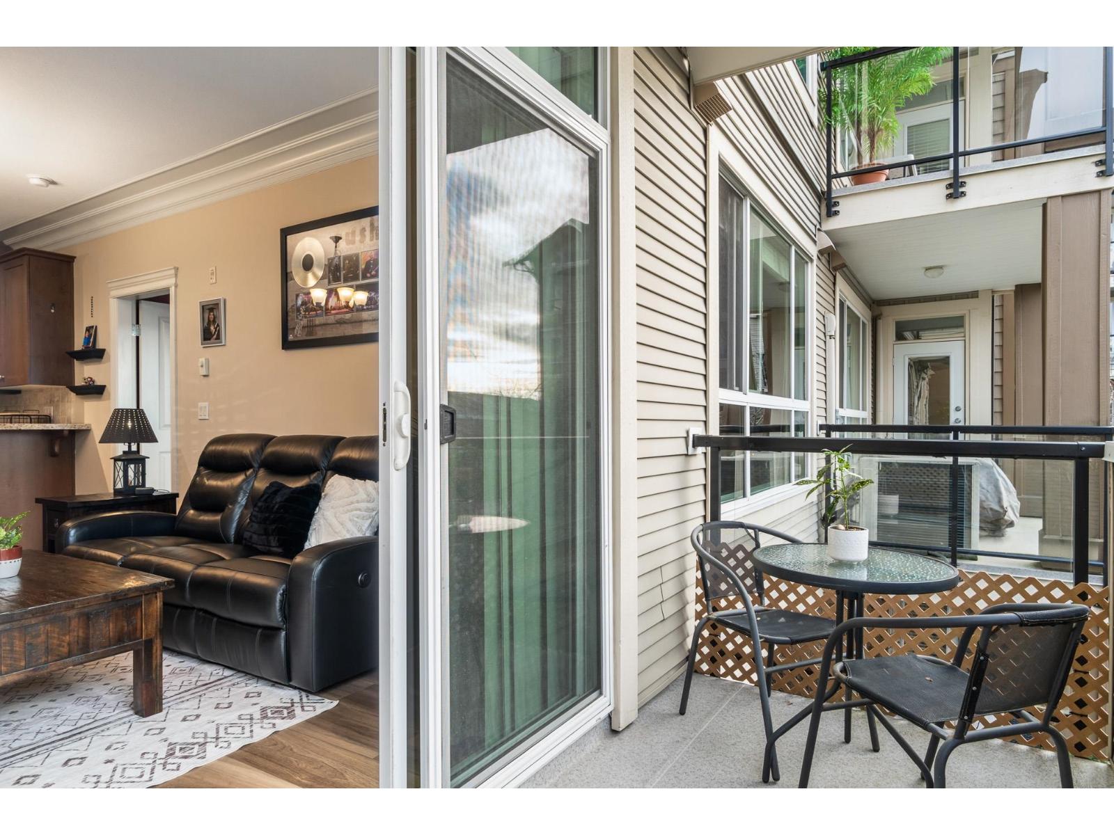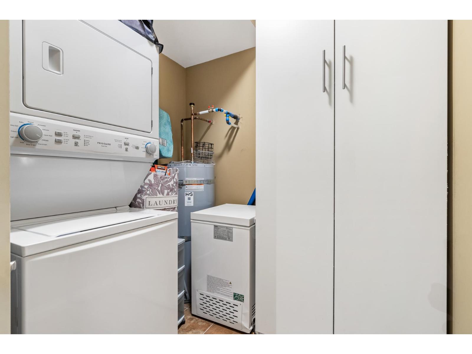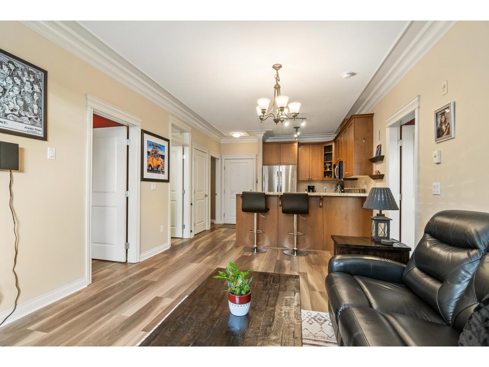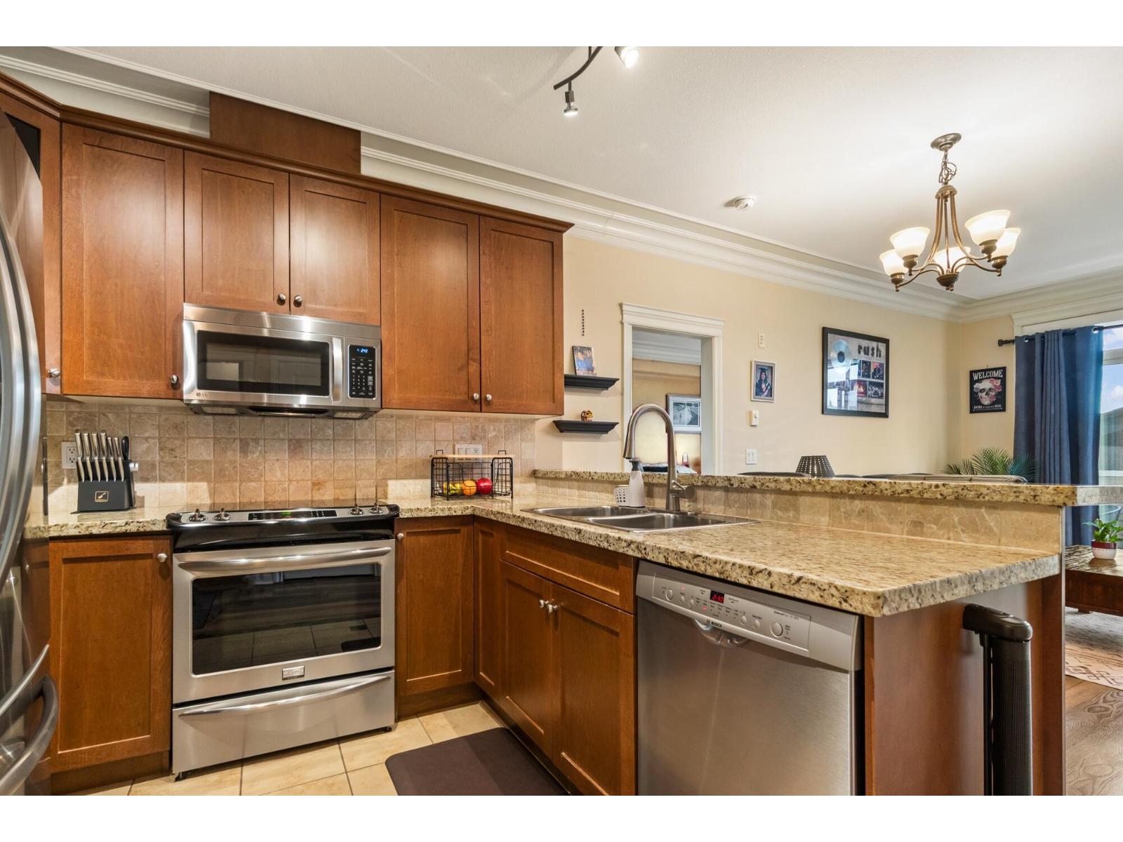 Immaculate, Modern & Move-In Ready! Tucked inside a quiet, gated community, this quality-built 2 bed, 2 bath home checks every box. With 9' ceilings, a cozy stone fireplace, crown mouldings, & sun-filled windows, the open layout feels bright & inviting. The kitchen boasts granite counters & flows into a rare oversized laundry room with pantry & extra storage, a true bonus! Both bedrooms are generous in size; the primary easily fits a king bed & features a walk-in closet + spa-inspired ensuite with soaker tub, double sinks & heated floors. Recent updates include a new washer/dryer, hot water tank & flooring. Step out to your west-facing balcony and enjoy peaceful sunsets. Well-managed strata with NEW ROOF, LOW strata fees. Walk to shops, transit, schools & recreation. (id:58403)