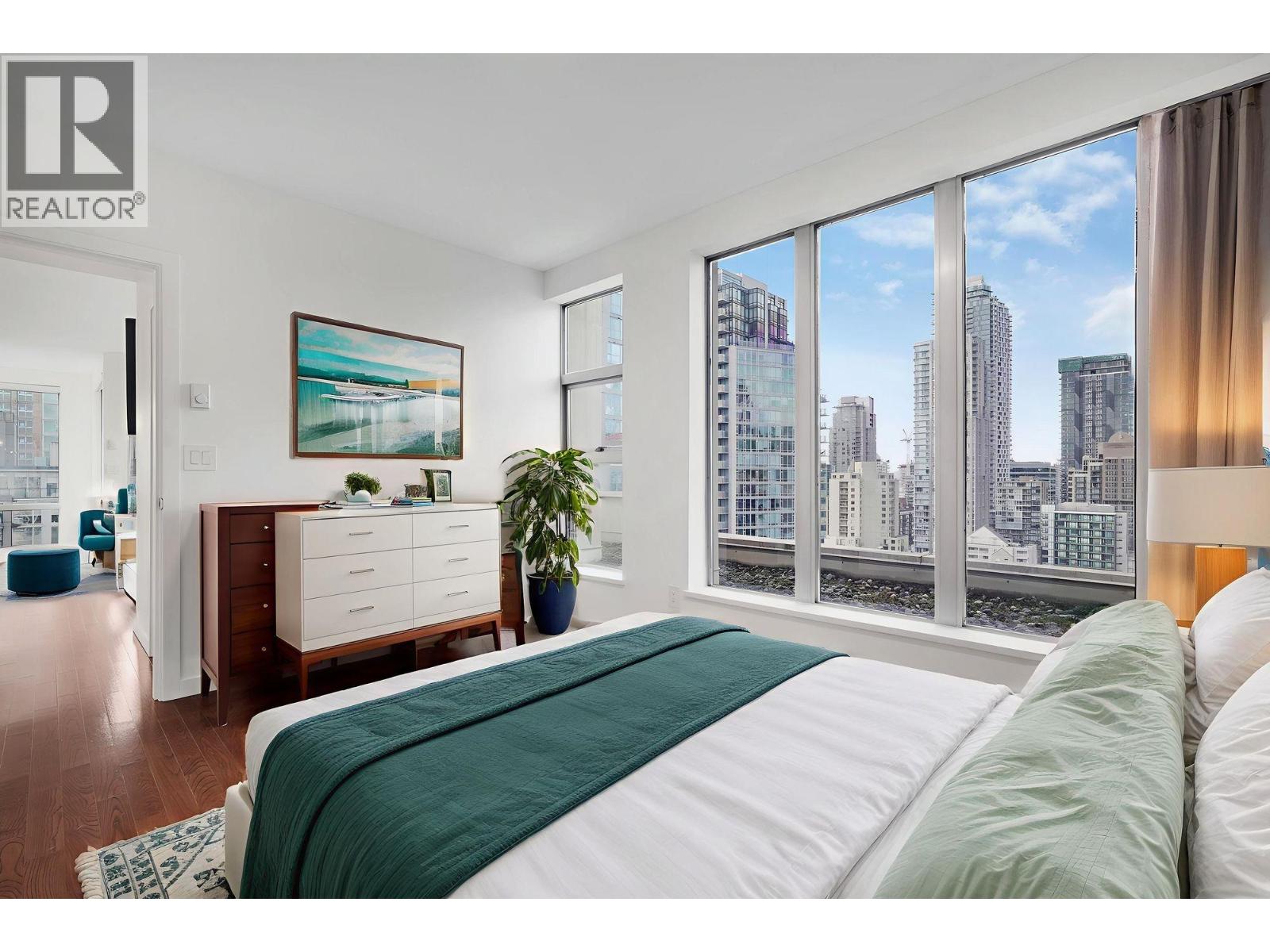 SUB PENTHOUSE. Bosa's elegant Eden on Yaletown's Emery Barnes Park. 1 of only 4 elite-level units with over height ceilings, 2 outdoor patios, glorious water & mountain views. Superb layout of this 1026 sqft perfect 2bd/2bth home features: king-size bedrooms + den, tons of extra storage, oversize open-concept kitchen with gas stove, granite countertops & 10ft eating counter, distinct living & dining spaces, real hardwood floors throughout & master 5-piece ensuite. Tons of natural light reflecting from floor to ceiling windows. New updates include appliances, blinds, shelving and freshly painted. Amenities include guest suite, meeting room, gym, hot tub & sauna. 2 PARKING SPOTS and storage Locker. Located steps from Shops, Groceries, Entertainment, Dinning and Parks. OPEN HOUSE JAN 17, 2-4. (id:58403)