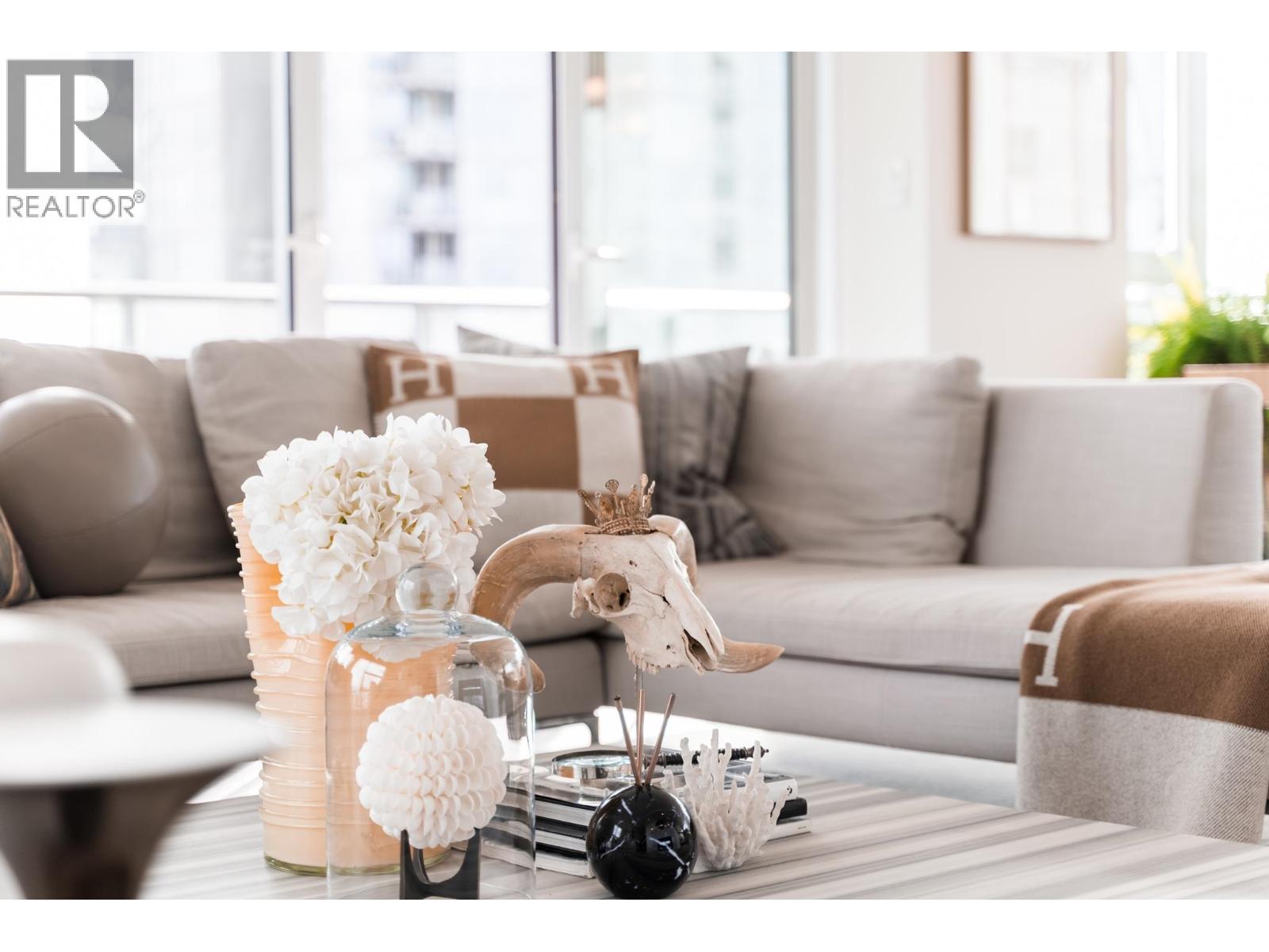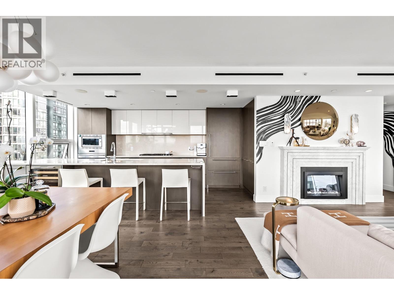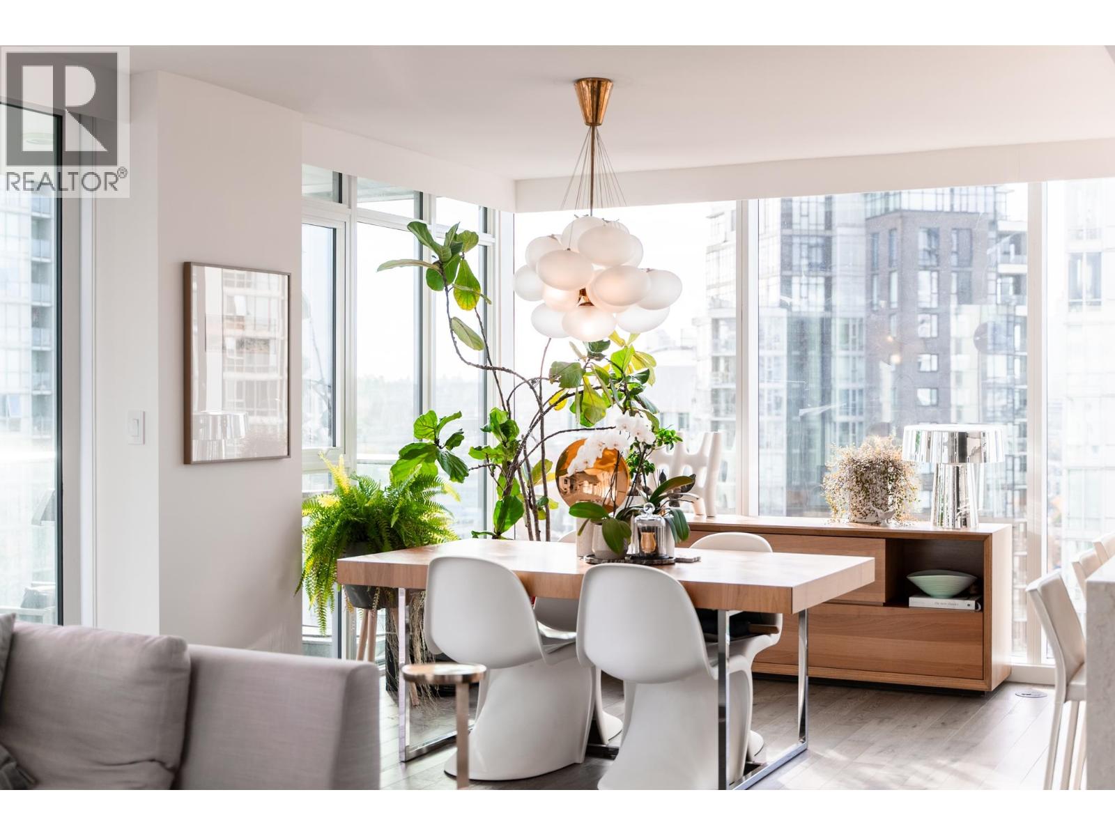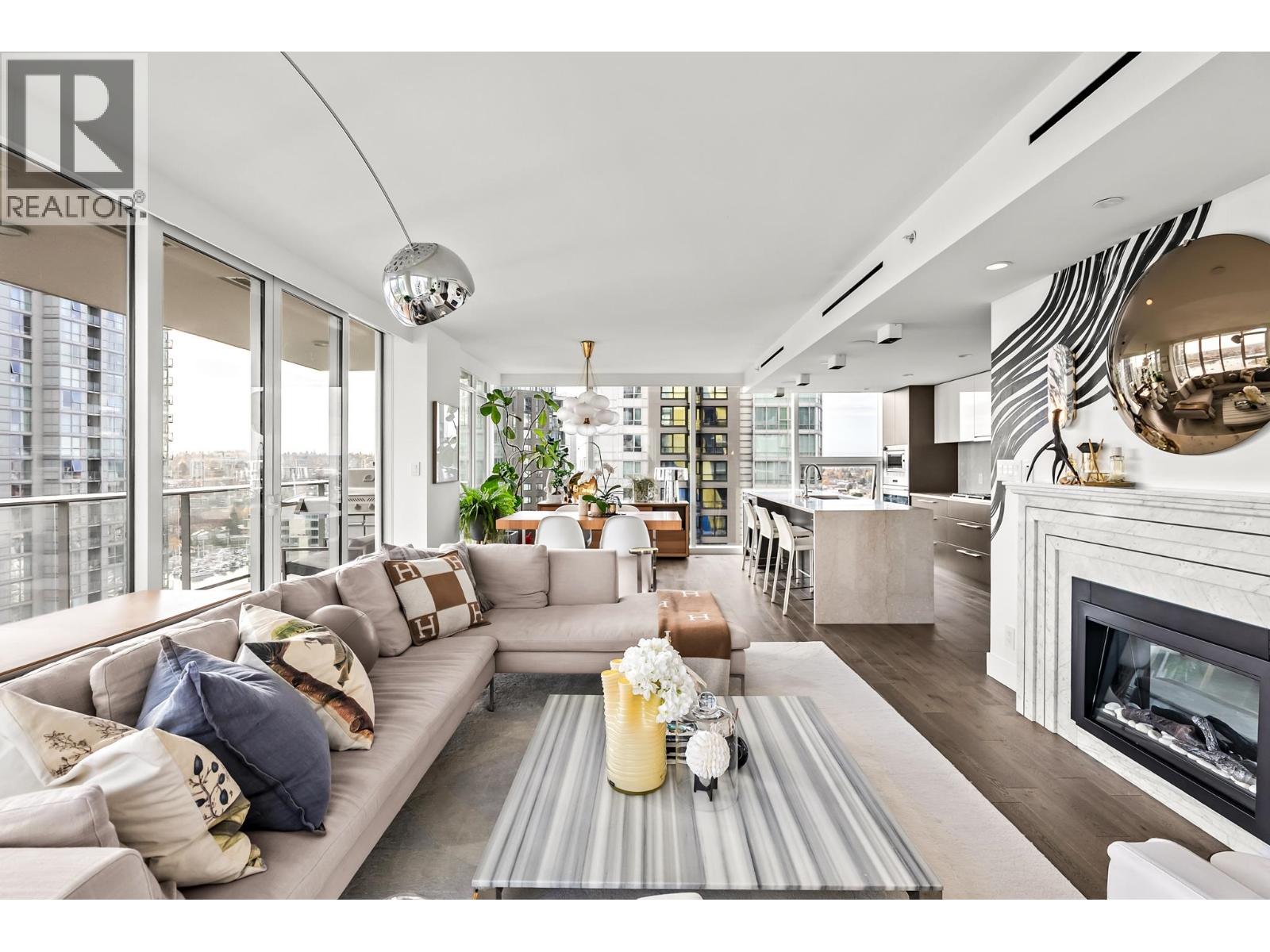 Unparalleled luxury on the 25th floor at The Charleson. This designer suite spans over 1643 square feet with a view that will take your breath away. Featuring engineered hardwood throughout the home & numerous upgrades including tasteful designer lighting, wallpaper, herringbone wood floors, walk in closet & marble fireplace. An open plan chef's kitchen overlooks the expansive living & dining room, with sweeping views overlooking David Lam Park, False Creek, City Hall & beyond. The Primary suite offers plenty of space for your king-sized bed & ensuite which has a bathtub, separate shower & double vanity. The second & third bedrooms are both generous in size. This home comes complete with two additional bathrooms, a private 2 car garage & large storage locker. Building amenities include outdoor pool, hot tub, gym, party room, guest suite & 24 hour concierge. Call for your private showing today ! (id:58403)