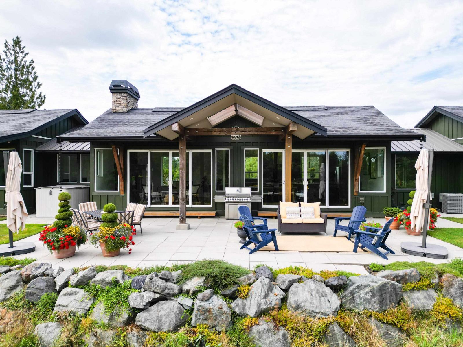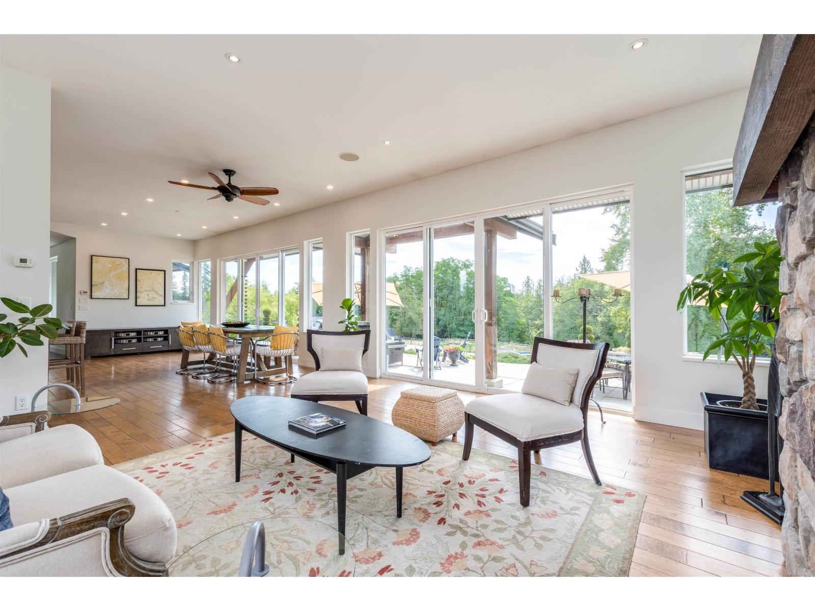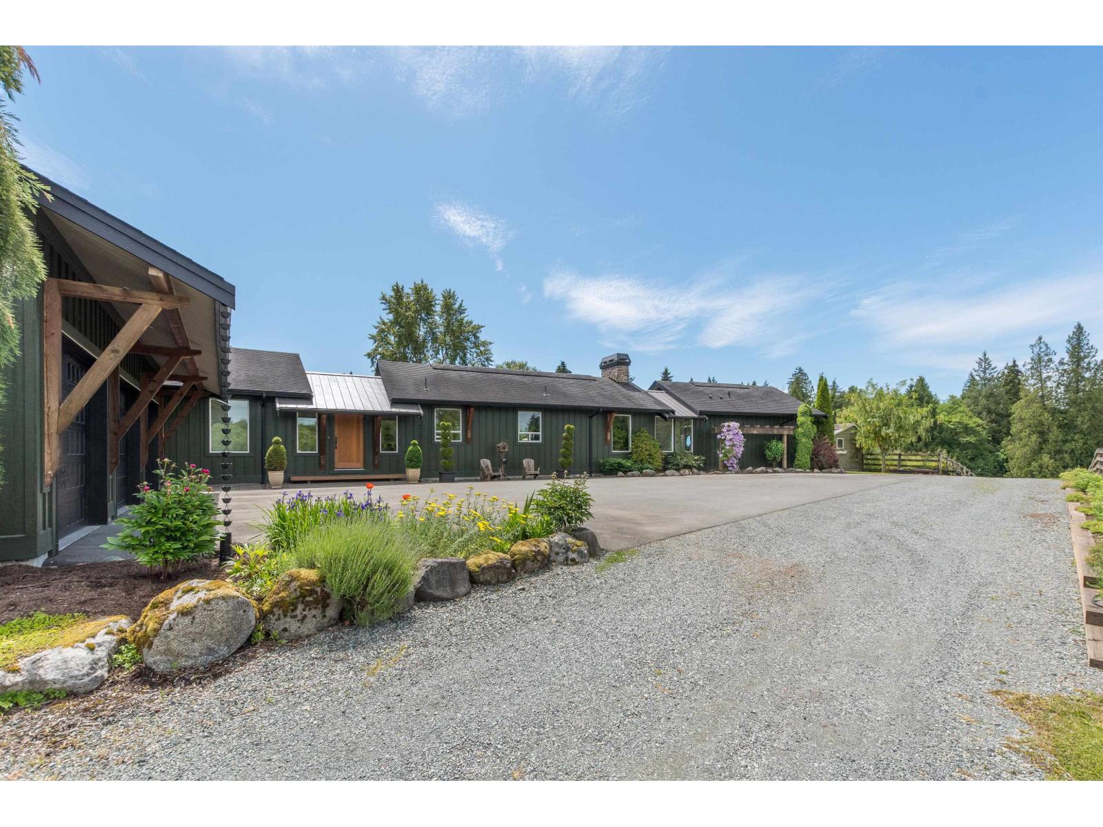 Experience country luxury living in this beautiful 4-bed rancher, perfectly set up for multi gen life or hobby farm dreams. Gourmet chef's kitchen features gas stove, breakfast bar & flows seamlessly into open-concept living. Boasting 3 ensuites, including his & hers walk-in closets & private den. Rich wood & tile flooring throughout, A/C, natural gas BBQ hookup, generator, 2 hot water tanks & UV water filter add comfort. Fresh paint inside (2025) & out (2024), triple attached garage, S facing patio & an impressive 32x28 workshop (200amps, 10' ceilings) for car buff/RV. Separate 2-bed unauth suite offers flexibility for extended family, guests/income. 7-stall barn includes in/outs, hay loft, tack room, etc. Mins to Thunderbird Show Park & backing onto 160 acre park & salmon spawning stream (id:58403)