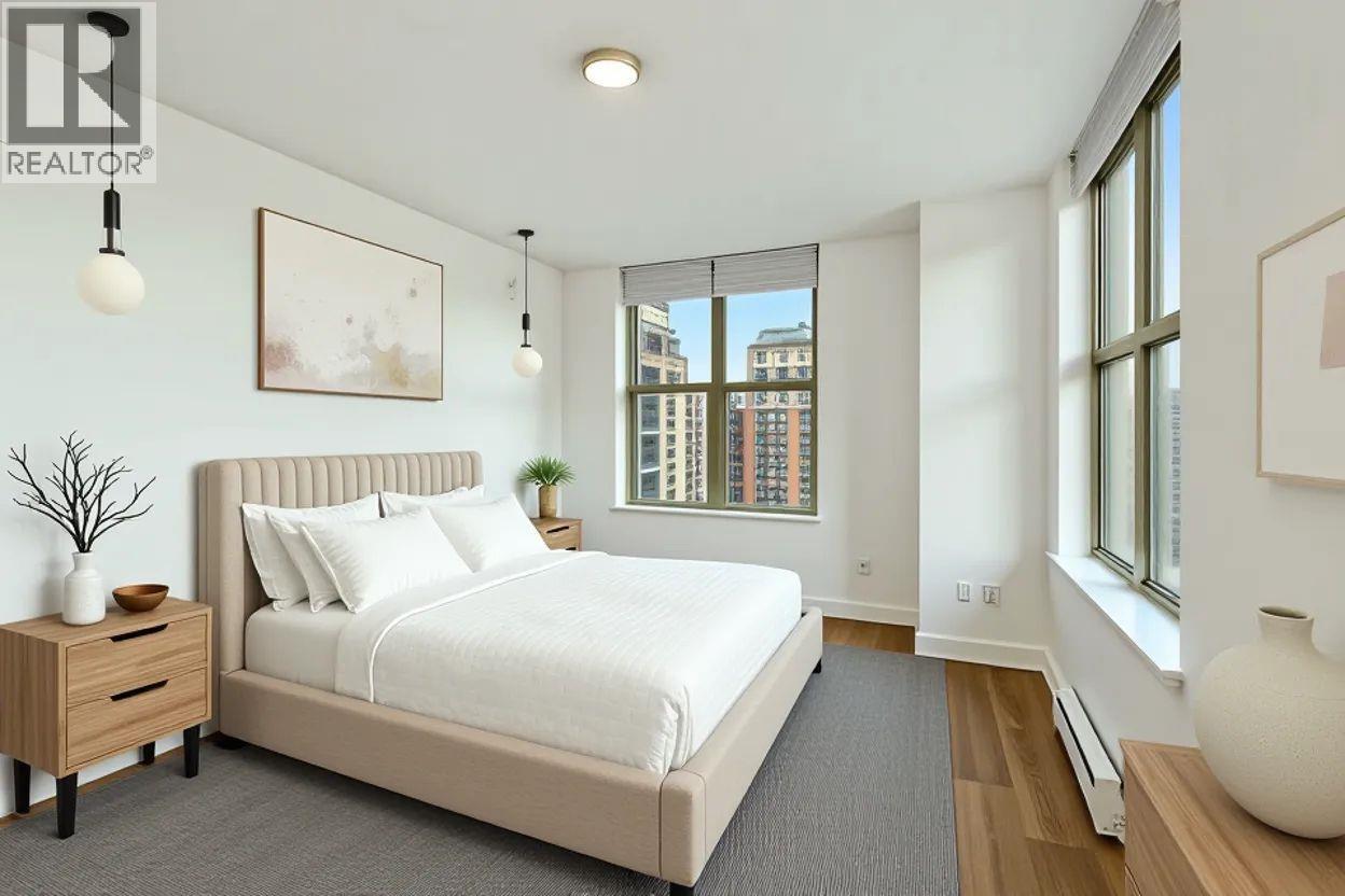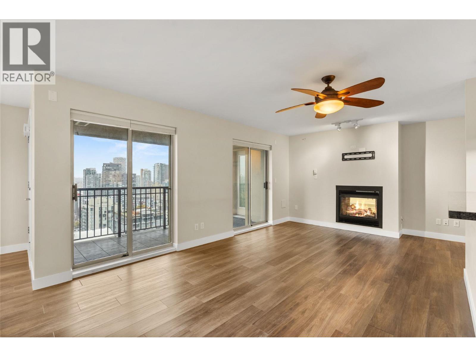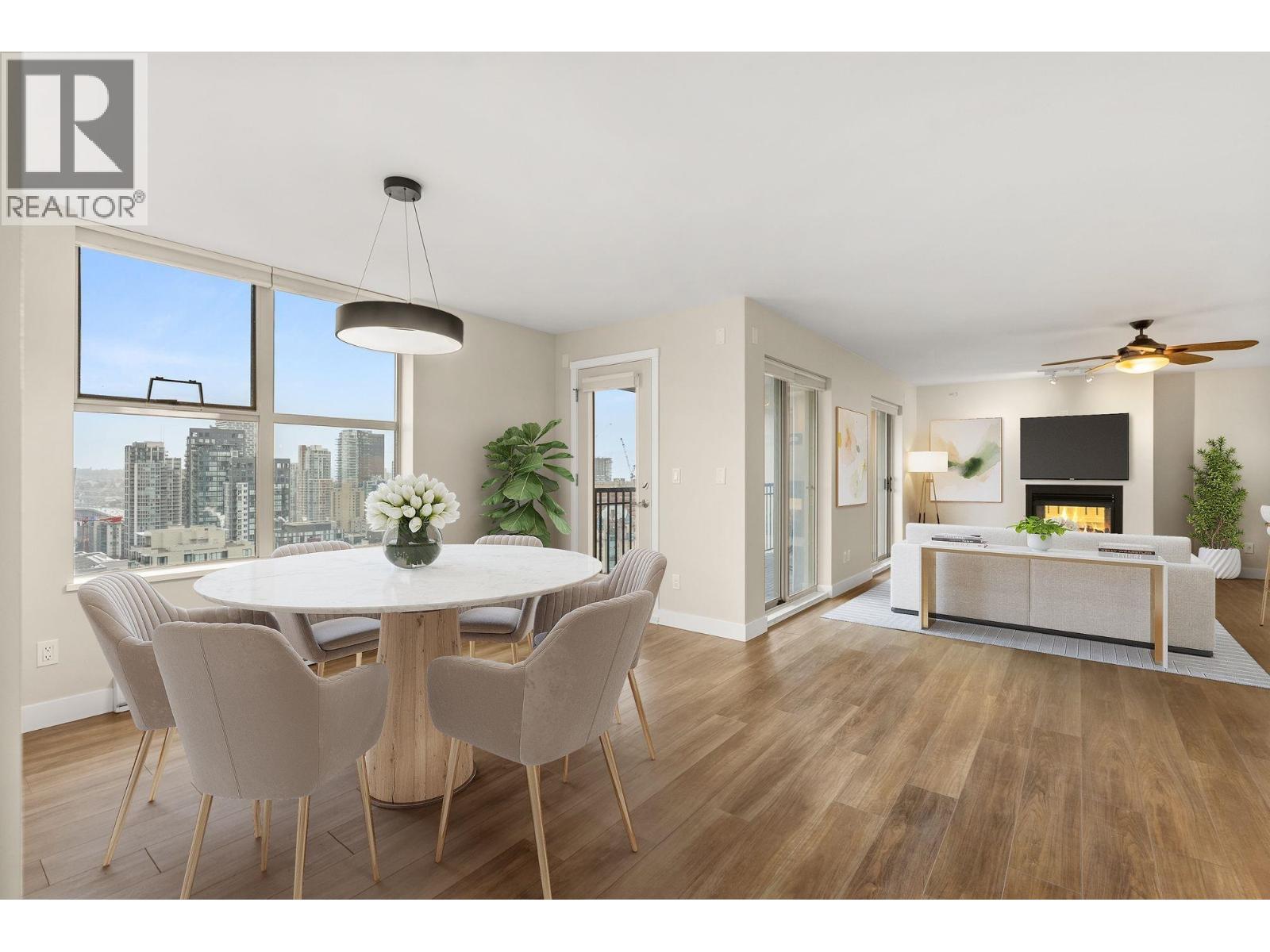Enjoy panoramic views from False Creek to English Bay, stretching over Yaletown and the Beach District from this 1,250-sq-ft Bosa-built home. Expansive windows fill the open living space with natural light, while a two-way gas fireplace adds warmth without defining the room. The thoughtfully designed layout features separated bedrooms for added privacy, two bathrooms, and versatile den. Heated floors at the entrance & den and in the bathrooms. Subtle upgrades throughout are best appreciated in person. A direct BBQ gas line enhances the patio experience, and a fantastic on-site gym adds daily convenience. Set along tree-lined Richards Street, the home includes rare 2 side-by-side parking and a storage locker, offering comfort, quality, and an exceptional urban outlook. (id:58403)
