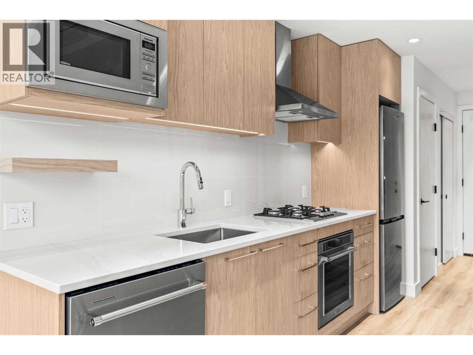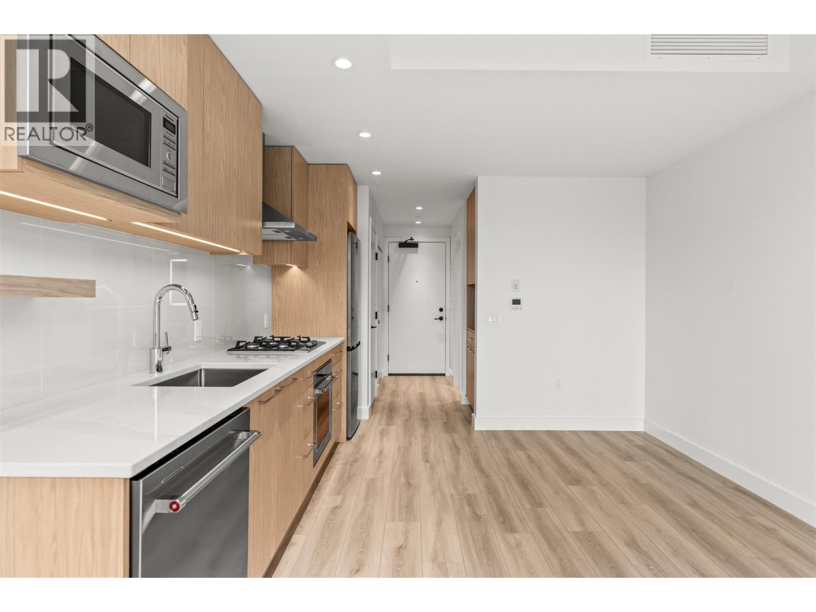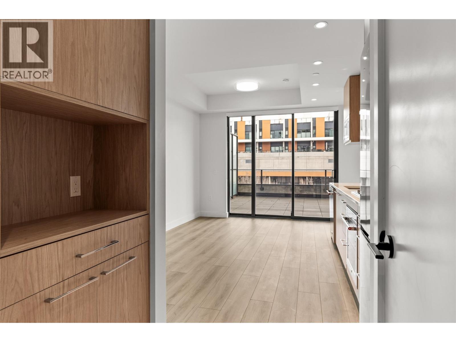 Step into ALMA by Mission Group-- this smartly crafted 2nd floor studio residence offers approximately 312 sq ft of sun-filled, highly functional living directly across the street from Pandosy Waterfront Park. Located in the heart of the Lower Mission, this home blends style and efficiency with ease. The contemporary kitchen showcases flat-panel wood-grain cabinetry, sleek quartz counters, porcelain tile backsplash, and a premium stainless steel appliance package, all accented by under-cabinet LED lighting. Expansive windows flood the open layout with natural light, while durable laminate flooring and modern roller shades add a polished finish. The spa-inspired bathroom delivers everyday luxury with large-format tile, a rainfall shower, custom niche, and soft ambient lighting. Comfort meets convenience with in-suite laundry and individually controlled heating and cooling for year-round climate control. Residents enjoy access to exceptional amenities, including an 8,000 sq ft lakeview terrace complete with firepits, BBQ areas, and community gardens, plus a fully equipped fitness centre, dog wash station, and bike maintenance hub. With an outstanding walk score of 93, you’re just steps to transit, Kelowna General Hospital, the boutiques and dining of vibrant Pandosy Village, and the shores of Okanagan Lake. Square footage and room dimensions are approximate. Photos may represent a similar home and layout. Newly constructed and move-in ready! (id:58403)