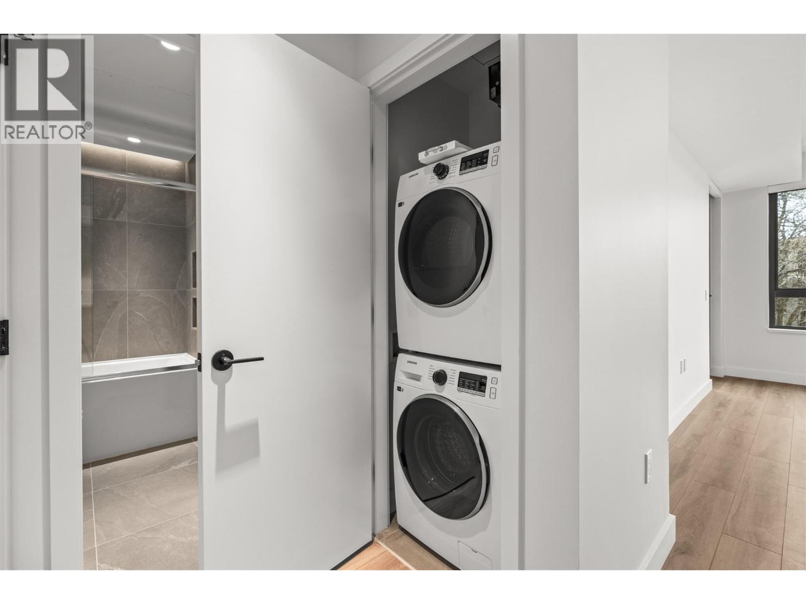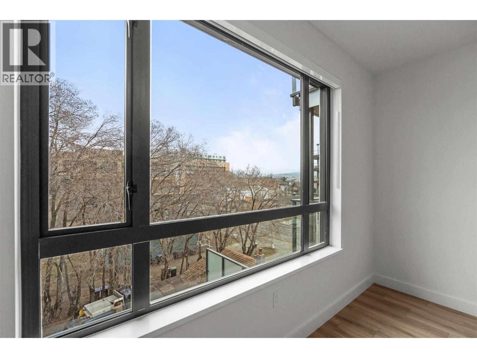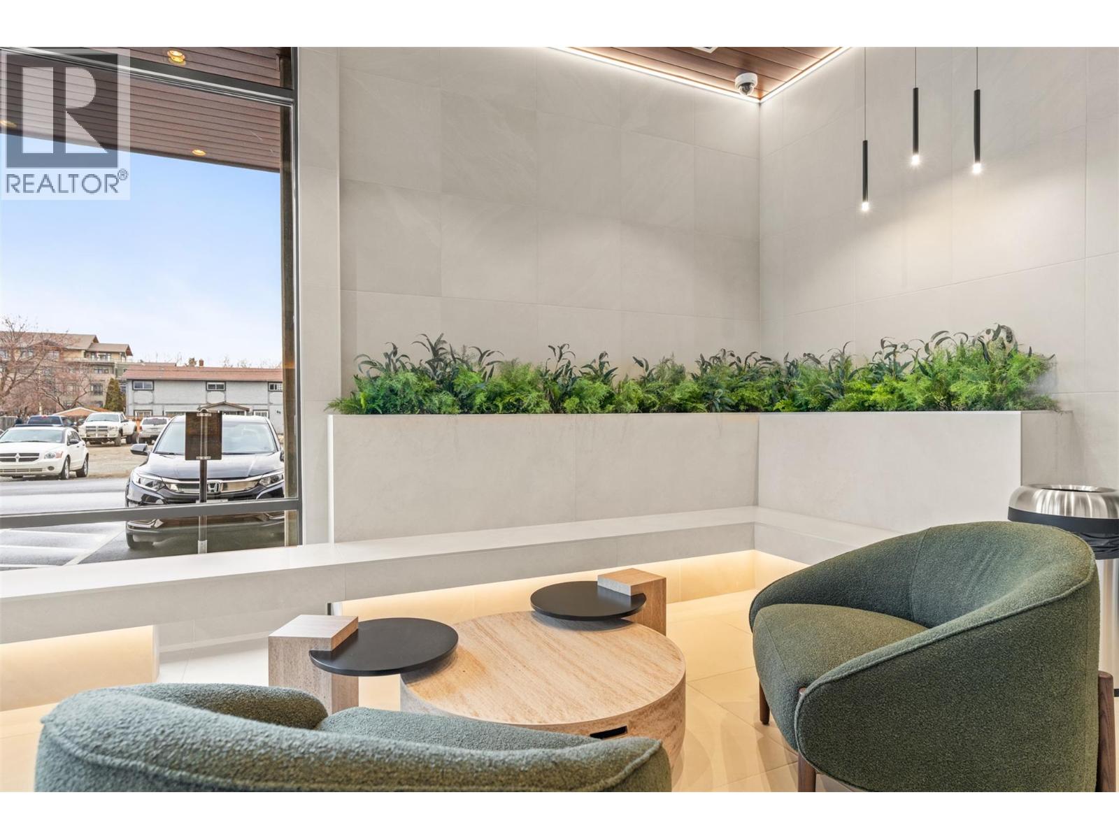 Presenting ALMA, built by Mission Group. This luminous, 3rd floor east-facing 1-bed, 1-bath residence welcomes gorgeous morning sun, offering 540 sqft of interior space plus a 100 sqft terrace, effortlessly blending purposeful design with upscale finishes in the heart of the Lower Mission. The impressive kitchen showcases streamlined flat-panel wood-grain cabinetry, a bold quartz waterfall dining island, and premium stainless-steel appliances. The open-concept plan is ideal for daily living and seamless entertaining, elevated by oversized windows that bathe the home in natural light, durable laminate flooring throughout the main living areas, and soft woven broadloom carpeting in the bedroom. The primary suite features a walk-through closet, while the ensuite is appointed with large-format tile, a rainfall shower, custom-tiled niche, and gentle ambient lighting that creates a spa-like retreat. Added features include roller shades on every window, individually controlled heating and cooling, and one secure underground parking stall. Residents enjoy access to amenities including an 8,000 sqft lakeview terrace with firepits, BBQs, and community gardens, along with a fully equipped fitness centre, dog wash, and bike maintenance station. With a walk score of 93, you’re moments from transit, KGH, the shops and dining of vibrant Pandosy Village, and the shoreline of Okanagan Lake. Sqft and room sizes are approximate and may vary. This newly constructed home is move-in ready. (id:58403)