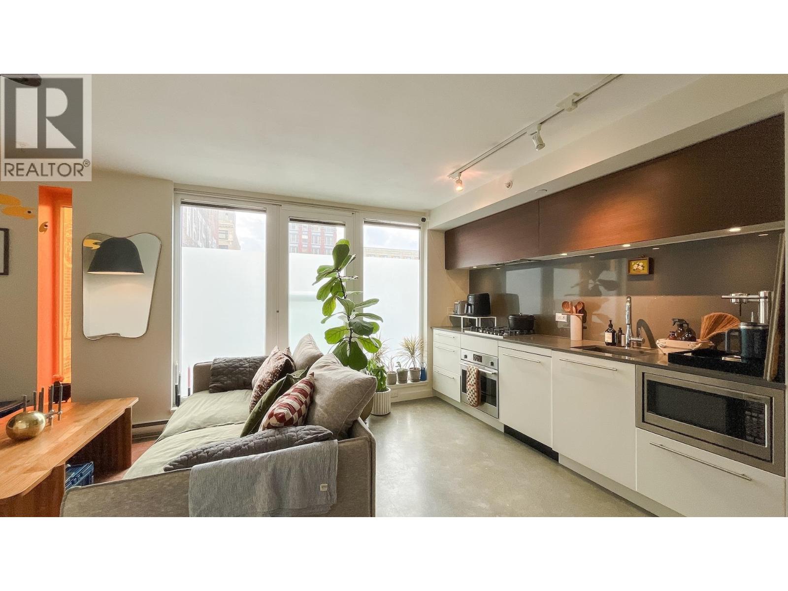 Functional & spacious 1-bedroom in Downtown under $450K - incredible value for investors or first-time buyers! Located in the heart of Gastown´s iconic Heritage District, this end-unit 1 Bed + 1 Bath in a boutique concrete building seamlessly blends historic character with modern design. This loft-style home features polished concrete floors and a true 1-bedroom layout for optimal functionality. The kitchen is equipped with European integrated appliances, a stainless steel 4-burner gas range, and sleek Kohler fixtures. Enjoy your Juliette balcony, or take advantage of the stunning shared rooftop deck complete with a full kitchen, BBQ, and sweeping mountain views. Just steps from Gastown´s best restaurants, cafes, and nightlife, with high-speed transit, Crab Park, car sharing, and everyday essentials nearby - all contributing to an exceptional 97 Walk Score. Easy access to Downtown, Railtown, Yaletown, Chinatown, SkyTrain, and SeaBus. (id:58403)