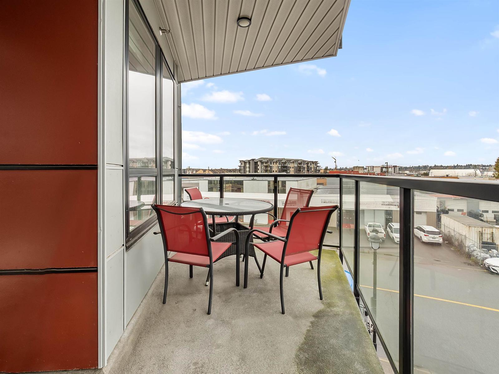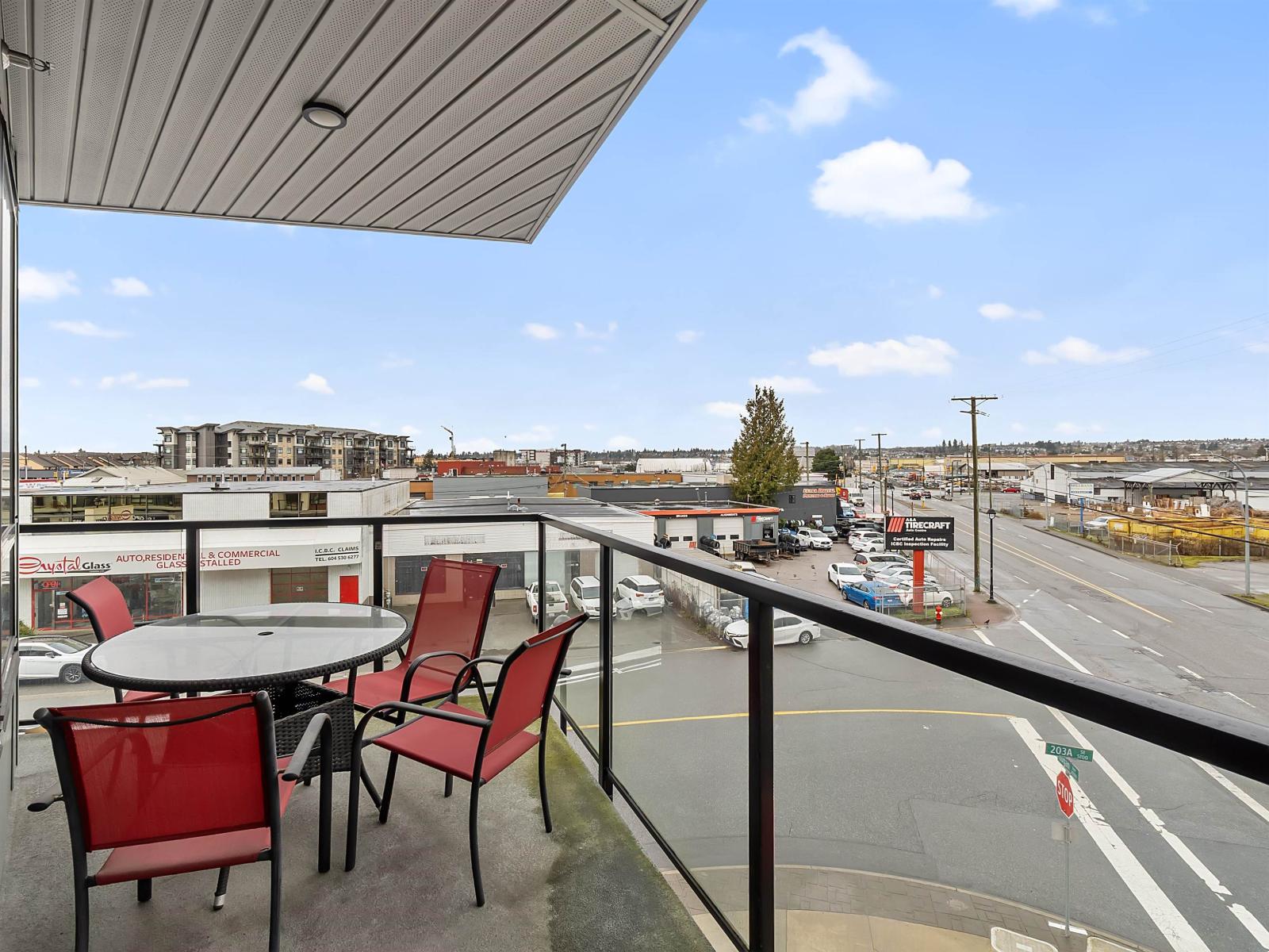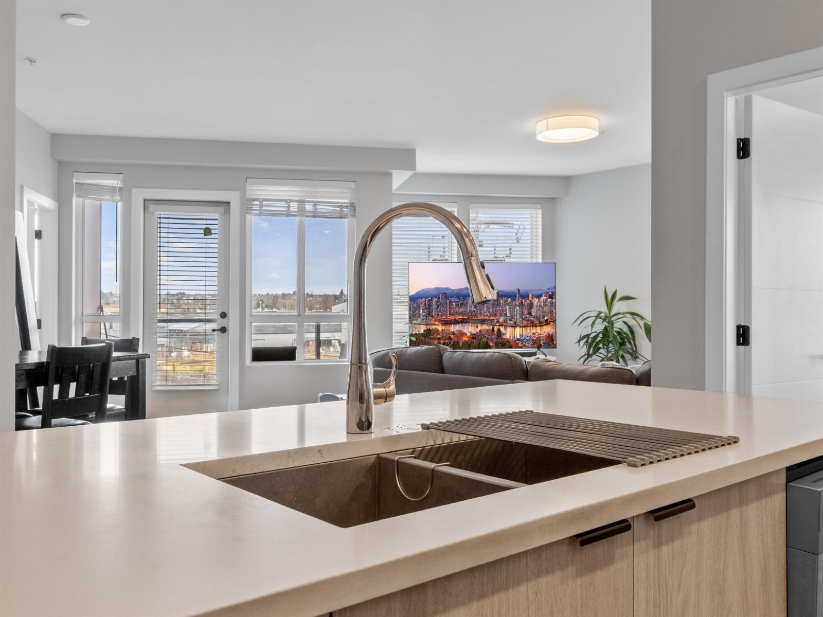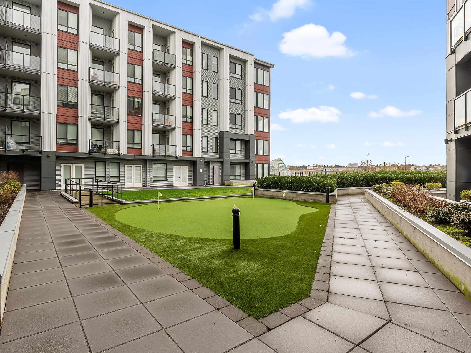Experience elevated condo living in this north-facing corner home at the sought-after Genesis by Whitetail Homes. This well-designed 2 bedroom, 2 bathroom residence offers a bright open-concept layout with abundant natural light and a spacious covered balcony ideal for year-round use. Interior features include quartz countertops, stainless steel appliances, high ceilings, and modern spa-inspired bathrooms. The functional chef-style kitchen is perfect for everyday living and entertaining. Residents enjoy premium amenities including a fitness centre, landscaped courtyard, meeting rooms, and putting green. Ideally located steps to future SkyTrain access, shopping, restaurants, and schools. Strong rental demand makes this an excellent opportunity for homeowners and investors. (id:58403)