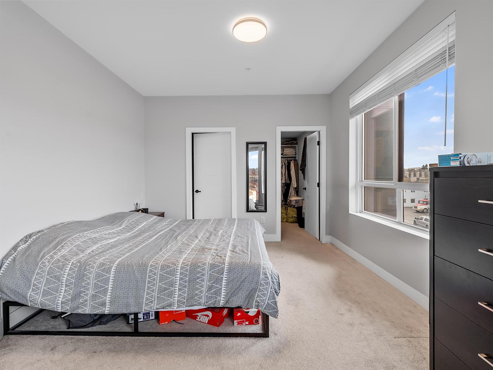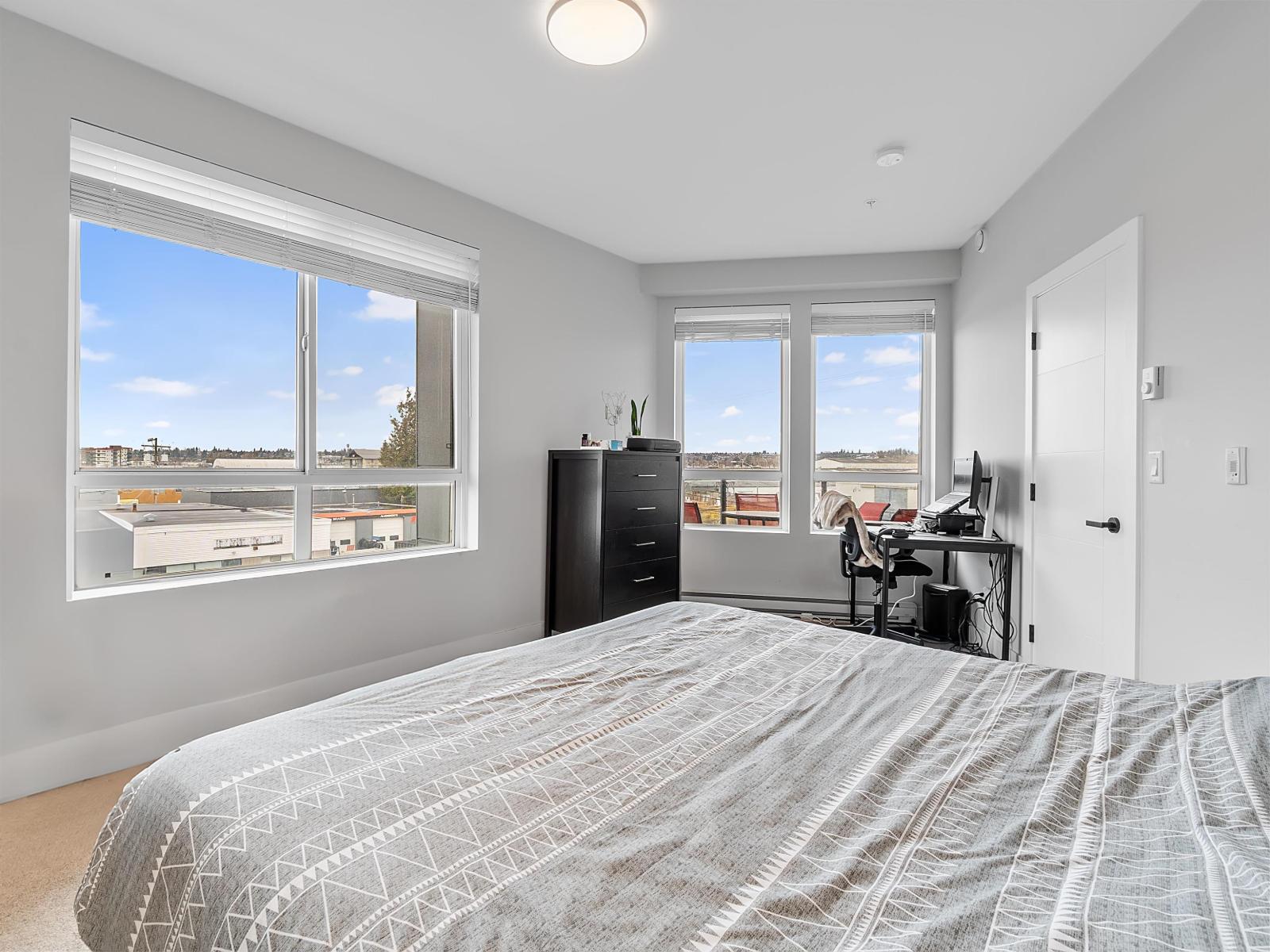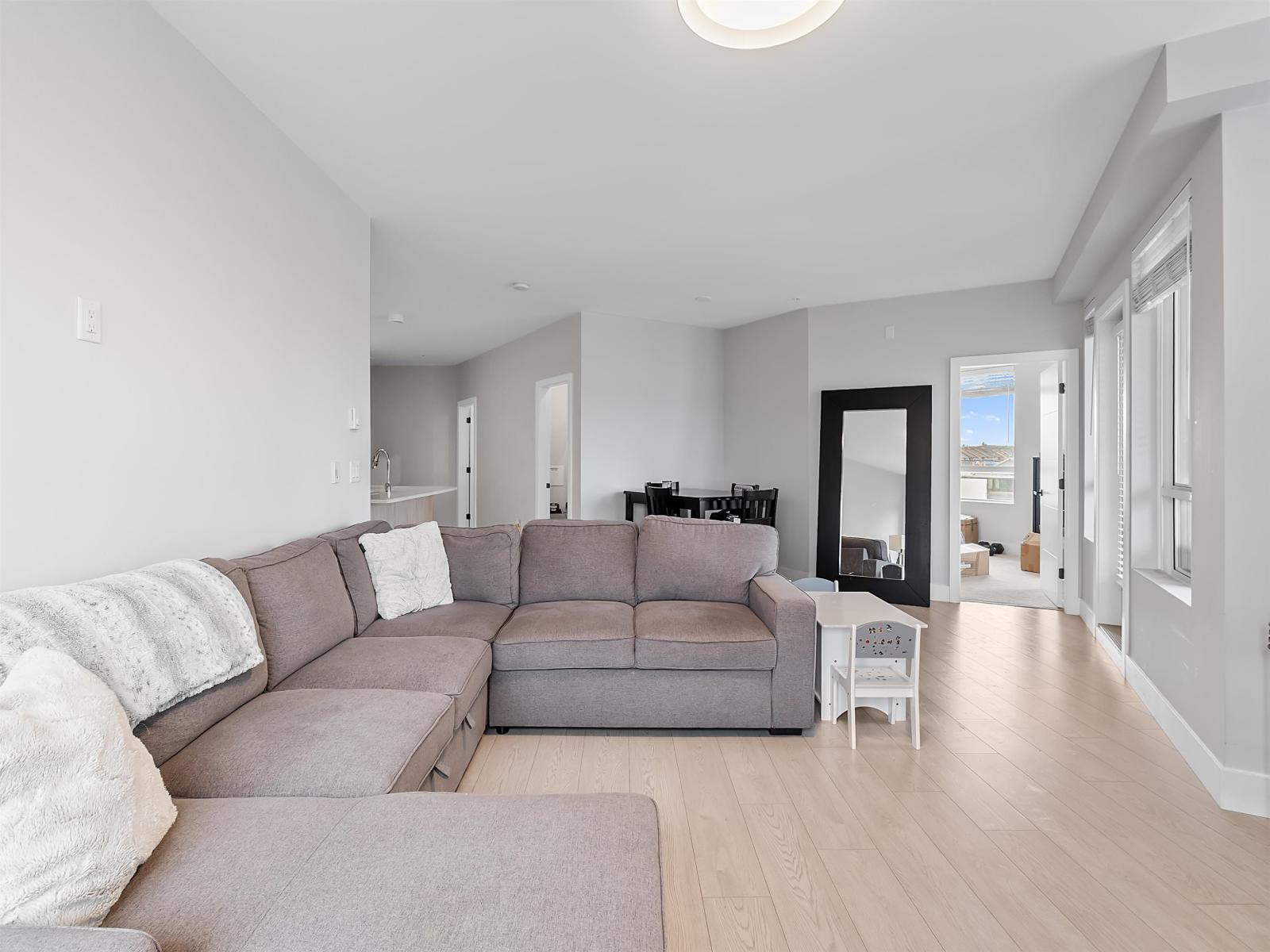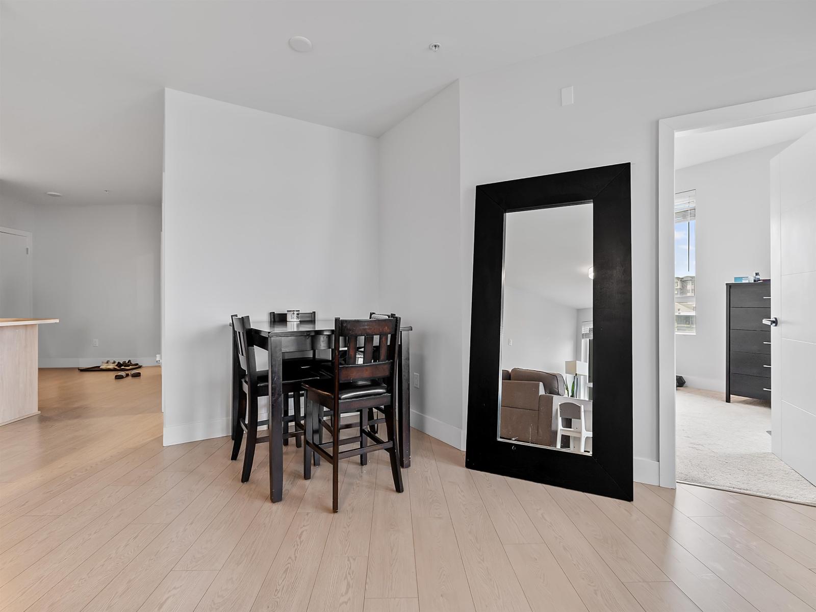 Experience elevated condo living in this north-facing corner home at the sought-after Genesis by Whitetail Homes. This well-designed 2 bedroom, 2 bathroom residence offers a bright open-concept layout with abundant natural light and a spacious covered balcony ideal for year-round use. Interior features include quartz countertops, stainless steel appliances, high ceilings, and modern spa-inspired bathrooms. The functional chef-style kitchen is perfect for everyday living and entertaining. Residents enjoy premium amenities including a fitness centre, landscaped courtyard, meeting rooms, and putting green. Ideally located steps to future SkyTrain access, shopping, restaurants, and schools. Strong rental demand makes this an excellent opportunity for homeowners and investors. (id:58403)