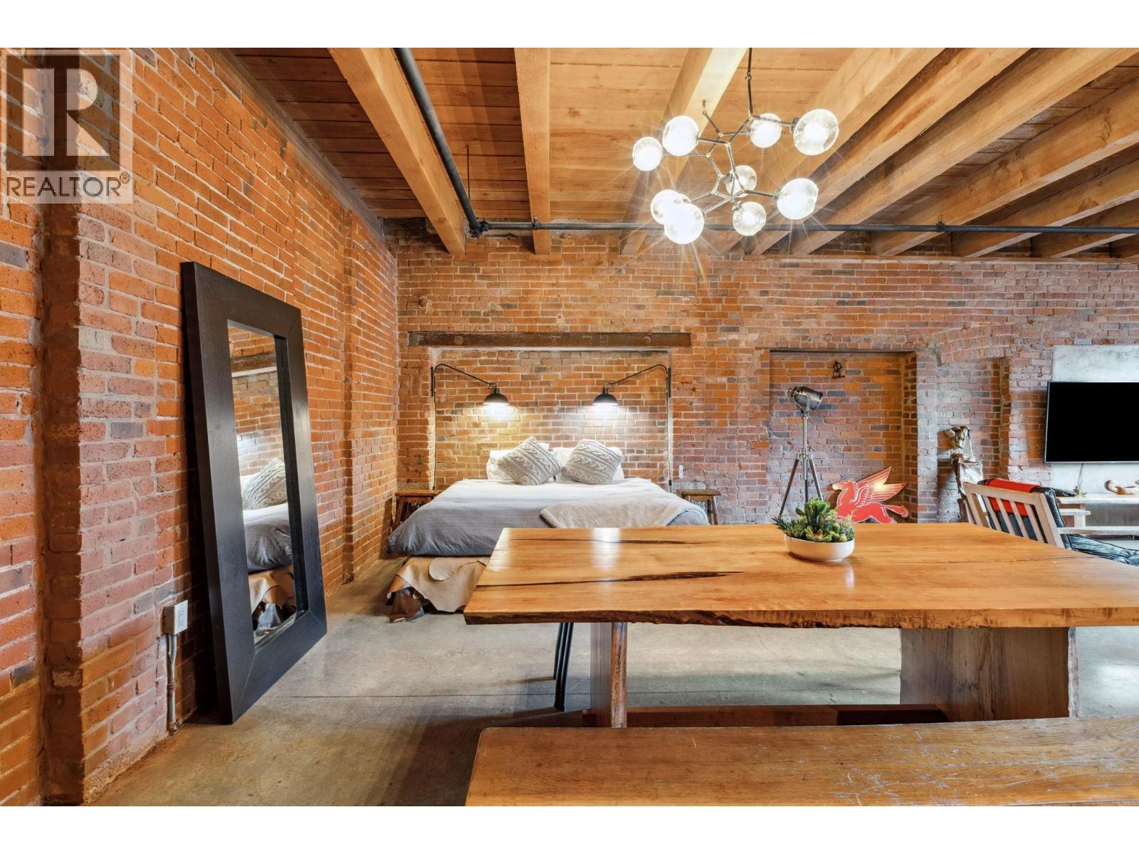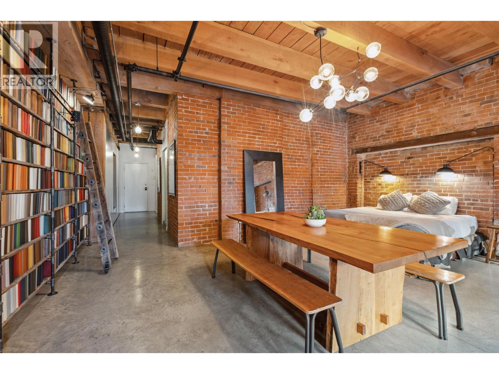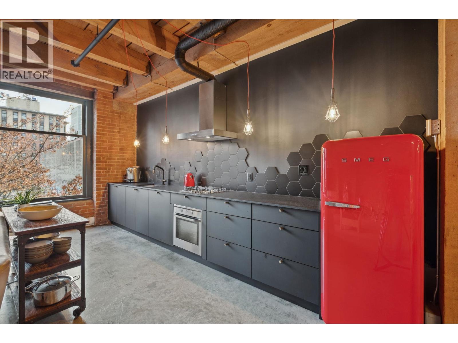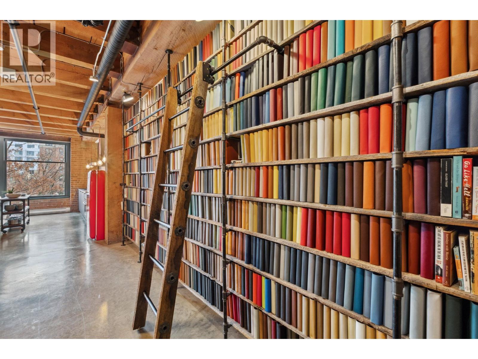 Unique customized character loft at Koret Lofts, Vancouver´s most desirable warehouse conversions. Original timber beams, exposed bricks w/endless character in this unique property, 10´4" ceilings, polished concrete floors & fully upgraded. Beautiful black kitchen with gas cooktop, SMEG fridge, gorgeous textured countertops, unique restoration style bookshelf/library w/sliding ladder, sleek built-ins, & large washroom encased in original brick which was originally a vault! Countless fine details: dramatic old-world inspired lighting, h/w on demand system, great storage & closet spaces, auto blinds. Building zoned commercial live/work. Strata allows pets & shorter term rentals, great revenue from film/movie industry crews as well. Includes one secure parking. Call today for a private showing! (id:58403)