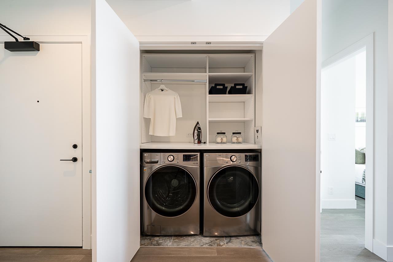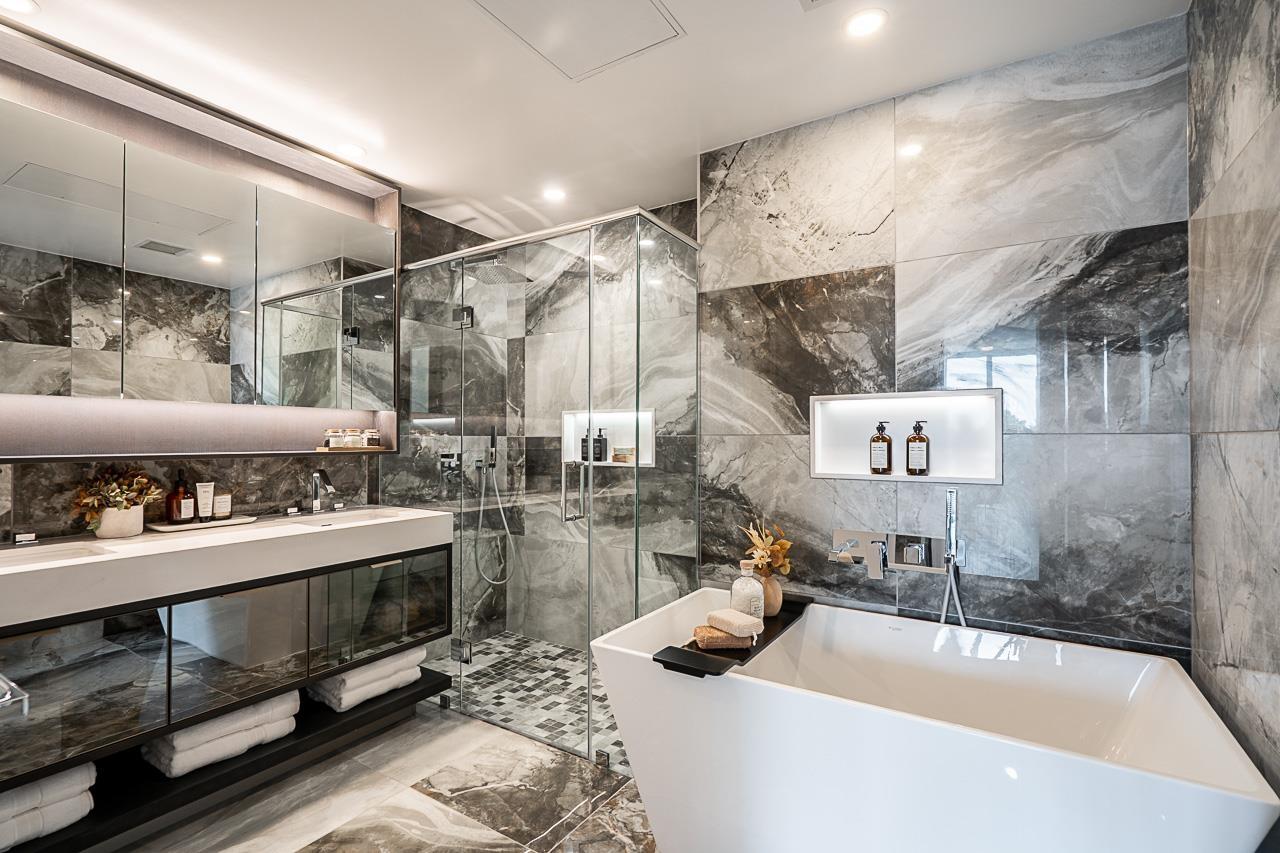 Monaco by Solterra - Elevated living in White Rock. 13 story concrete fully air conditioned, luxury boutique building located just South of Thrift Avenue. Two bedroom plus flex with 2 full bathrooms. Thermador appliances including a 36" fully integrated fridge, wifi enabled convection wall oven, 5 burner gas cooktop, and drawer microwave. Also included is a 24" integrated beverage fridge. Stunning custom kitchen made and designed in Italy and includes a single slab quartz backsplash and quartz hood fan cover. Do you love having a large luxurious ensuite bathroom? This home was made for you! Double vanity, heated tile floors, free standing soaker tub, separate water closet and large stand up shower. (id:58403)