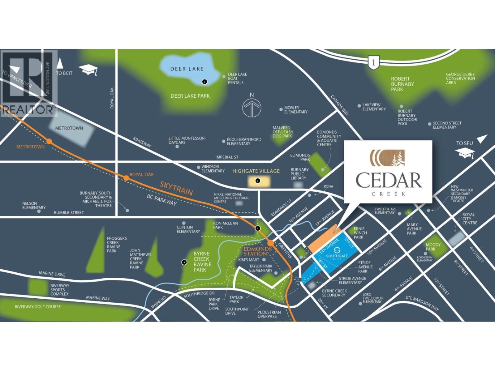 Bright and spacious 2 bed 2 bath home at Cedar Creek, a master planned community by Ledingham McAllister. Functional layout with 9 ft ceilings, no wasted space, large bedrooms and a primary suite with walk in closet and ensuite. Lots of natural light and an spacious private balcony. Modern L shaped kitchen with island, stainless steel appliances, stone countertops and plenty of cabinet space. Well managed building with great amenities including gym, guest suite, EV parking and bike room. Comes with 1 parking and 1 storage locker. Rental and pet friendly, close to Edmonds SkyTrain, Highgate Village, schools, parks and shopping. Open house March 21,22 (2 - 4 pm) (id:58403)
