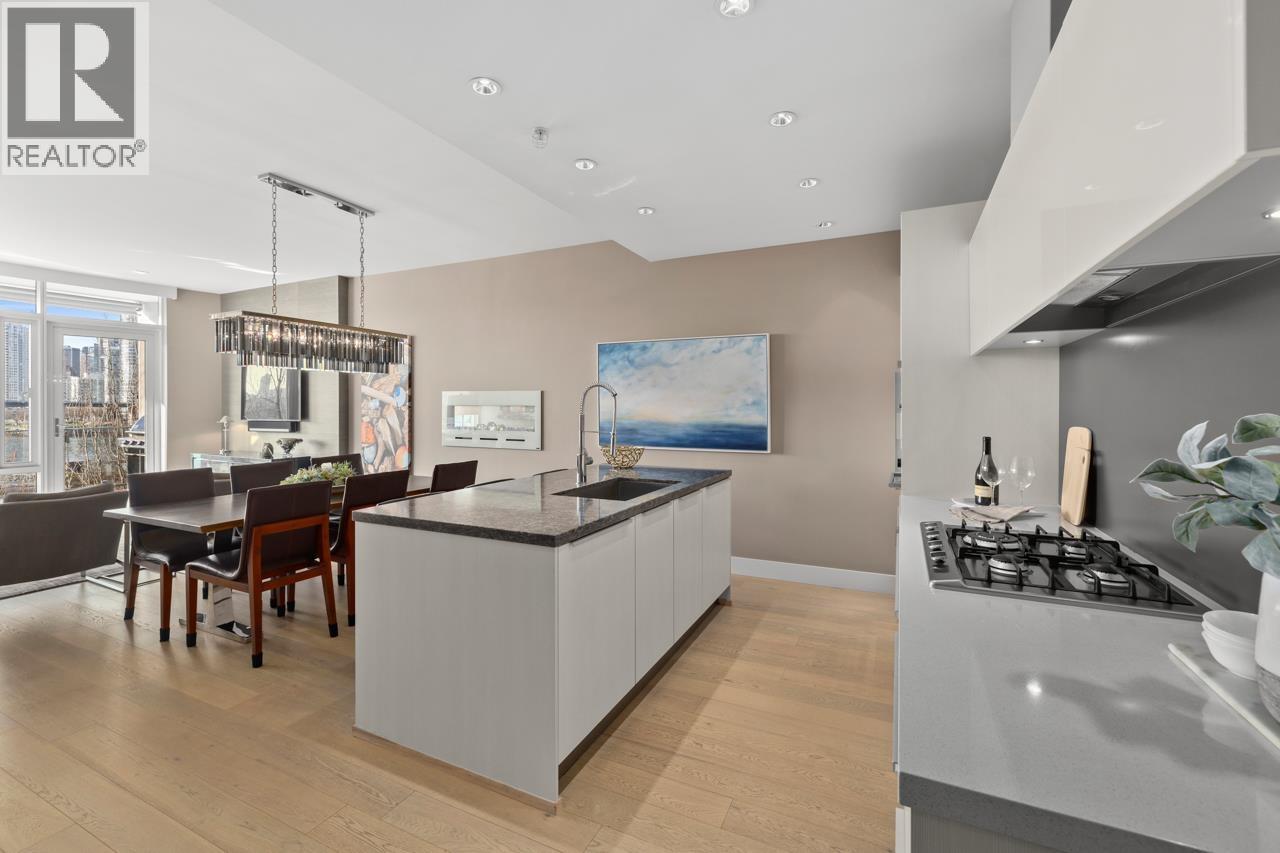 Wake up to WATER VIEWS from this luxury 2 bed 2 bath residence in the BRIDGE. This stunning home ft open-concept layout with EXPANSIVE 235sqft COVERED PATIO overlooking PARK, FALSE CREEK & DOWNTOWN SKYLINE. Refined kitchen ft premium Eggersmann cabinetry, subzero fridge, gas cooktop & quartz counters, connecting to dining & living areas. Spacious primary ft walk-in closet & spa-inspired ensuite with soaker tub, walk-in shower & dual vanity. Second bedroom offers flexibility for guests or home office. This BOUTIQUE BUILDING offers RADIANT HEATING & COOLING, full-time CONCIERGE, social lounge, courtyard & first-class amenities at GOLD MEDAL CLUB ft pool, hot tub, sauna, steam room & gym. Steps to Seawall, SkyTrain, cafés & dining. Incl 2 parking & 1 locker. (id:58403)