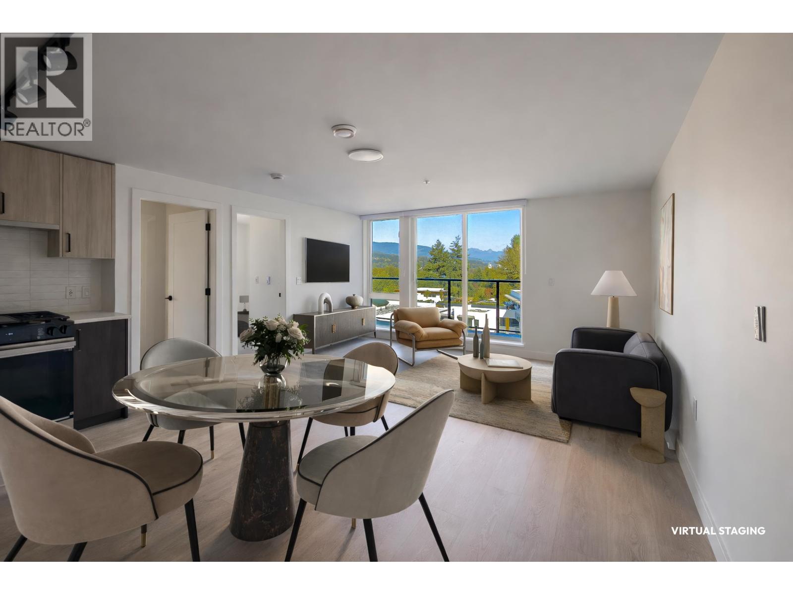 This view catches you off guard as you step into the main living space: Burrard Inlet and the North Shore mountains clearing the surrounding rooftops. A wraparound balcony extends outward toward that view. New construction NE corner 2 bed, 2 bath at Anchor by Bold Properties, 772 sq ft. Open kitchen with flat panel cabinetry, quartz counters, gas cooking, and full sized appliances. Primary bedroom with double vanity ensuite and walk-in shower. Second full bath off the foyer. One parking stall and one storage locker included. GST paid. Building amenities: rooftop terrace, landscaped courtyard, gym, lounge. Some images virtually staged. (id:58403)