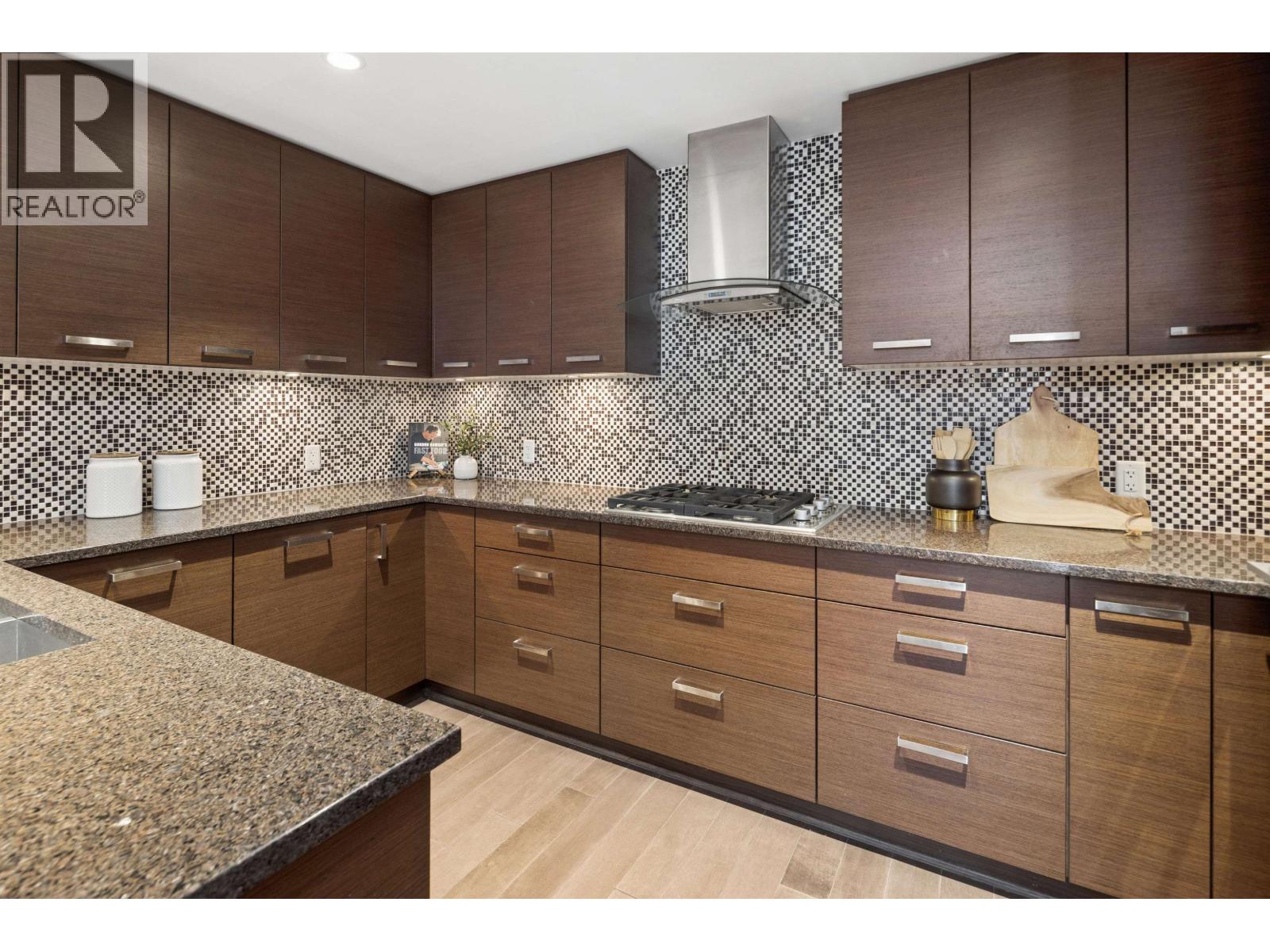 Welcome to The Kimpton in the heart of Central Lonsdale. This beautifully presented 1 bed + flex, 1 bath home offers 782 sqft of well-designed living with a quiet north-facing exposure. The open-concept layout features a house-sized kitchen with Fisher & Paykel appliances, granite countertops, European-style cabinetry, Italian Latorre faucet, and a generous breakfast bar flowing into the dining and living areas-ideal for entertaining. Enjoy in-floor heating, updated paint and LG washer/dryer (2023). The spacious flex is perfect for a home office. Spa-like bathroom with marble finishes and frameless glass shower. Includes 1 parking & 1 storage. Steps to shops, cafes, restaurants & transit-an exceptional opportunity in a sought-after location. (id:58403)
