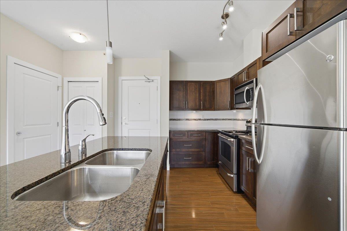 Welcome to The Gallantree, where modern comfort meets unbeatable convenience! This bright and spacious 1-bedroom, 1-bathroom condo offers 740 sqft of thoughtfully designed living space. Situated on the quiet side of the building, the unit boasts a functional open layout with 9' ft ceilings, sleek laminate flooring, NEW carpet, S/S appliances, granite counter tops, centre island, large walk-in closet & spacious laundry with extra storage. Enjoy the outdoors on your covered patio, perfect for relaxing or entertaining. This family friendly building allows rentals & pets. Includes 2 Parking Stalls & HUGE Storage! Conveniently located just minutes from historic Downtown Abbotsford, this west-facing unit offers easy access to major routes, an array of shops, dining & entertainment. Ready to Move In! OPEN HOUSE: March 14 (2-4pm). (id:58403)