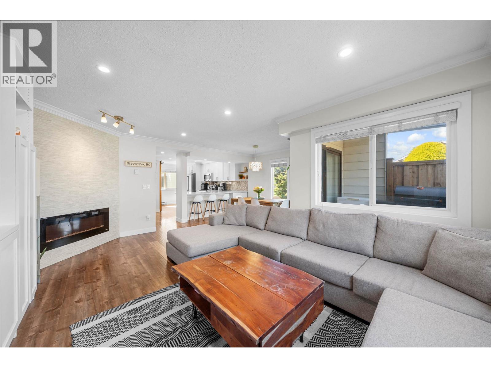 Stunning, fully renovated 3 bedroom, 2 bathroom, end unit townhouse in sought-after Steveston! This 1,428 sqft gem boasts an open-concept layout with a gourmet kitchen featuring quartz countertops, designer backsplash, and stainless steel appliances. The bright living area radiates with natural light, showcasing pot lights, laminate floors, electric fireplace, and custom built-in shelving around a stylish entertainment hub. Upstairs, three spacious bedrooms include a master with walk-in closet, remote-controlled blackout blinds, plus a spa-inspired bathroom with heated floors. Enjoy a private patio, perfect for gatherings, with outdoor TV and storage shed. Well-run strata, with EV charging, new fencing, and a warm community feel. Steps to Steveston Village, shops, parks, and top schools. (id:58403)