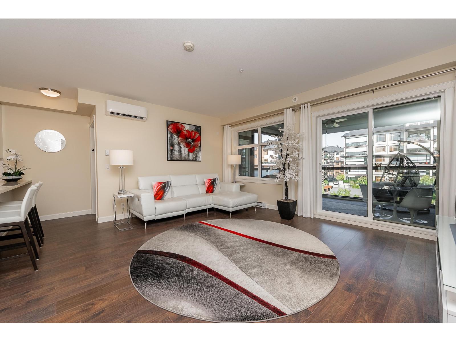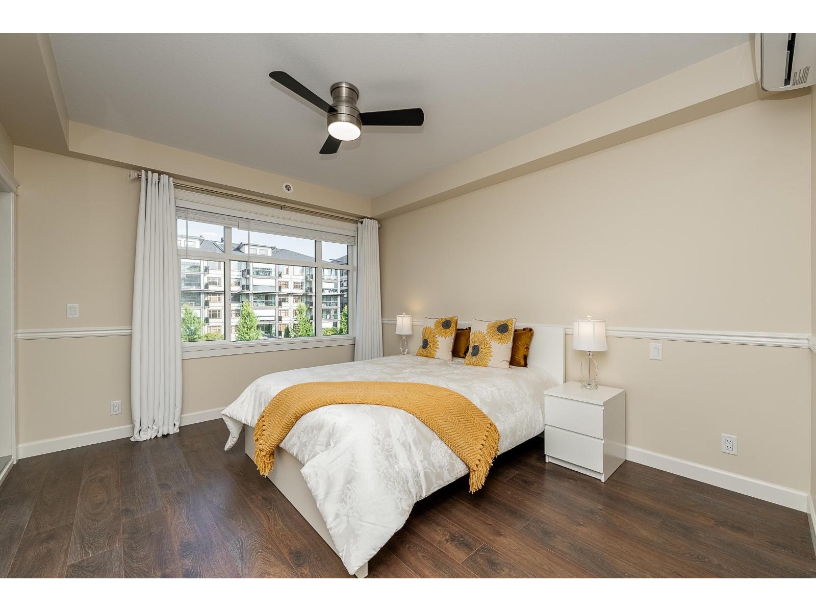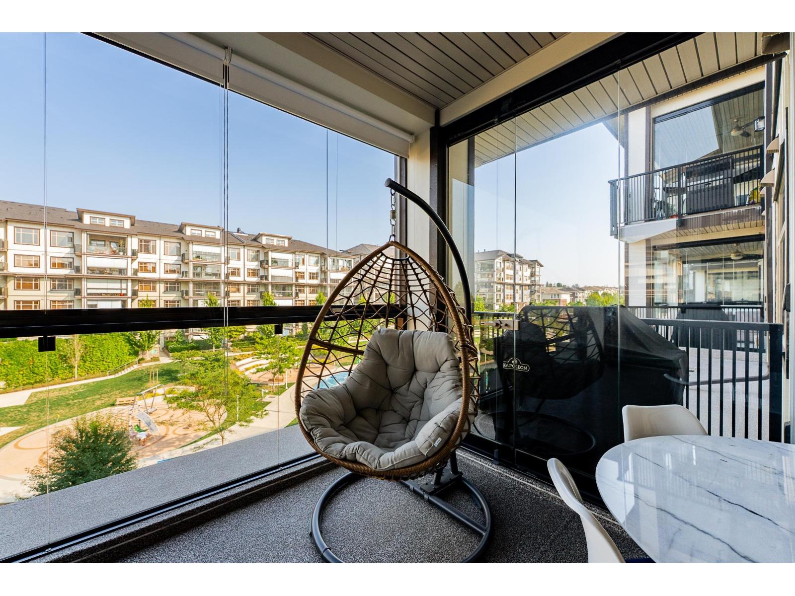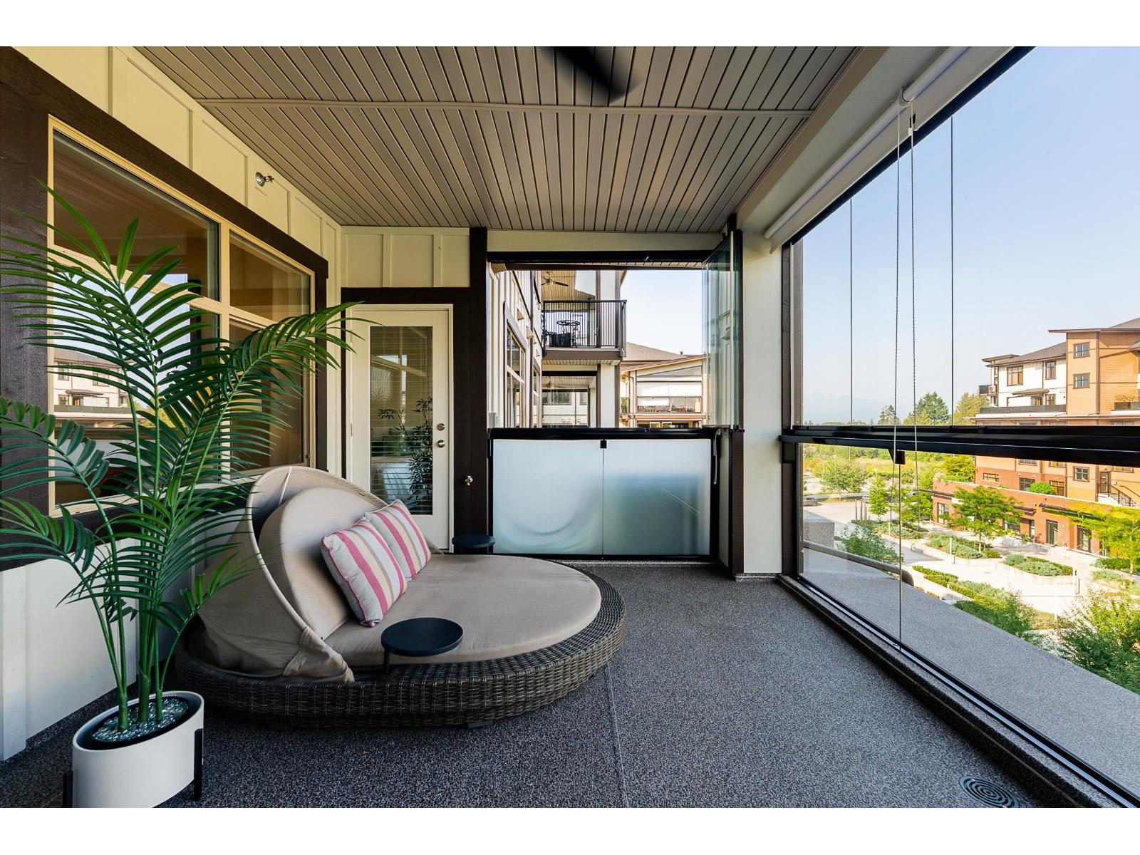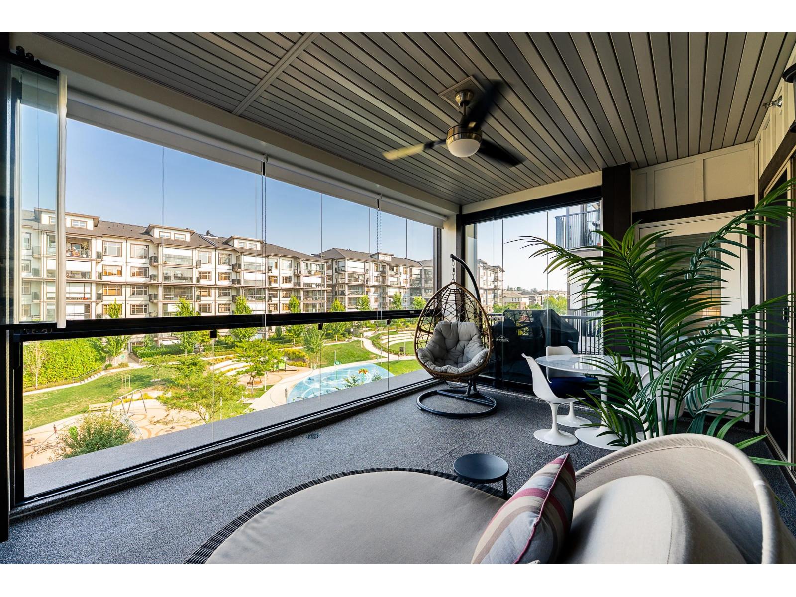 Immaculate and spacious East-facing 3 bedroom + den at sought-after Yorkson Park! Offering 1,583 sq ft of bright and air conditioned living space, plus a 225 sq ft solarium/balcony with retractable glass panels and courtyard views. The gourmet kitchen features a peninsula with seating, gas range and sleek cabinetry, seamlessly connecting to the dining and living area. Designed for year-round enjoyment, the solarium expands your living space. Generous bedrooms include two with luxurious ensuites, double vanities, frameless glass showers, walk-in closets, and access to the solarium. Added features include an energy-efficient heat pump with A/C, gas BBQ hookup, 2 parking stalls, and a storage locker. Conveniently located near Carvolth Exchange, shopping, restaurants, and quick highway access. (id:58403)