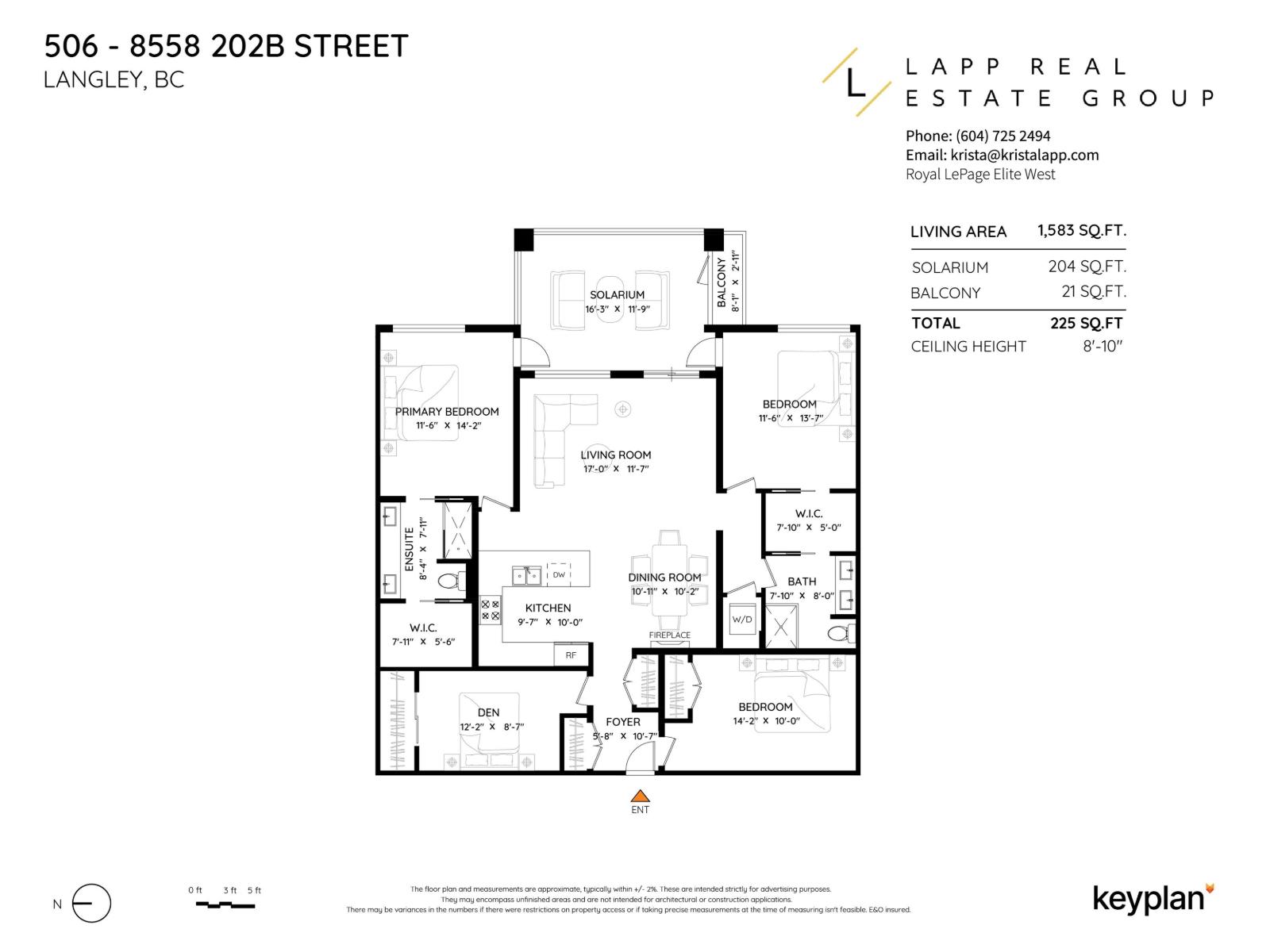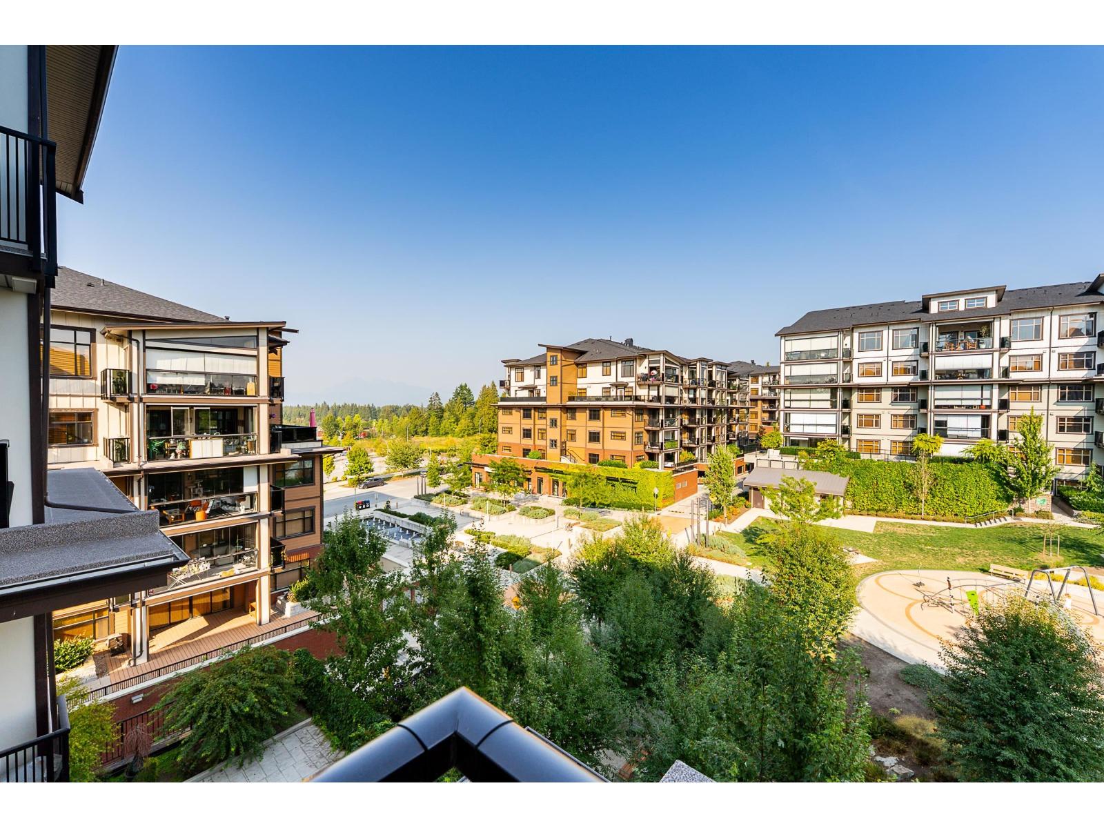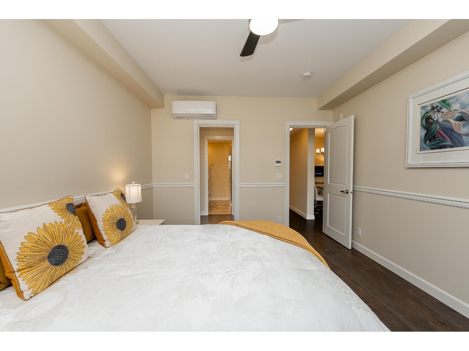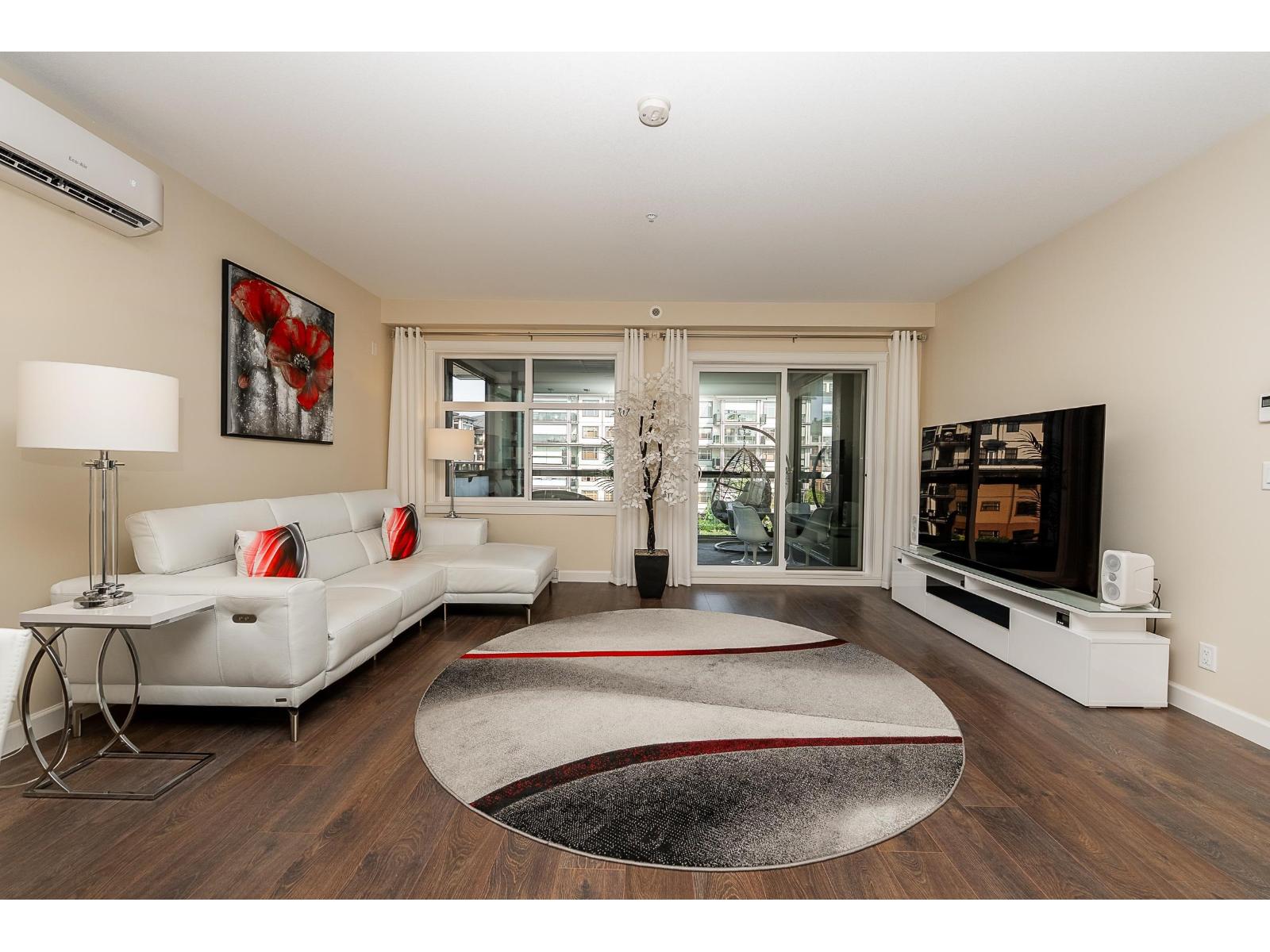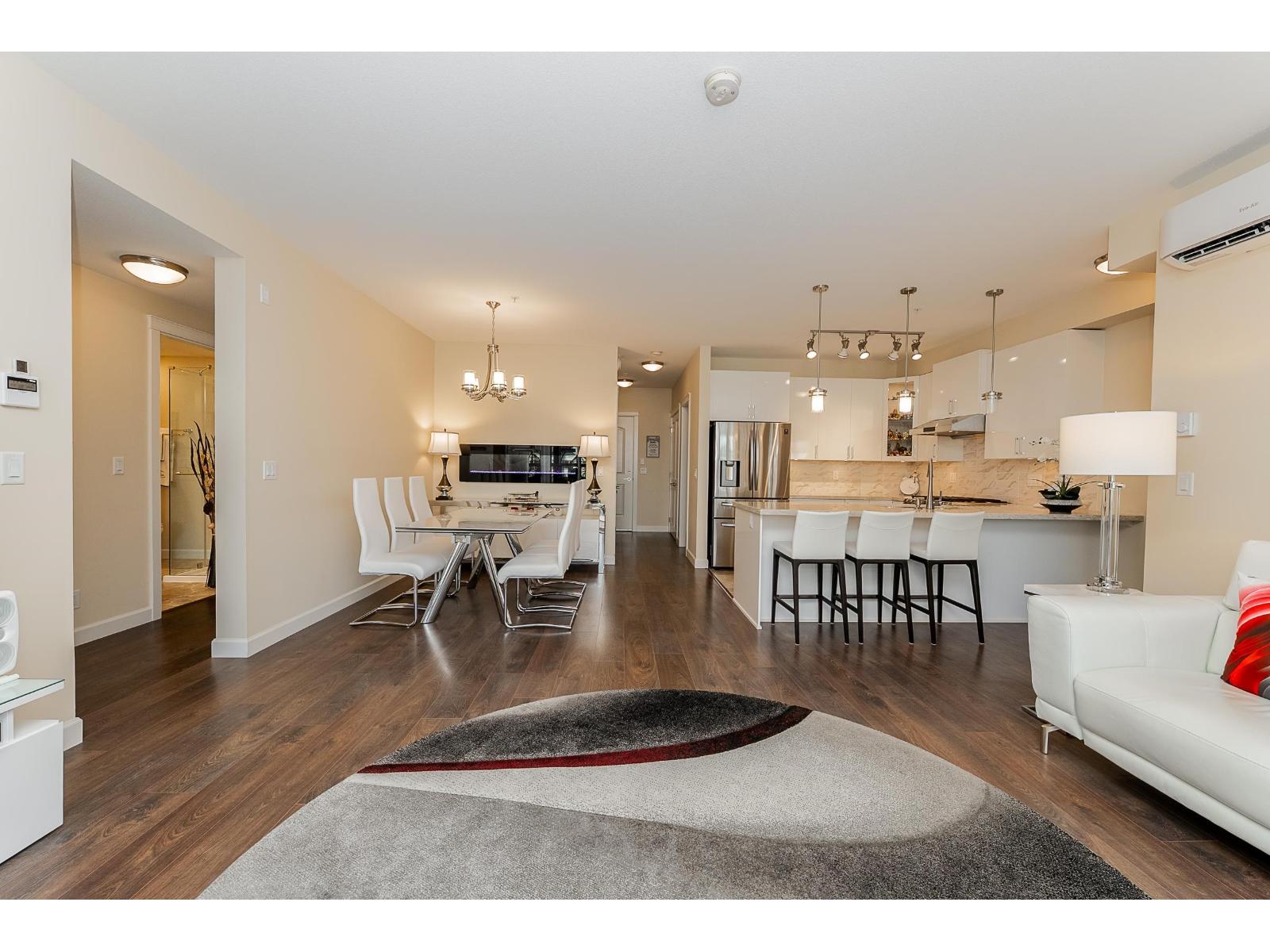 Immaculate and spacious East-facing 3 bedroom + den at sought-after Yorkson Park! Offering 1,583 sq ft of bright and air conditioned living space, plus a 225 sq ft solarium/balcony with retractable glass panels and courtyard views. The gourmet kitchen features a peninsula with seating, gas range and sleek cabinetry, seamlessly connecting to the dining and living area. Designed for year-round enjoyment, the solarium expands your living space. Generous bedrooms include two with luxurious ensuites, double vanities, frameless glass showers, walk-in closets, and access to the solarium. Added features include an energy-efficient heat pump with A/C, gas BBQ hookup, 2 parking stalls, and a storage locker. Conveniently located near Carvolth Exchange, shopping, restaurants, and quick highway access. (id:58403)