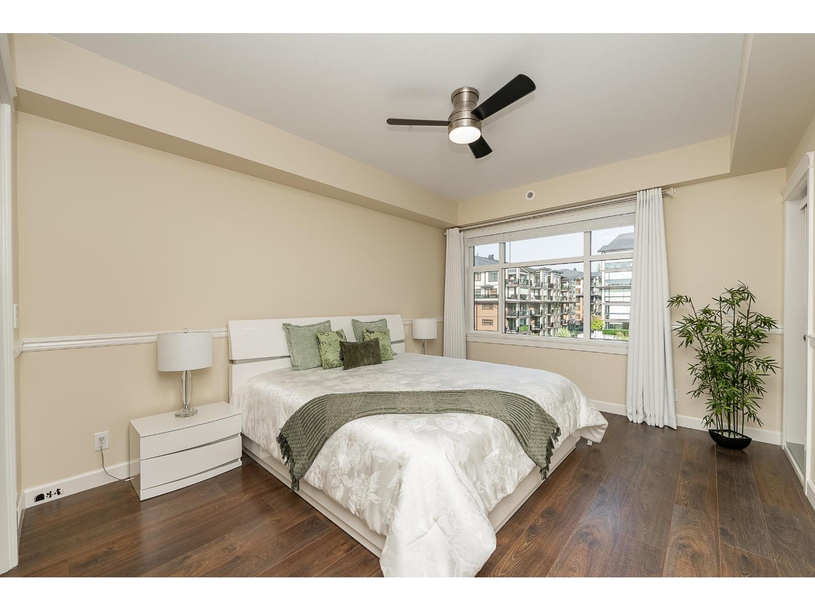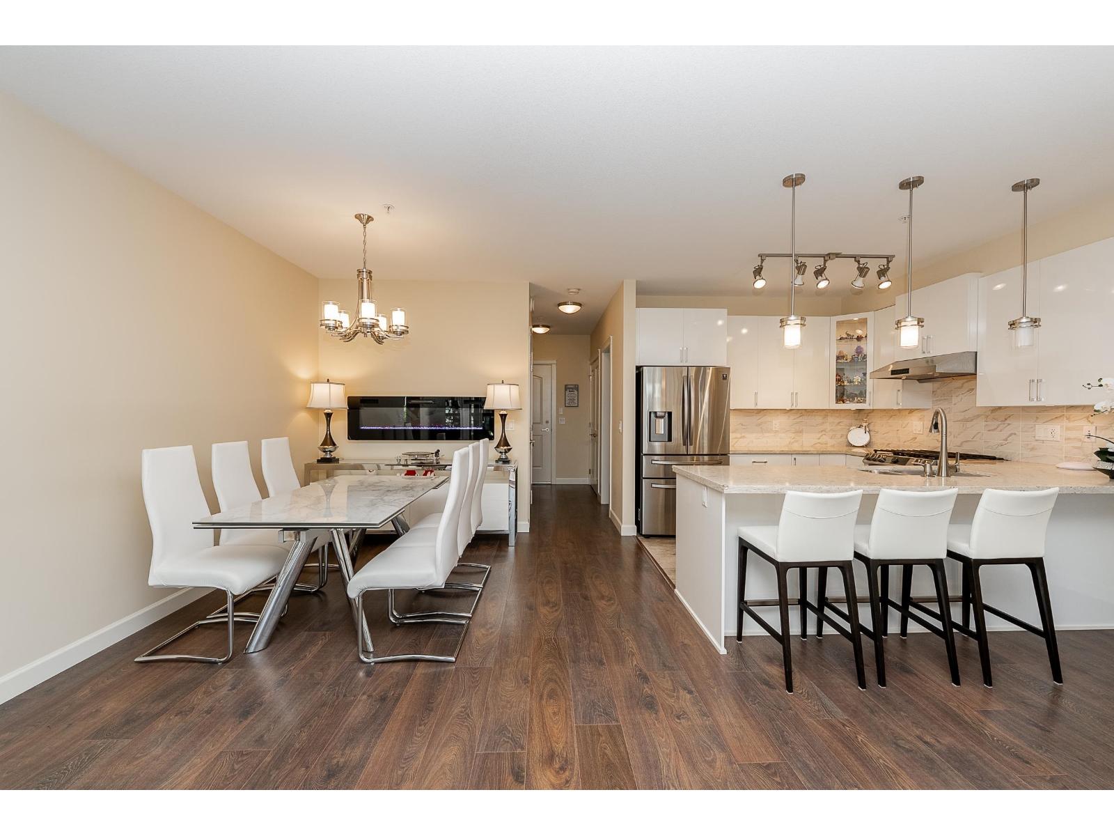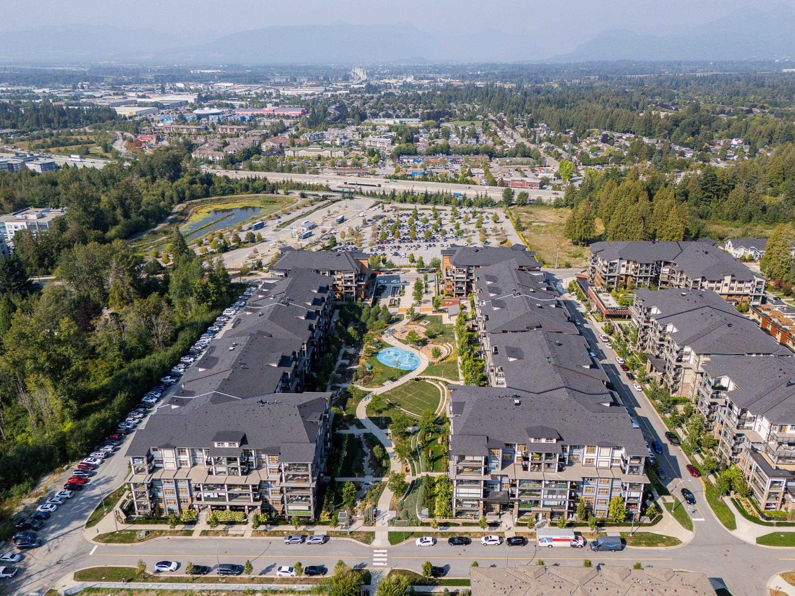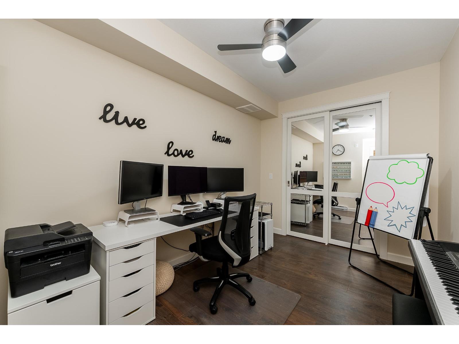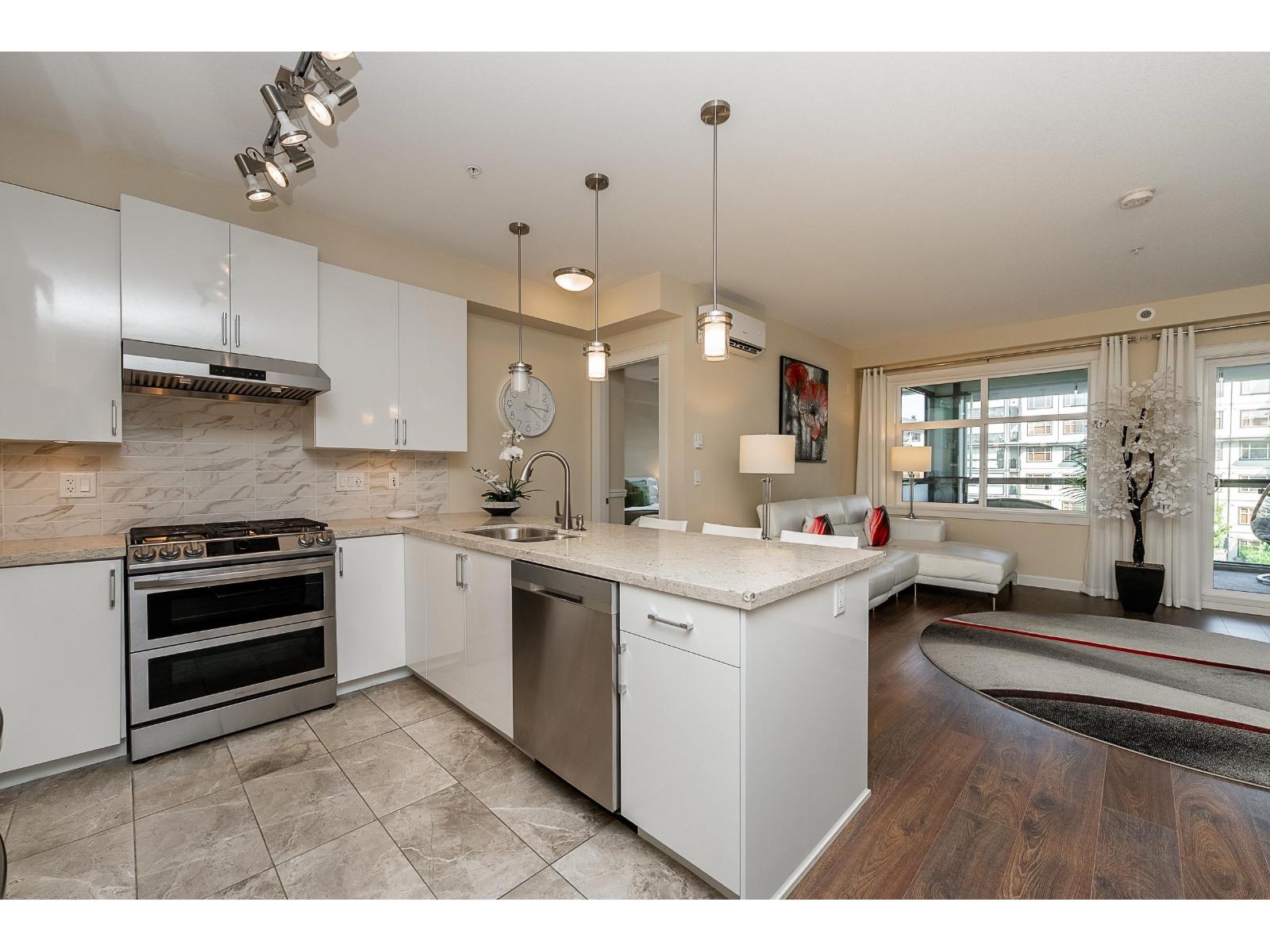 Immaculate and spacious East-facing 3 bedroom + den at sought-after Yorkson Park! Offering 1,583 sq ft of bright and air conditioned living space, plus a 225 sq ft solarium/balcony with retractable glass panels and courtyard views. The gourmet kitchen features a peninsula with seating, gas range and sleek cabinetry, seamlessly connecting to the dining and living area. Designed for year-round enjoyment, the solarium expands your living space. Generous bedrooms include two with luxurious ensuites, double vanities, frameless glass showers, walk-in closets, and access to the solarium. Added features include an energy-efficient heat pump with A/C, gas BBQ hookup, 2 parking stalls, and a storage locker. Conveniently located near Carvolth Exchange, shopping, restaurants, and quick highway access. (id:58403)