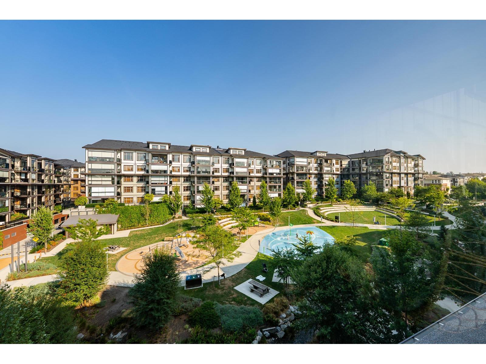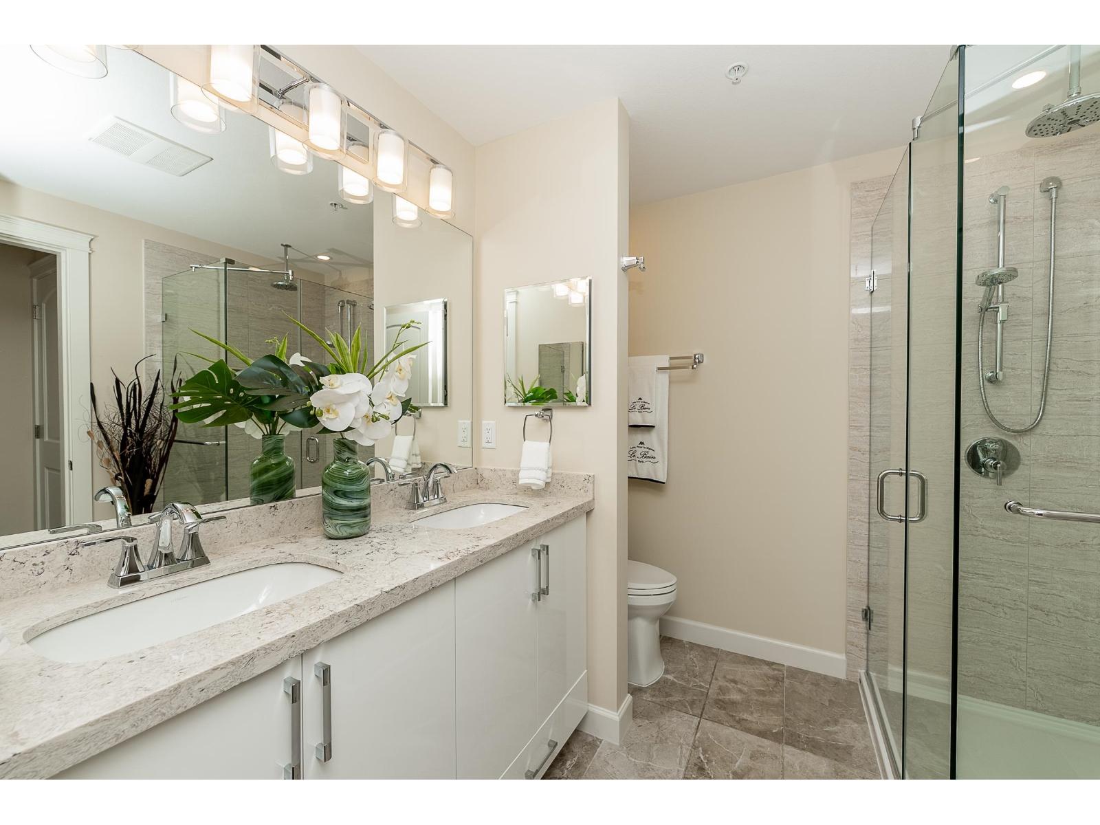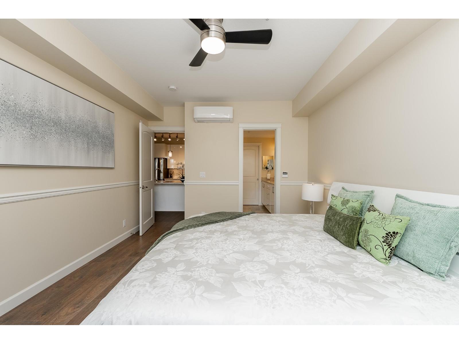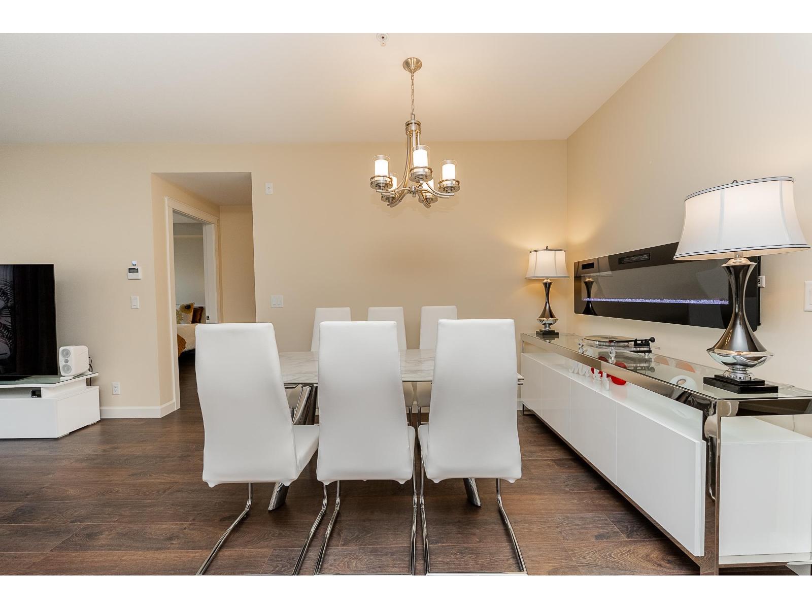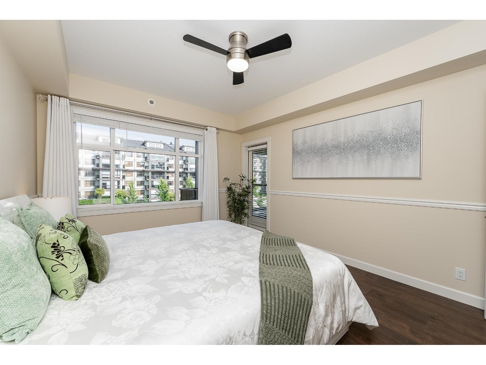 Immaculate and spacious East-facing 3 bedroom + den at sought-after Yorkson Park! Offering 1,583 sq ft of bright and air conditioned living space, plus a 225 sq ft solarium/balcony with retractable glass panels and courtyard views. The gourmet kitchen features a peninsula with seating, gas range and sleek cabinetry, seamlessly connecting to the dining and living area. Designed for year-round enjoyment, the solarium expands your living space. Generous bedrooms include two with luxurious ensuites, double vanities, frameless glass showers, walk-in closets, and access to the solarium. Added features include an energy-efficient heat pump with A/C, gas BBQ hookup, 2 parking stalls, and a storage locker. Conveniently located near Carvolth Exchange, shopping, restaurants, and quick highway access. (id:58403)