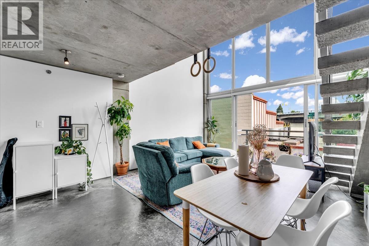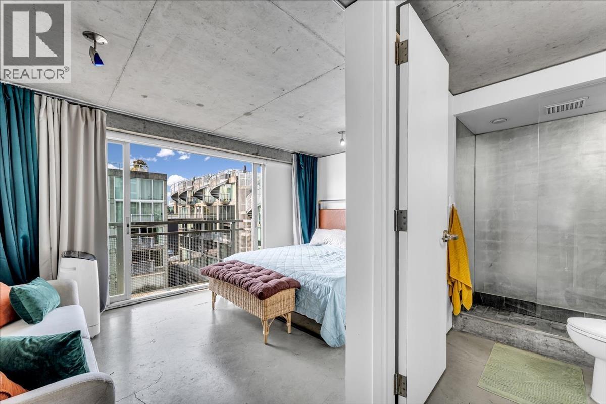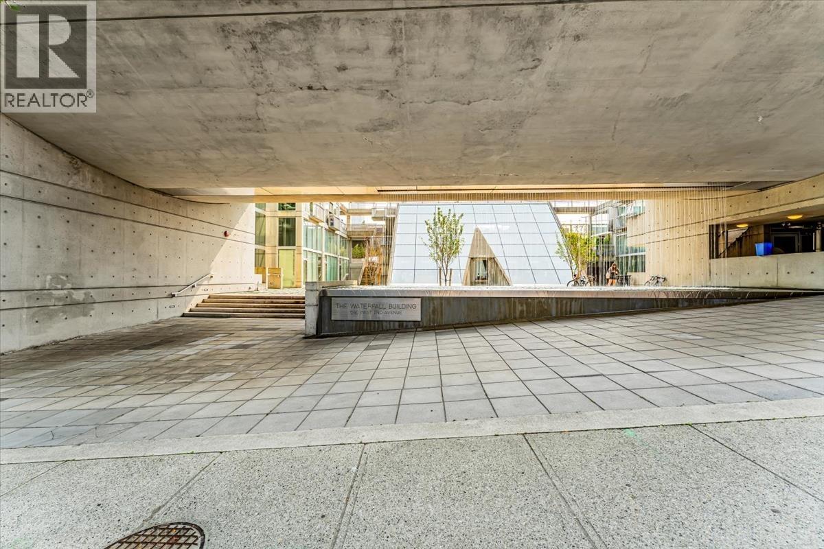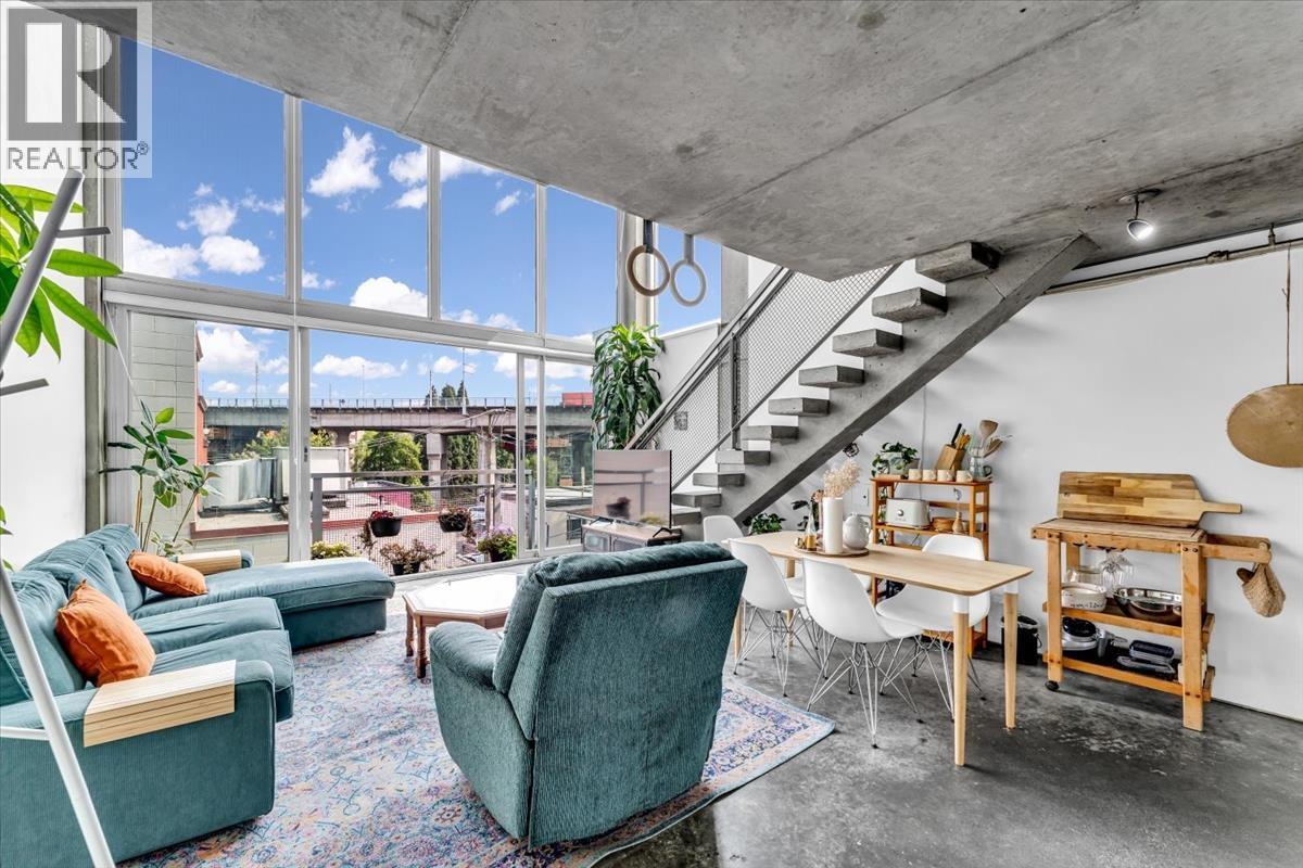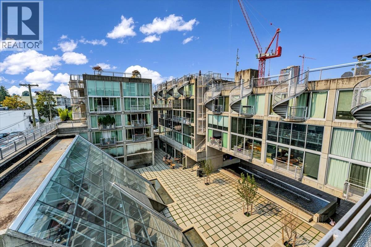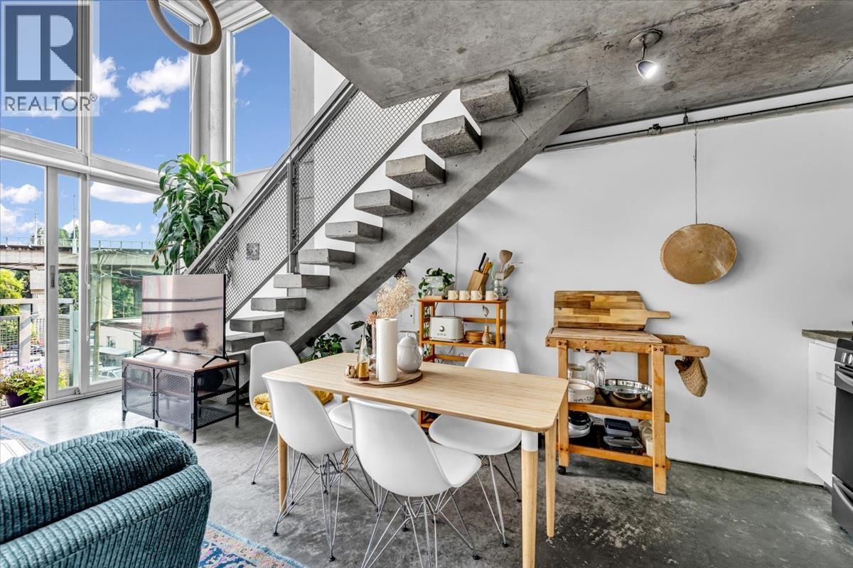 An architectural icon at the gateway to Granville Island-welcome to the award-winning Waterfall Building by Arthur Erickson. This one-bedroom loft with a spacious office/den (could be 2nd bedroom) features soaring 16´ ceilings, radiant heated concrete floors, exposed concrete walls, and a striking floating staircase. Juliet balconies on opposite ends create a refreshing cross-breeze, while floor-to-ceiling windows flood the home with natural light. Perfectly located just steps to Granville Island, W4th Ave and Granville shops. Zoned C-2B for live/work use. Includes one parking and one storage. (id:58403)