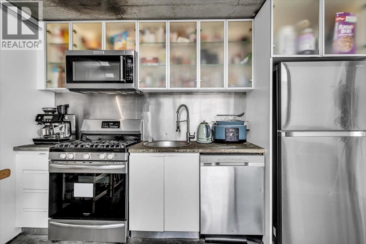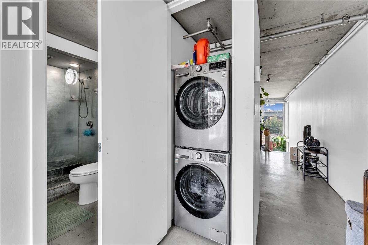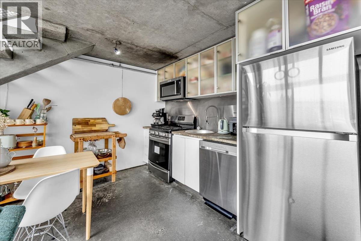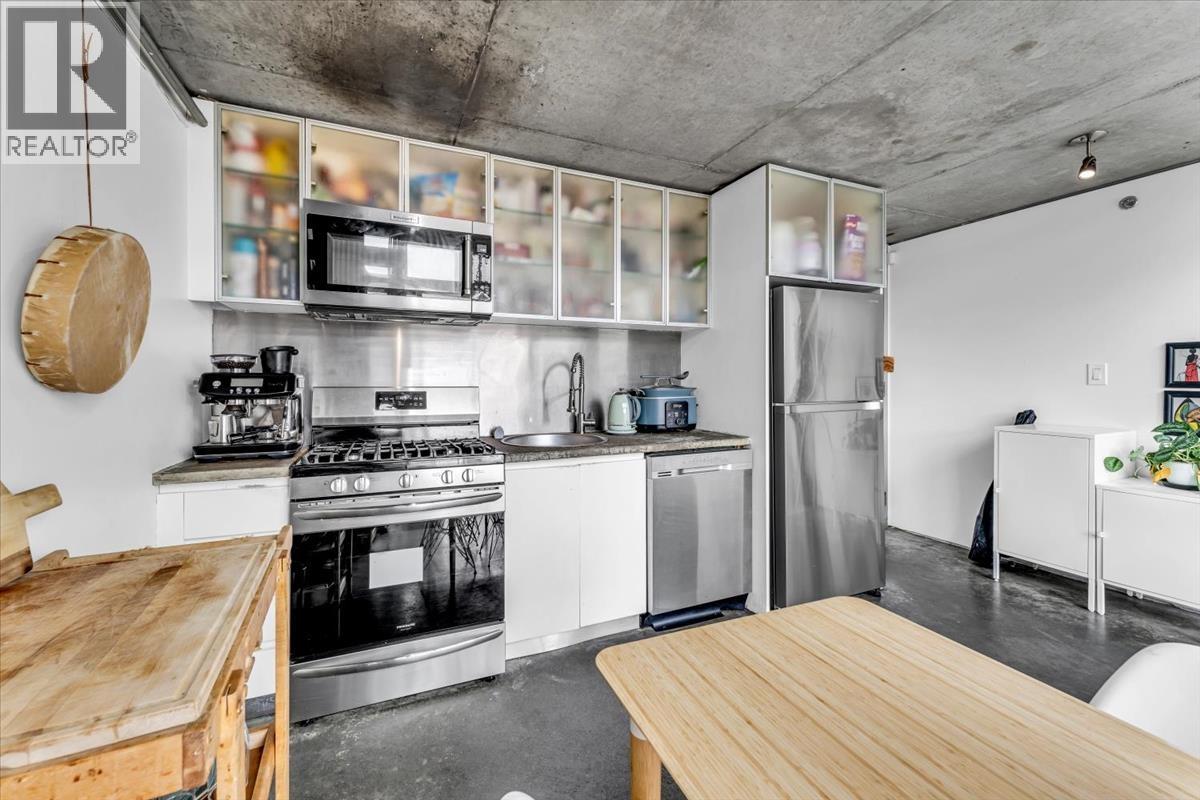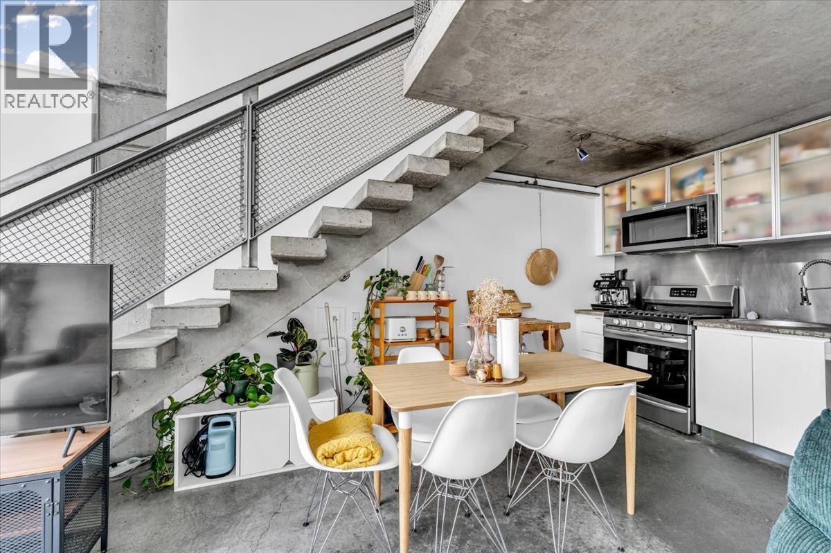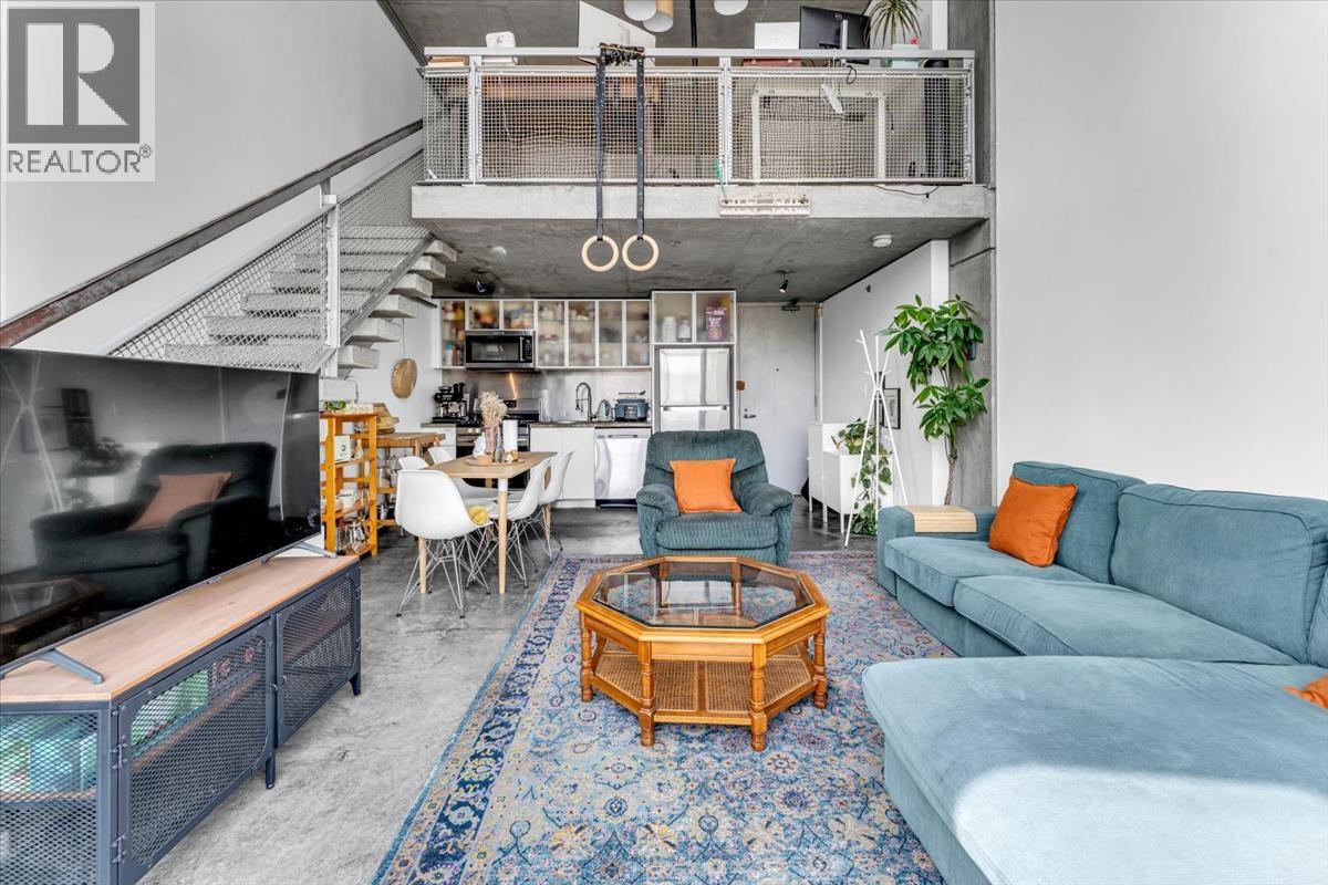 An architectural icon at the gateway to Granville Island-welcome to the award-winning Waterfall Building by Arthur Erickson. This one-bedroom loft with a spacious office/den (could be 2nd bedroom) features soaring 16´ ceilings, radiant heated concrete floors, exposed concrete walls, and a striking floating staircase. Juliet balconies on opposite ends create a refreshing cross-breeze, while floor-to-ceiling windows flood the home with natural light. Perfectly located just steps to Granville Island, W4th Ave and Granville shops. Zoned C-2B for live/work use. Includes one parking and one storage. (id:58403)