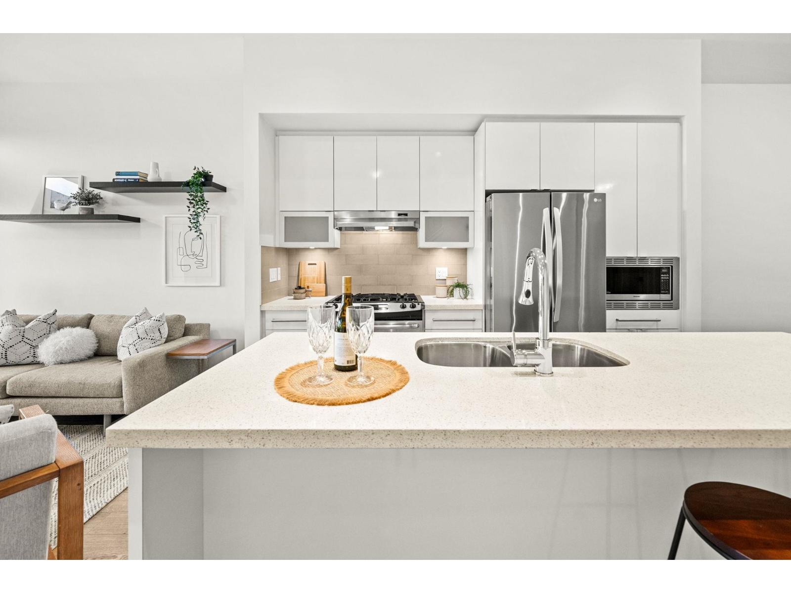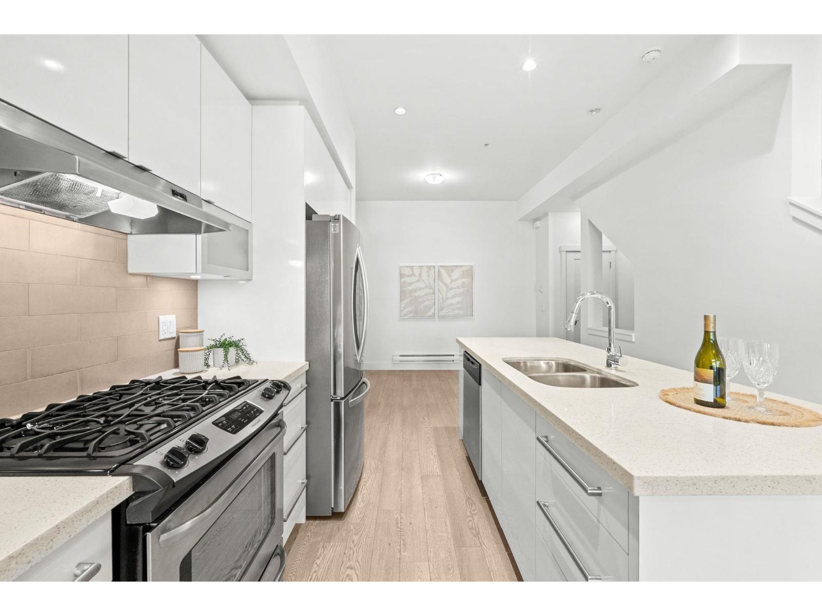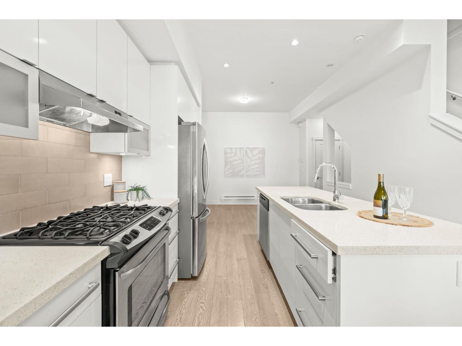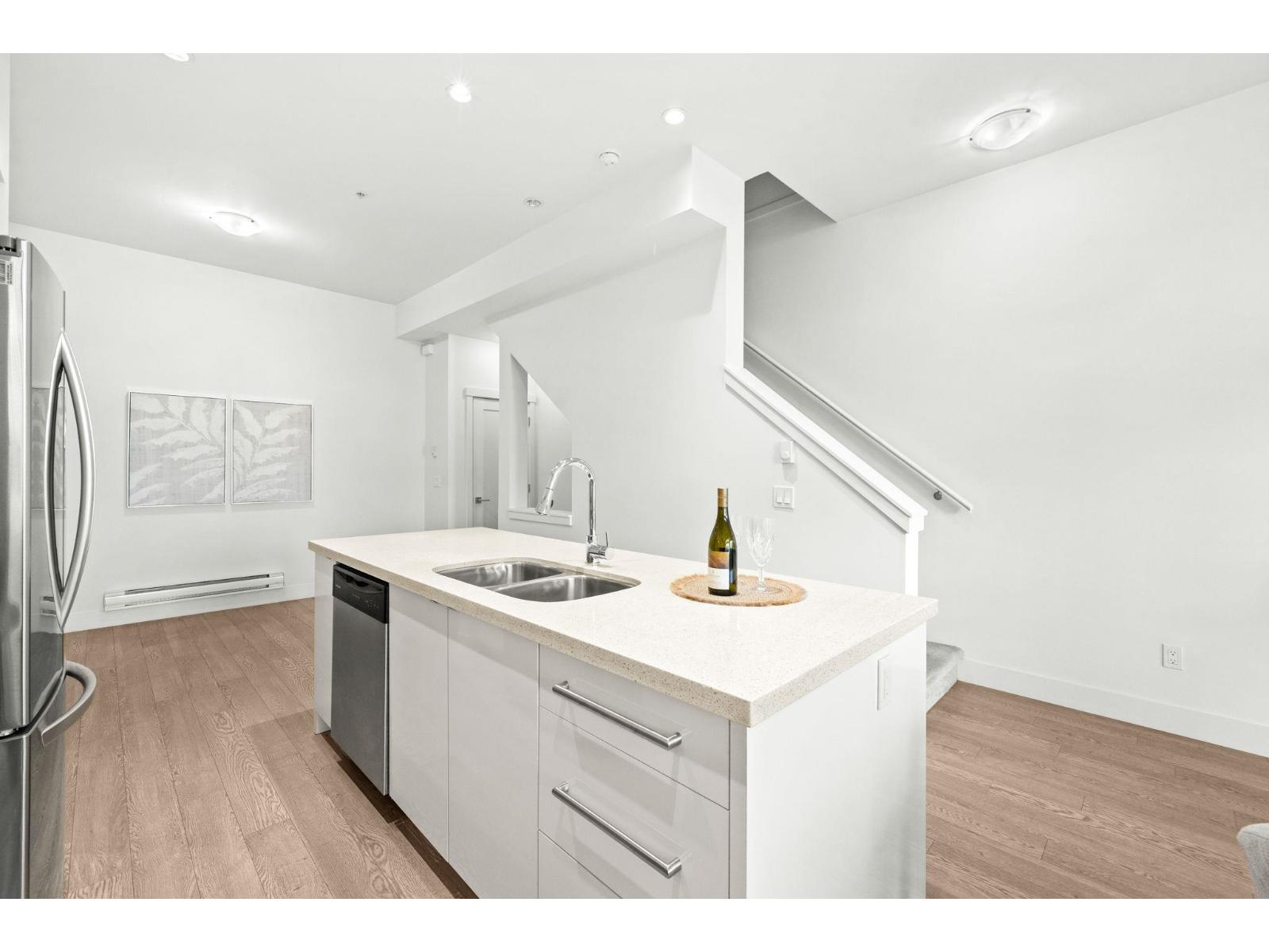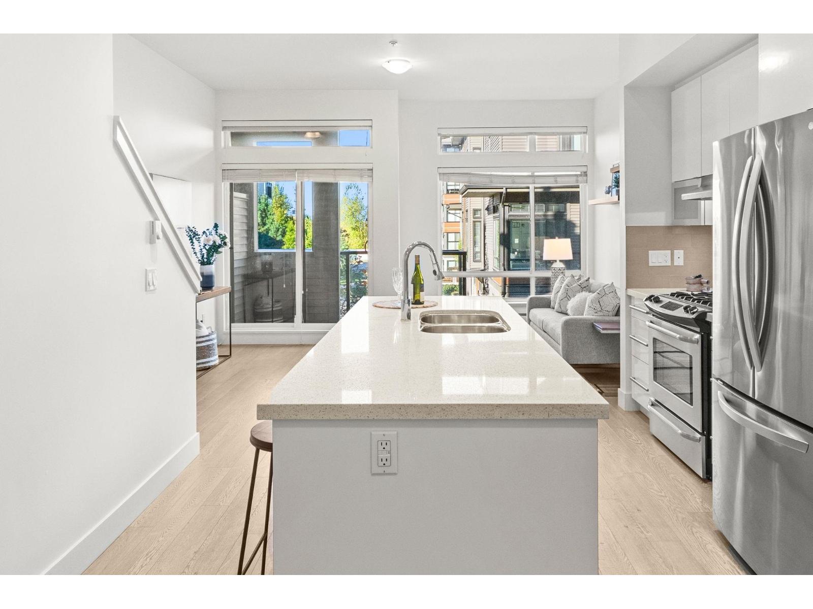 Located in the heart of Willoughby, this 2 bed, 2 bath townhouse features an incredible 500 SF private rooftop patio with gas and TV hookups-perfect for entertaining, relaxing, or soaking up the sun! It offers a bright open concept layout, stainless steel appliances, a spacious kitchen with ample storage, and large windows for great natural light. The primary bedroom includes a walk-in closet and private ensuite. Both bedrooms are generously sized. Single car garage plus covered carport-2 parking total. One of the best locations in the complex with no neighbour in front. Close to schools, Willoughby Town Centre, Costco, T&T, restaurants, and Hwy 1. (id:58403)