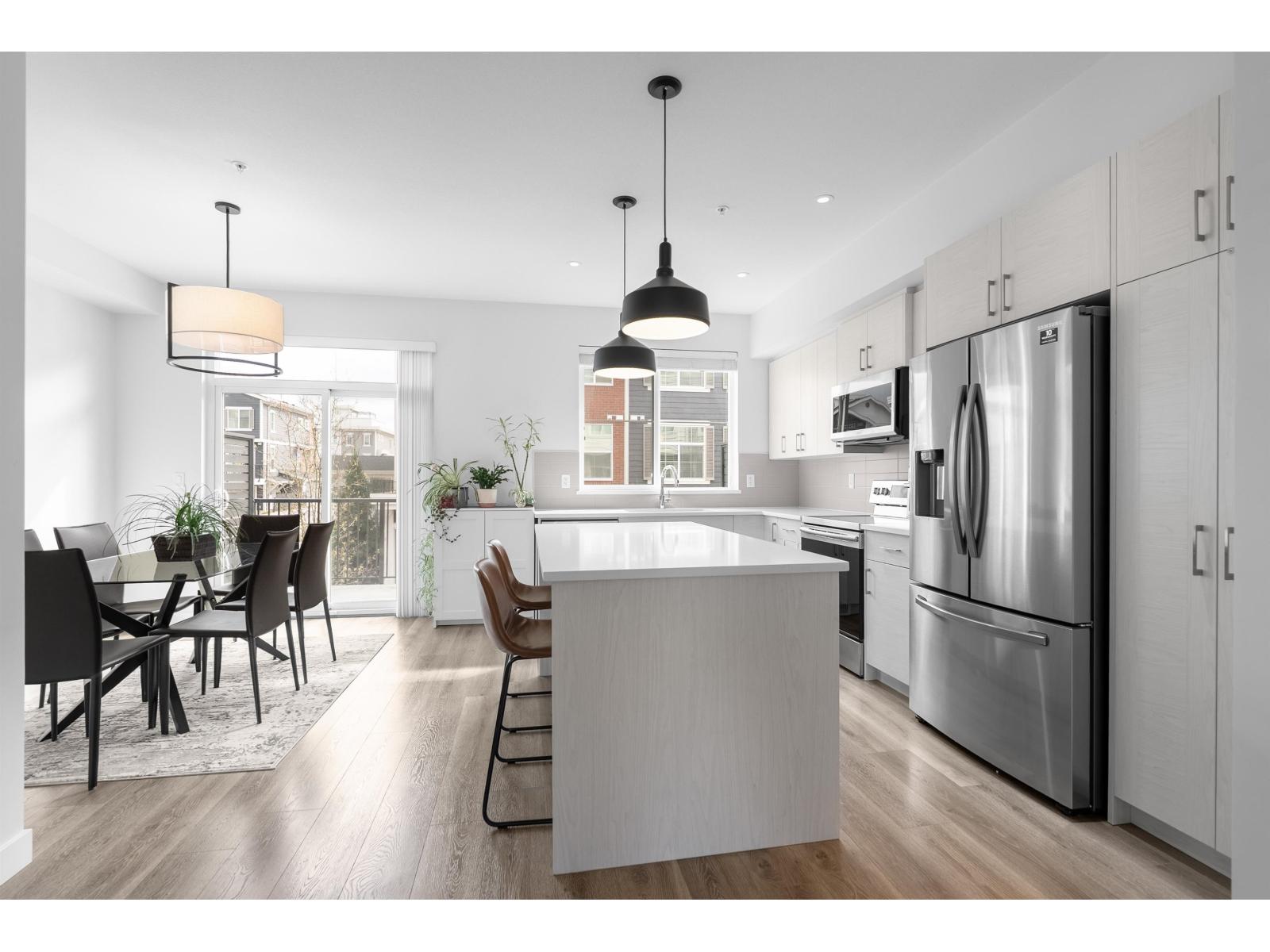 Welcome to Kensington Lofts by VESTA, one of the most SOUGHT AFTER communities in Willoughby Heights. This spacious 4 bed/3 bath townhome offers OVER 1,700 sq ft of bright, open-concept living plus more than 500 sq ft of outdoor space. Main floor features 9' ceilings, oversized windows & laminate flooring, along with a gourmet kitchen complete with stainless steel appliances, quartz countertops, electric range, and a large deck off the dining area. Up features an EXTRA SPACIOUS primary suite with high ceilings, walk-in closet, and deluxe ensuite. The FOURTH BEDROOM below is ideal for a growing family or a home office. Enjoy SUNSET VIEWS from your PRIVATE ROOFTOP PATIO. DOUBLE side-by-side garage plus driveway parking. Walking distance to Latimer Village shops, restaurants, parks & trails. (id:58403)