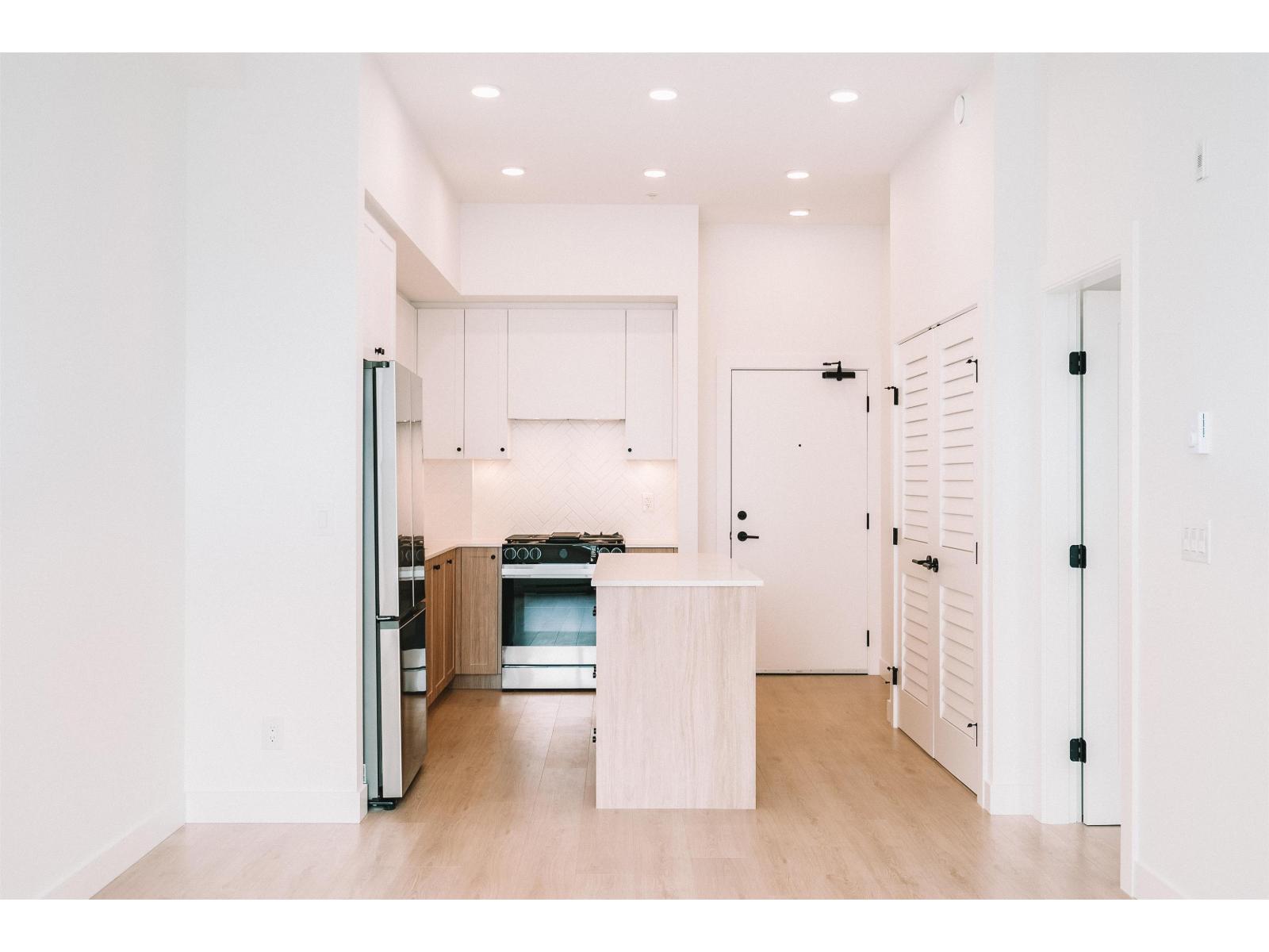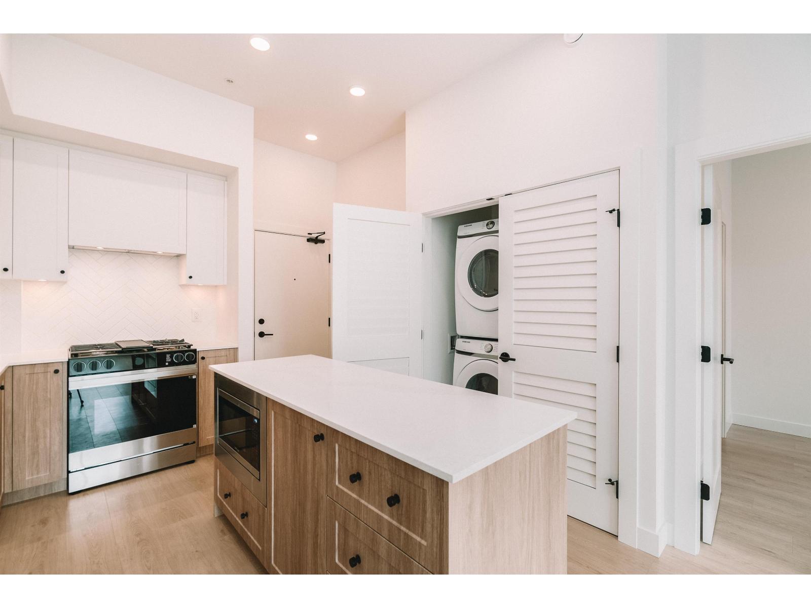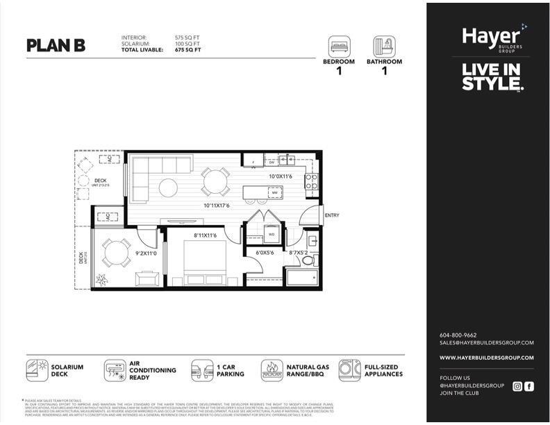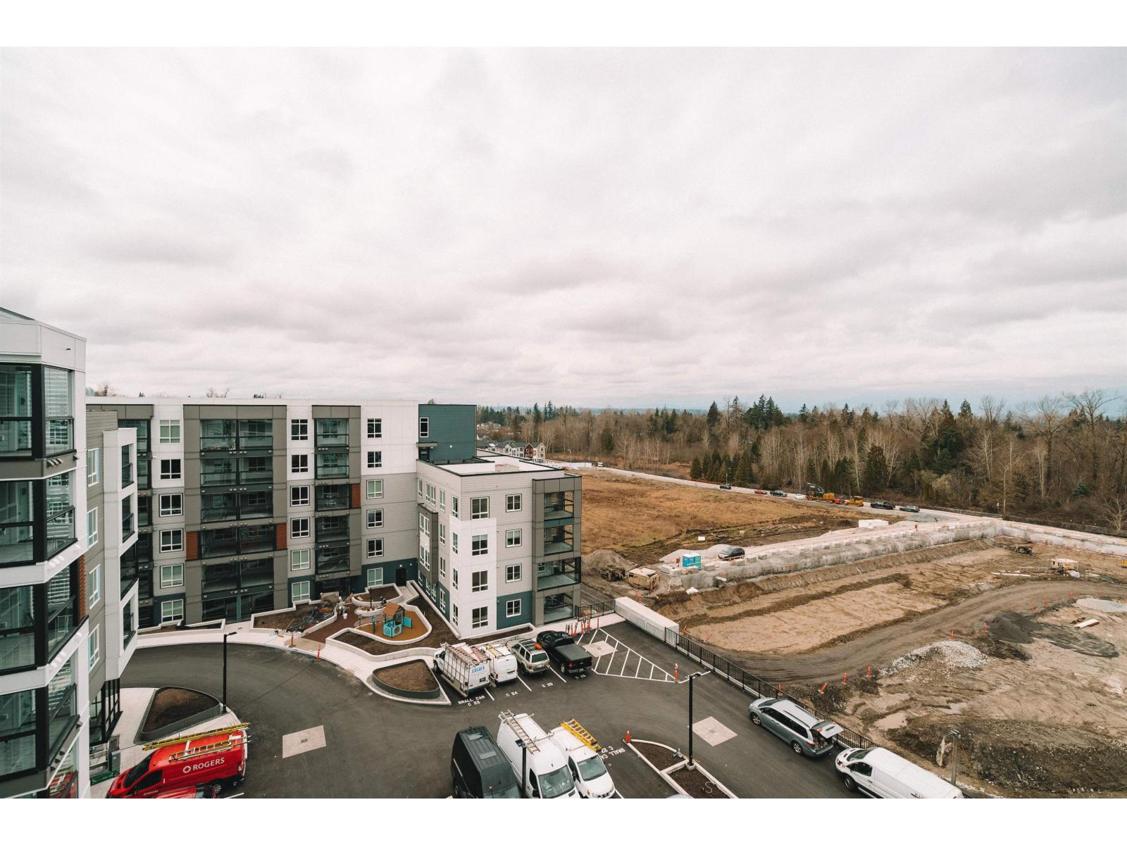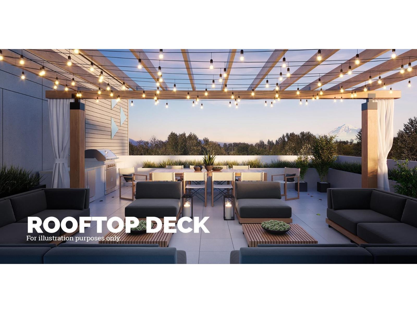 Welcome to HAYER TOWN CENTER, a master-plan community by the popular HAYER Builders Group. This BRAND NEW West facing premium 1 bedroom 1 bath PENTHOUSE unit offers a spacious open plan, laminate flooring throughout, 10' ceilings, spa-inspired bathroom & 100 sqft all season solarium deck with retractable glass, gas hook up & A/C roughed in hook up. The kitchen feat. a huge island, shaker cabinets, herringbone tile backsplash, natural gas range, quartz countertops, full-size S/S appliances & integrated dishwasher panel. Amenities incl. a rooftop deck, games room, fully-fenced dog park, hotel inspired lobby, 24 hr. concierge & Langley's first vertical garden. The Convenience Of Over 35,000 sqft of commercial retail shops & services. UNIT INCLUDES 1 EV Rough-In Parking & 1 Storage Locker. (id:58403)