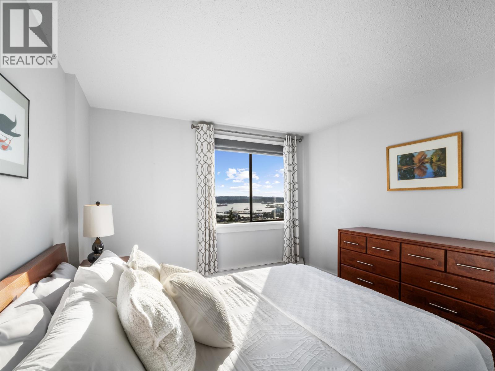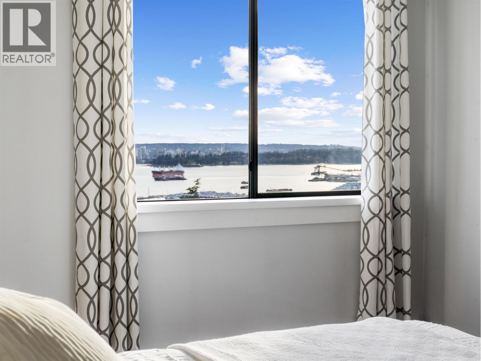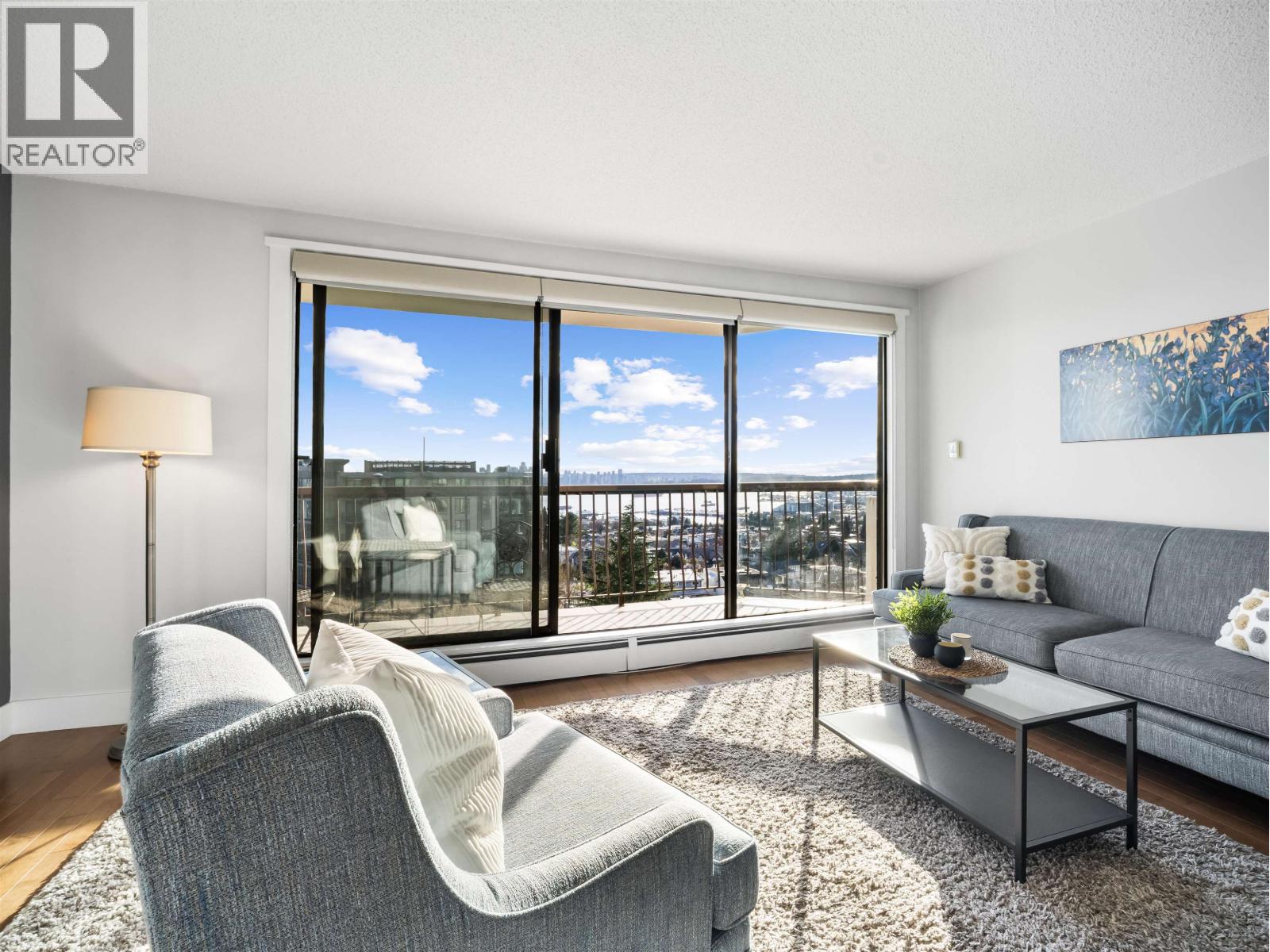 Sweeping water, Victoria Park, and Lions Gate view! This spacious 1BR condo has 678 sf with a bright living room that leads to a balcony with a south west exposure. Spend your evenings watching every gorgeous sunset with unobstructed western views. The living area has hardwood floors and leads to a dining area featuring built in cabinetry for extra storage. The kitchen features granite countertops, wood cabinets and stainless steel appliances. With room for larger furniture, the bedroom is a true sanctuary with a city view. This impeccably cared for suite has an updated bathroom, 1 parking and 1 storage locker. This great building has a rooftop deck with 360 degree views, EV capability, bike cage rental all steps to vibrant Lower Lonsdale. One small pet welcome! (id:58403)