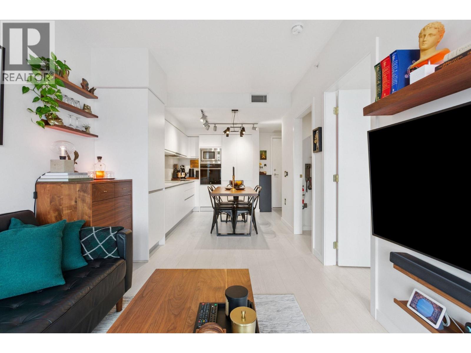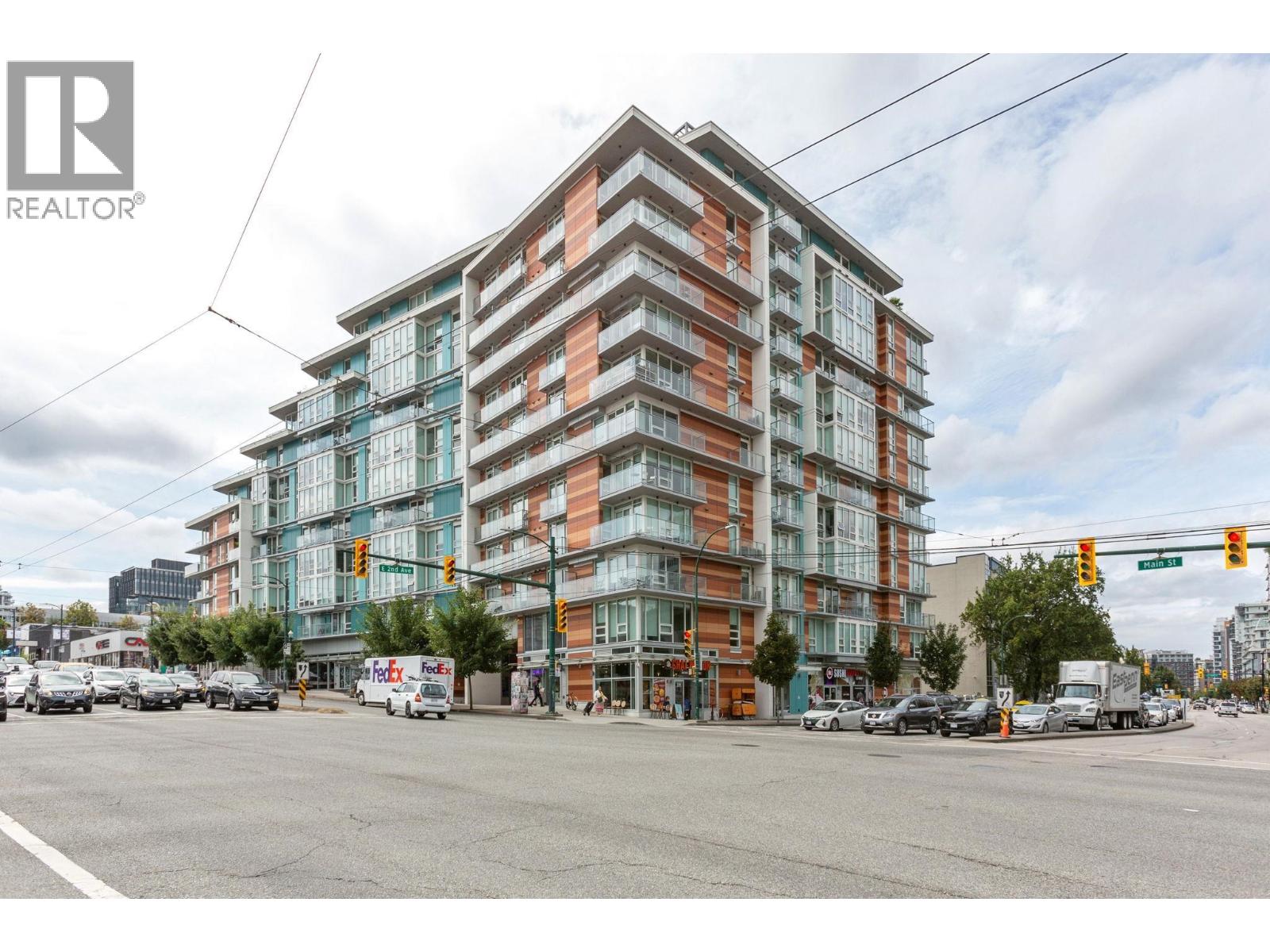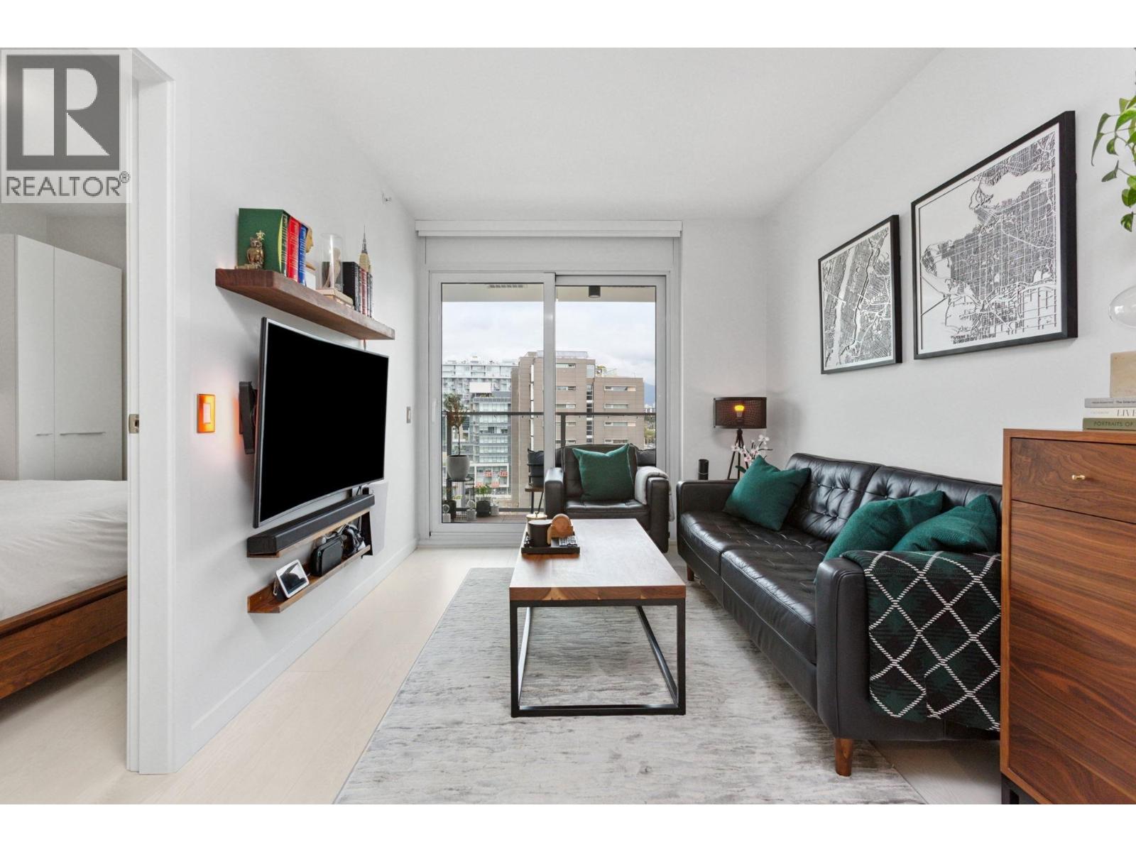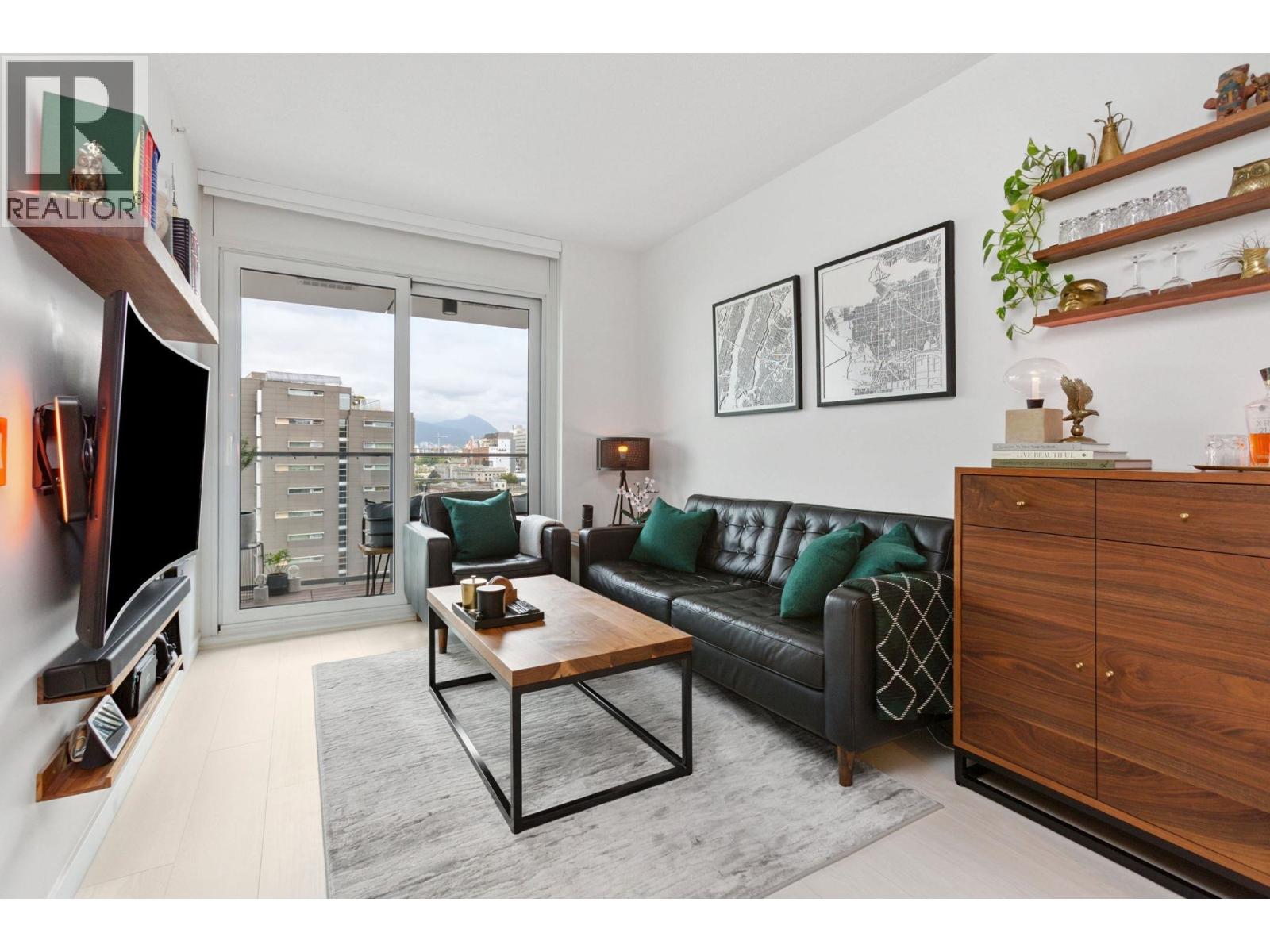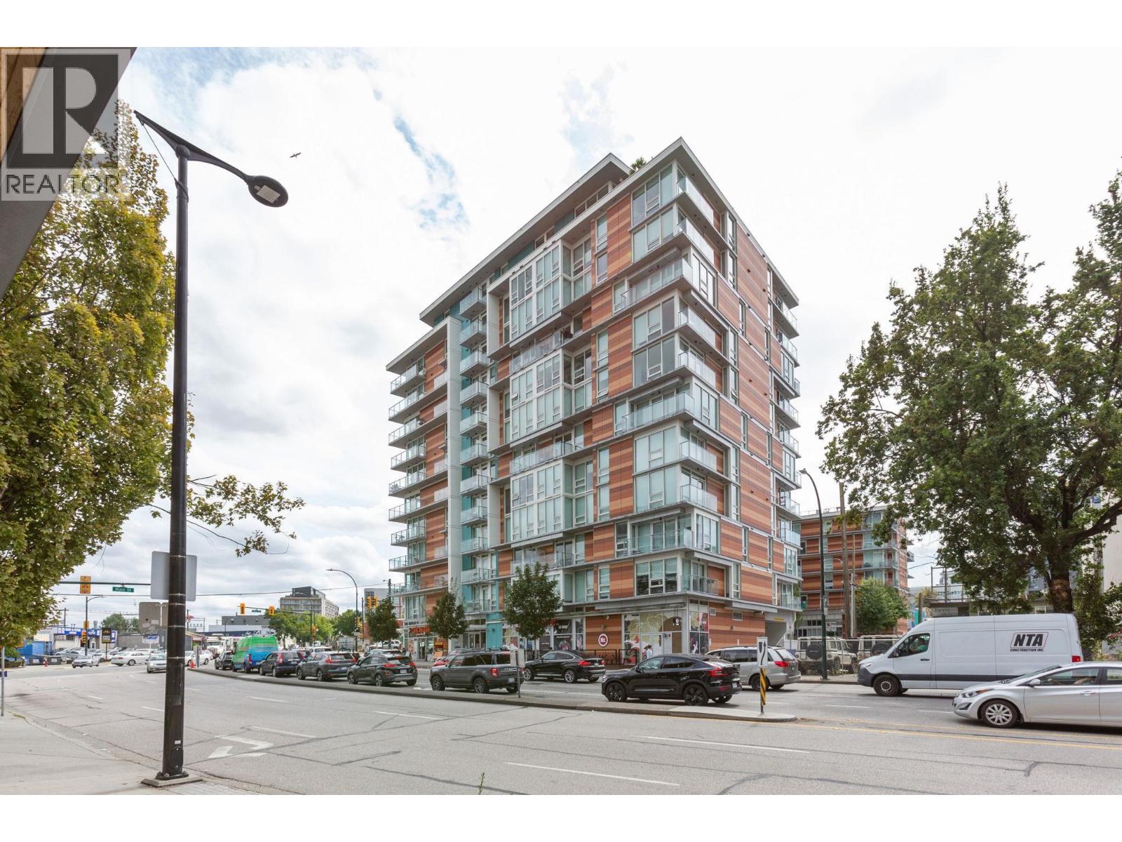 Super functional and bright 1 bed & den in a nearly new air-conditioned boutique building in Mount Pleasant/Olympic Village with city and mountain views! The sleek kitchen is equipped with integrated Liebherr/Porter&Charles appliances, stone counters and plenty of storage space, flowing on durable laminate flooring into the living room & covered balcony. The spacious bedroom features custom built-ins & large window inviting exciting city lights. This meticulously maintained home features roller blinds and many thoughtful upgrades throughout. Building amenities include a fitness centre, party room and rooftop deck with BBQ, dining areas, lounges & garden plots. Steps to SkyTrain, breweries, SeaWall, community centre, shopping, cafes & Emily Carr. (id:58403)